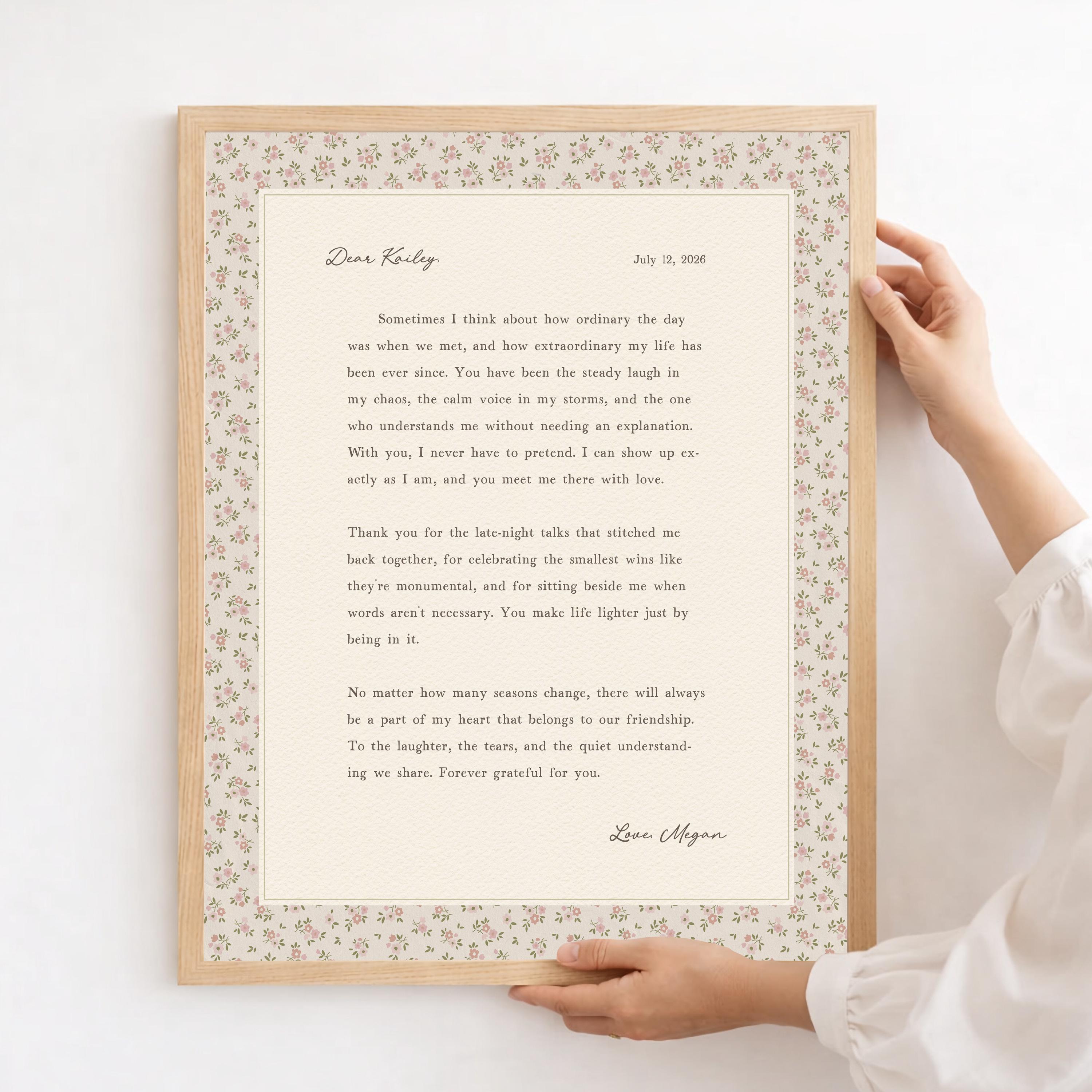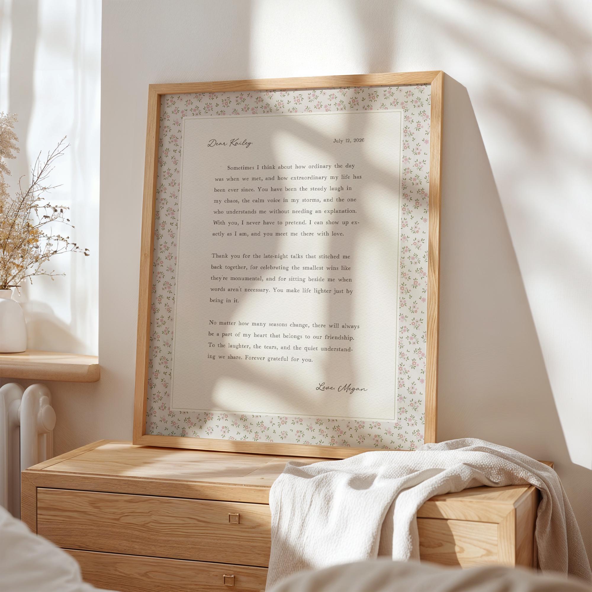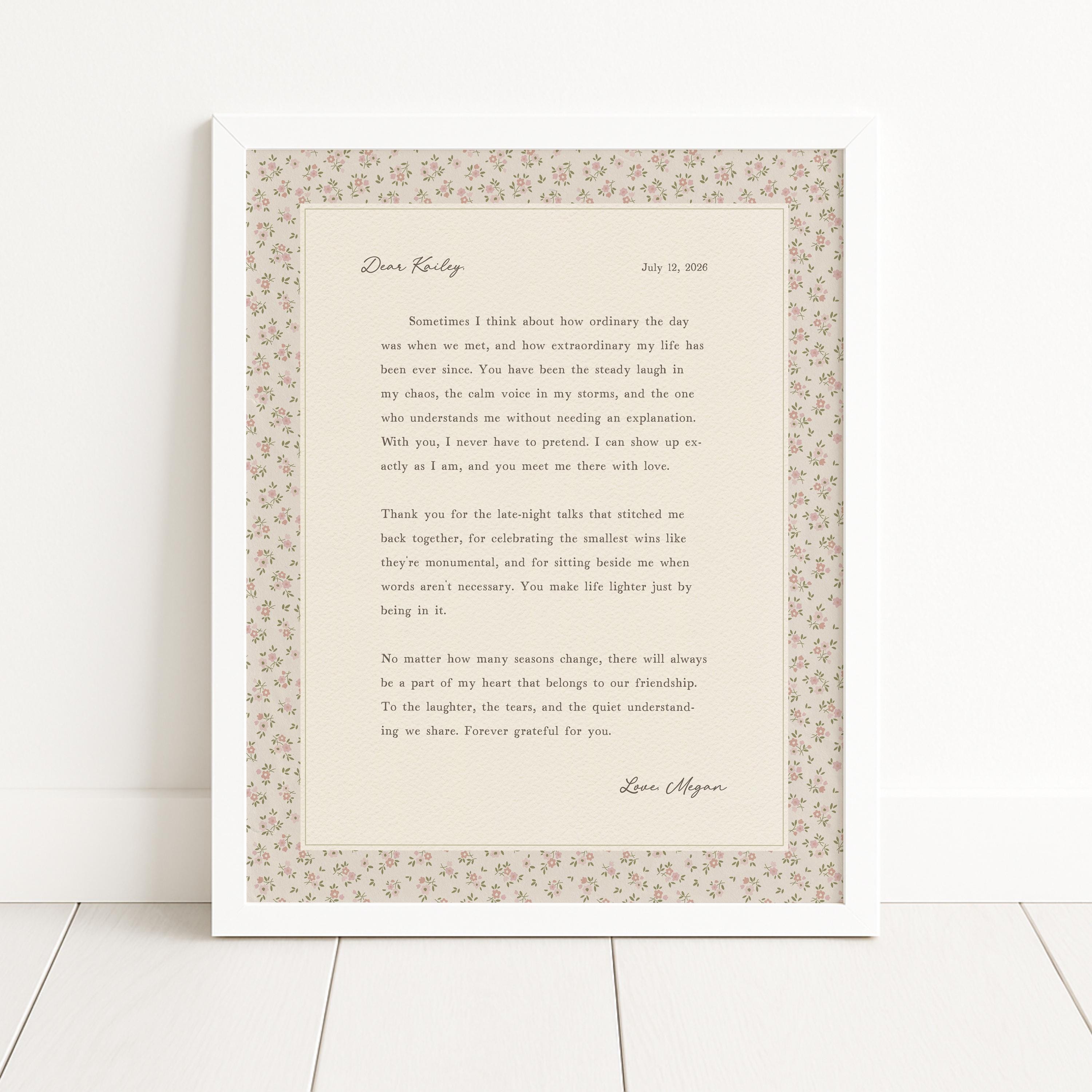 Custom friendship letter print. A heartfelt personalized letter designed to celebrate your most meaningful friendships. Whether it’s your best friend, maid of honor, sister, or long-distance soul sister, this custom message wall art transforms your words into a timeless keepsake. Choose your own words or keep the message as shown. It's up to you!