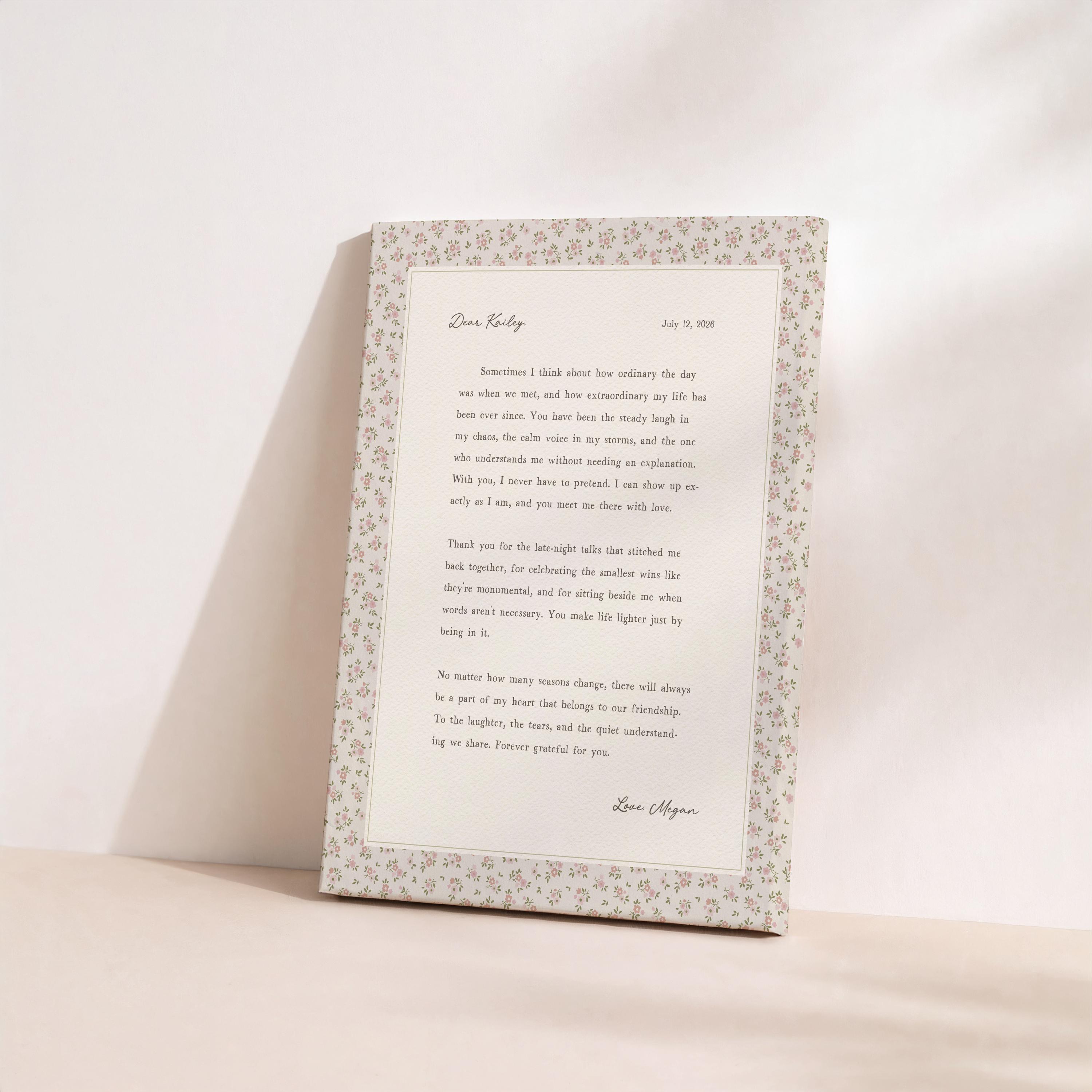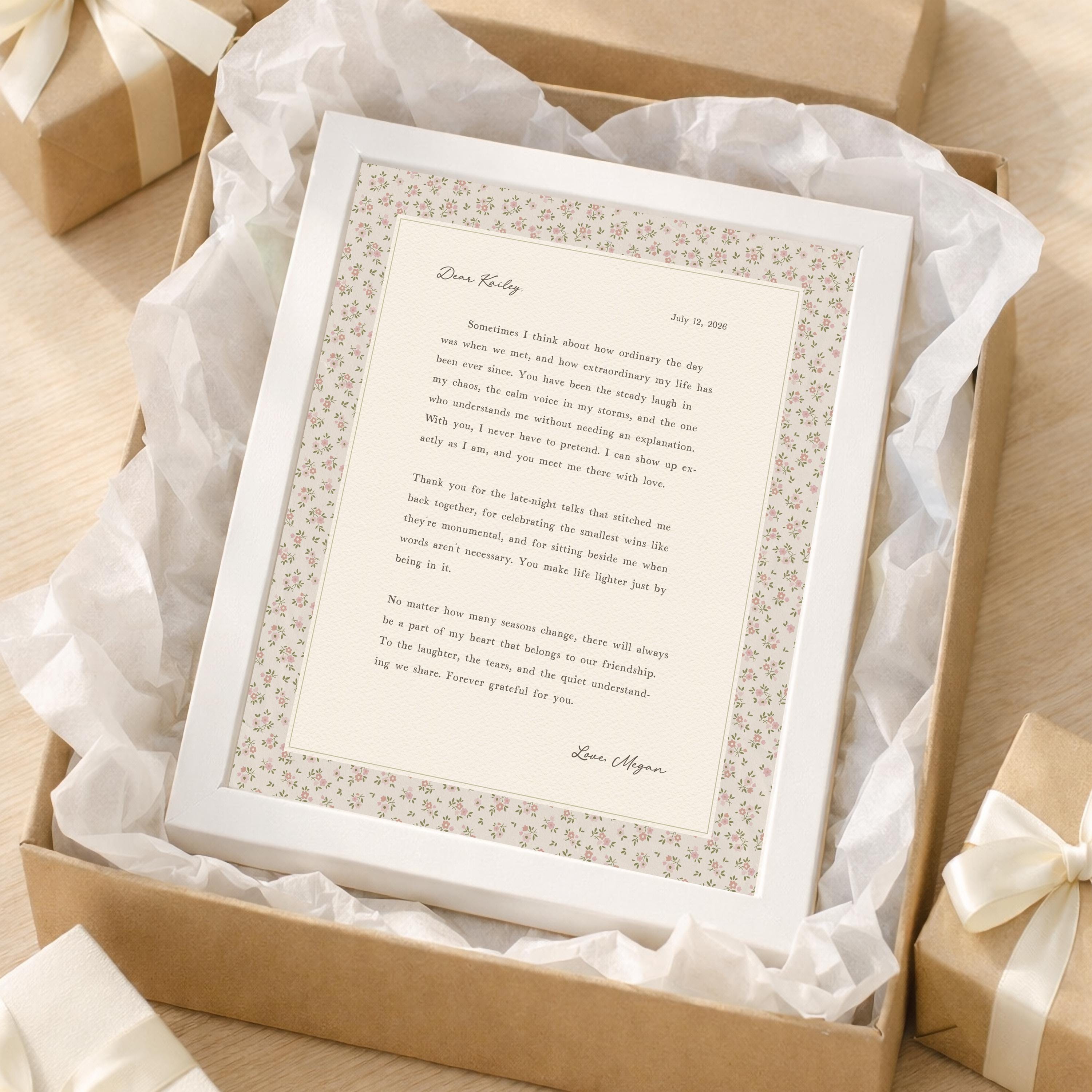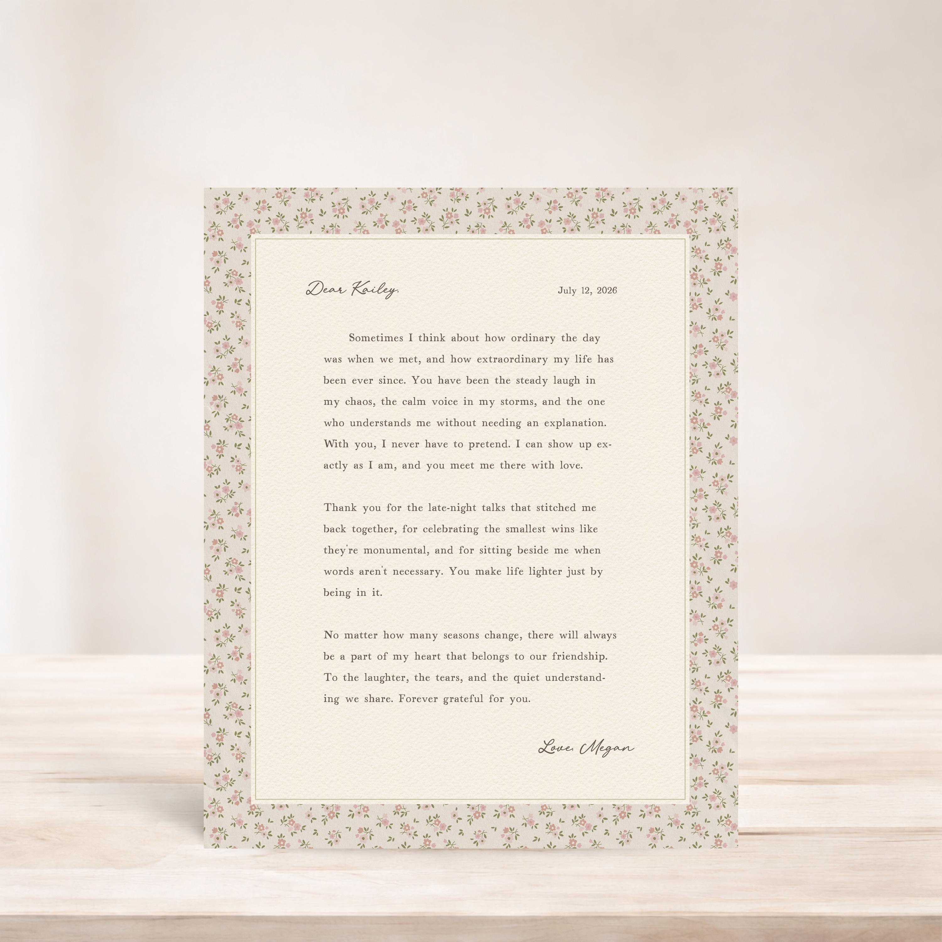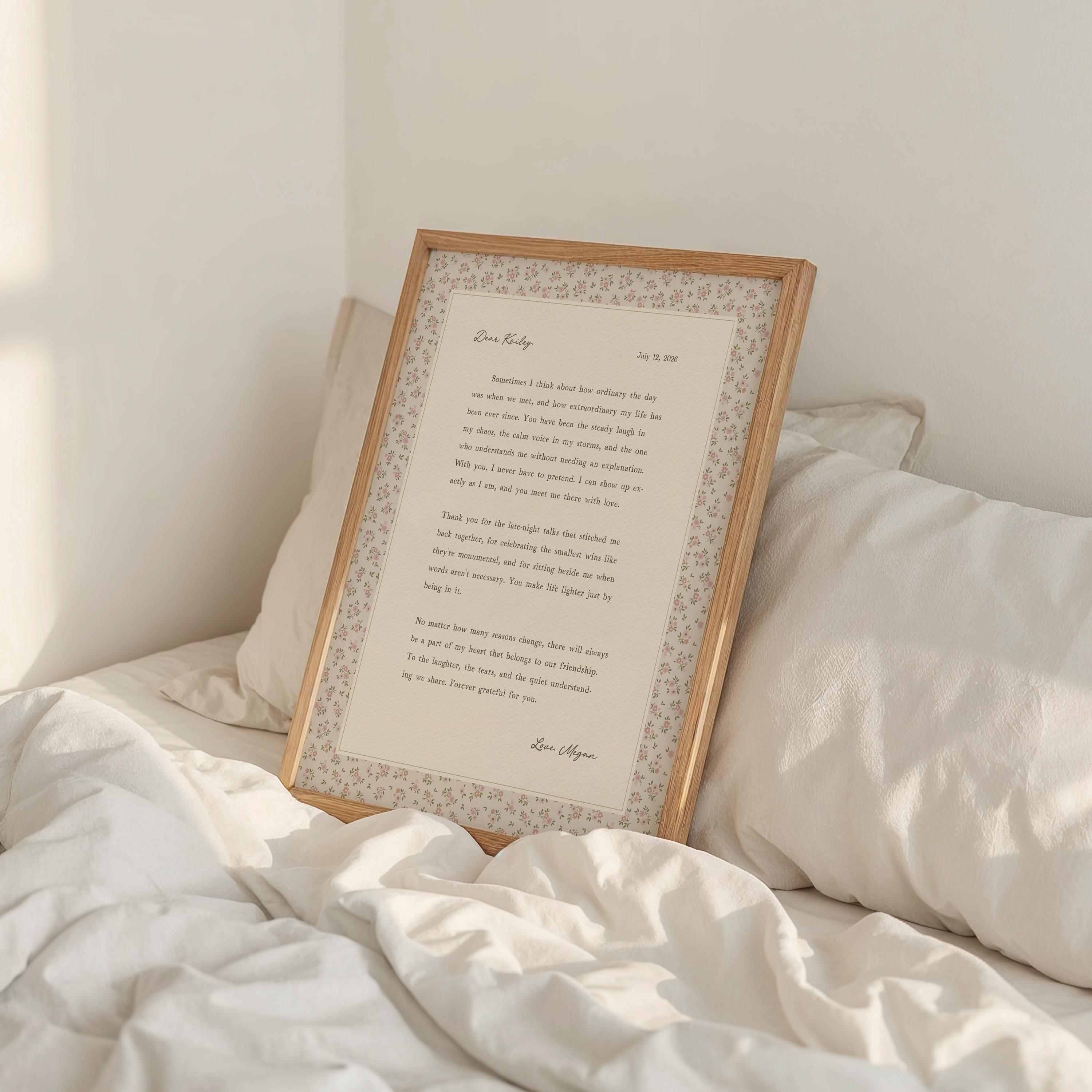 Custom friendship letter print. A heartfelt personalized letter designed to celebrate your most meaningful friendships. Whether it’s your best friend, maid of honor, sister, or long-distance soul sister, this custom message wall art transforms your words into a timeless keepsake. Choose your own words or keep the message as shown. It's up to you!