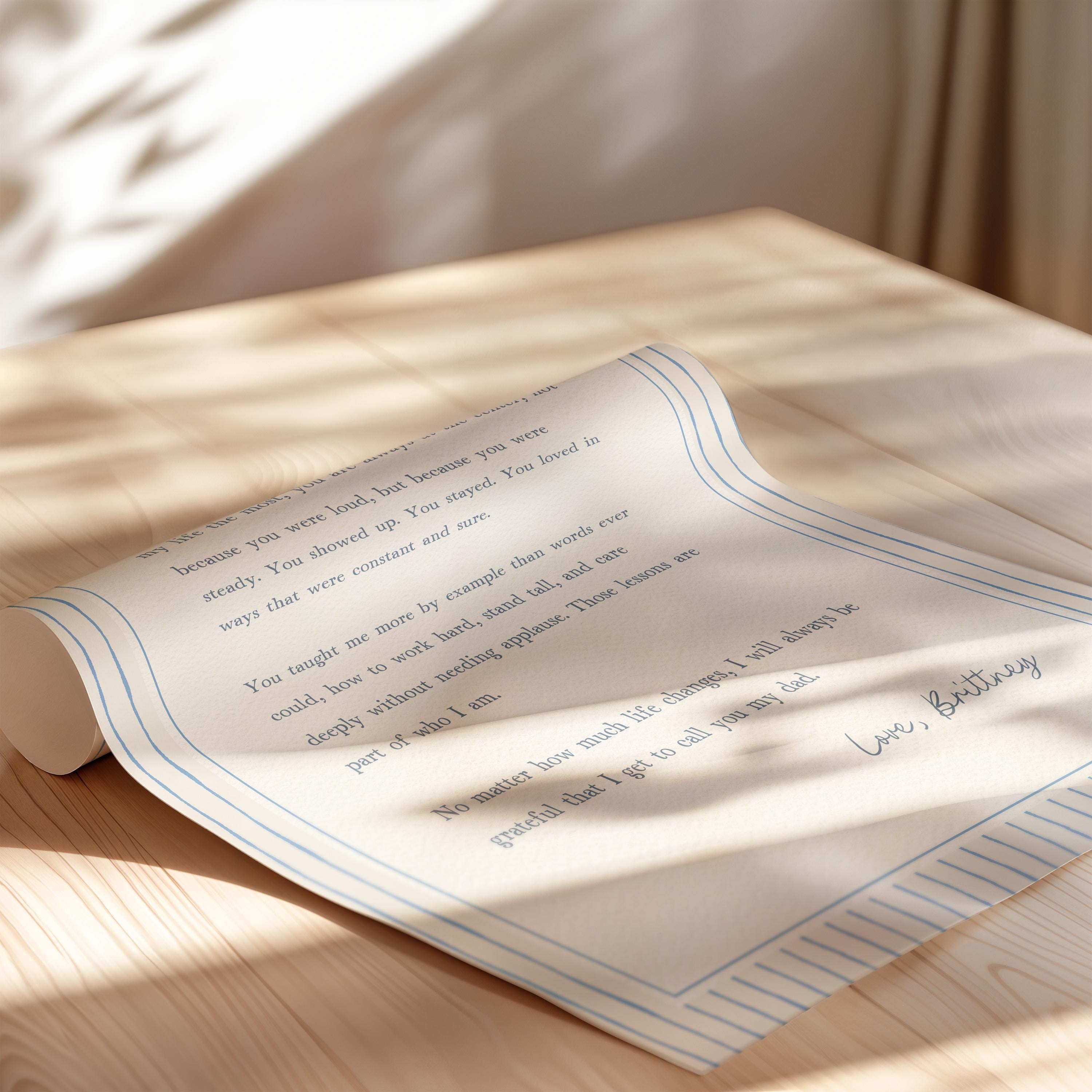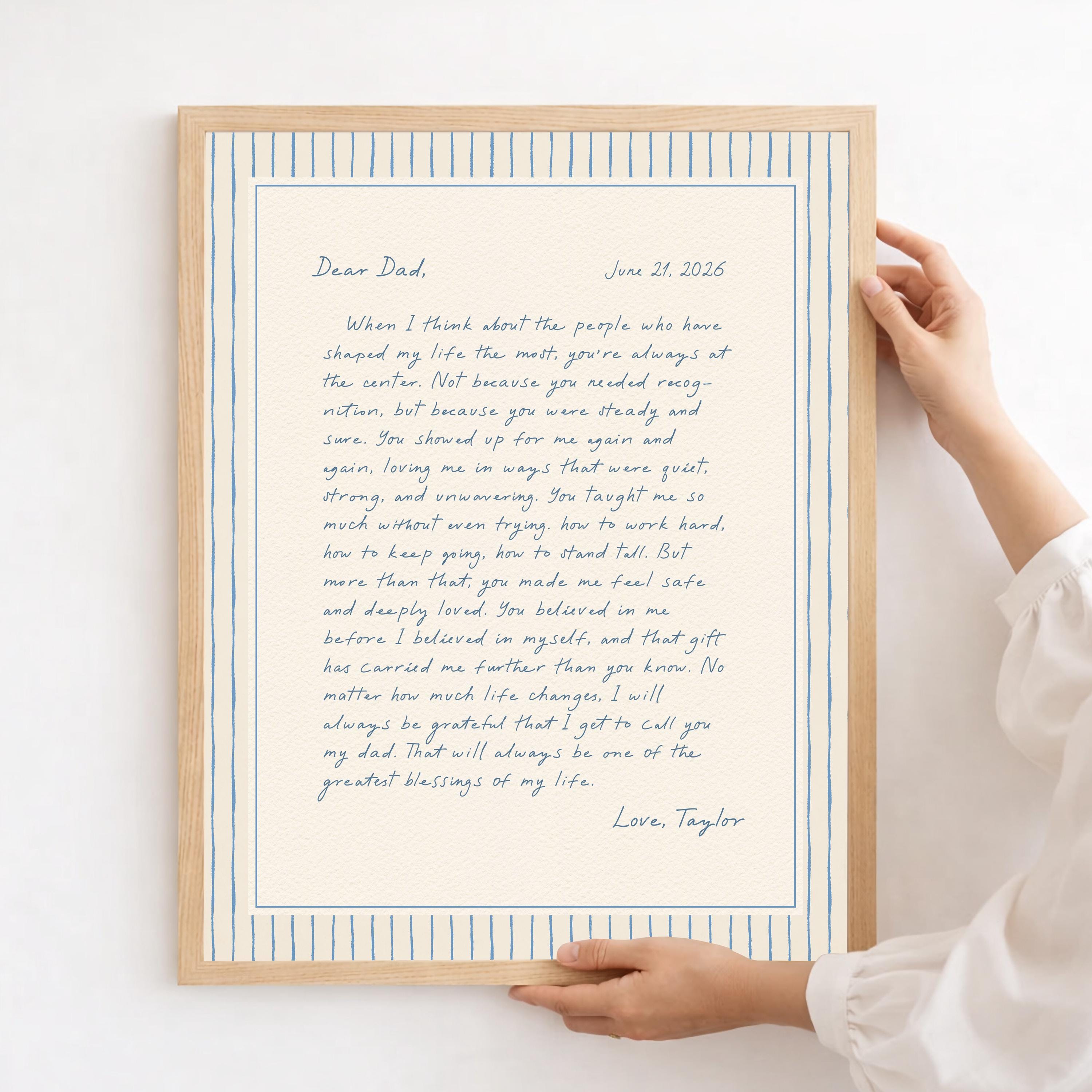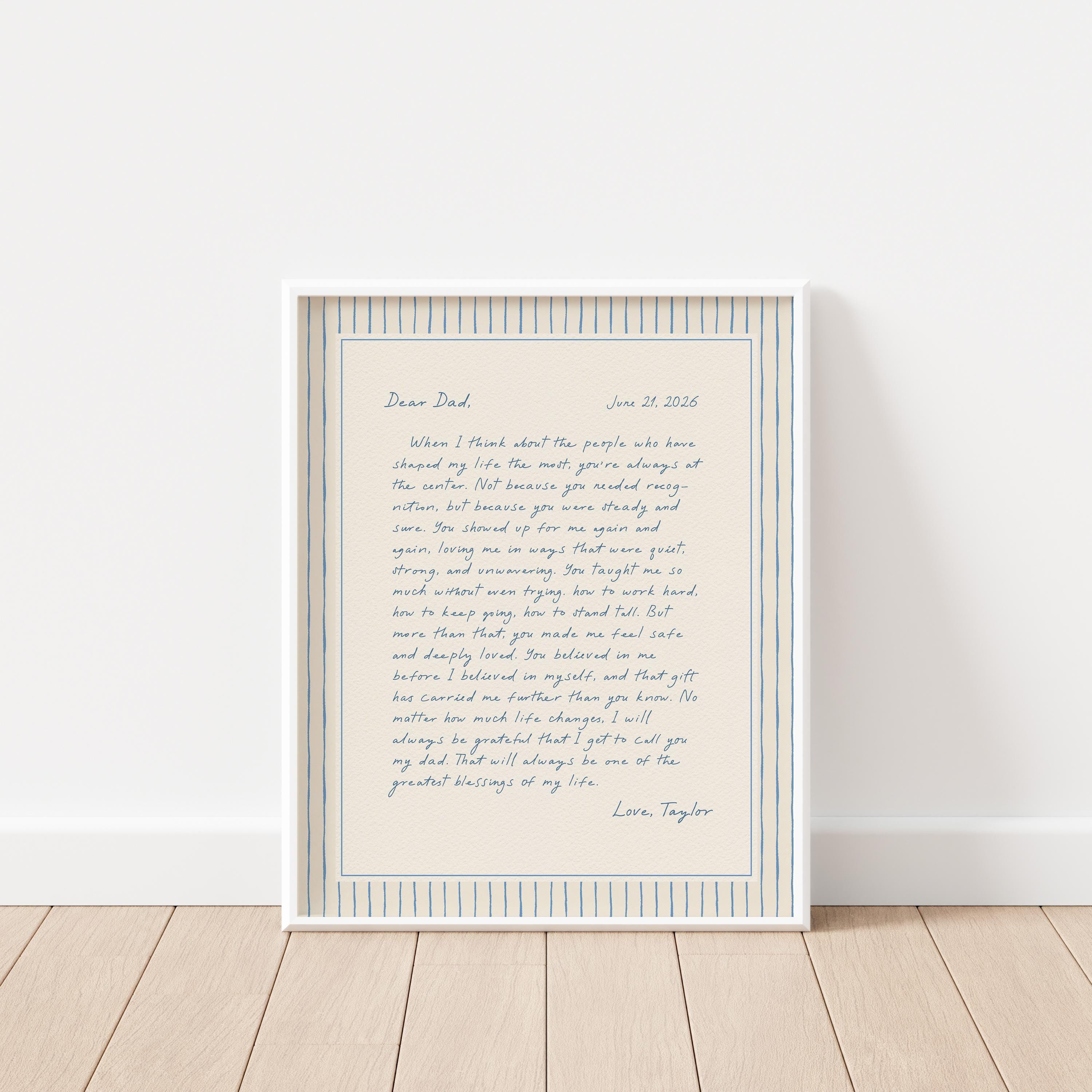 Letter to Dad from Daughter. A heartfelt personalized letter designed to celebrate your Father. This custom message wall art transforms your words into a timeless keepsake. Choose your own words or keep the message as shown. It's up to you!