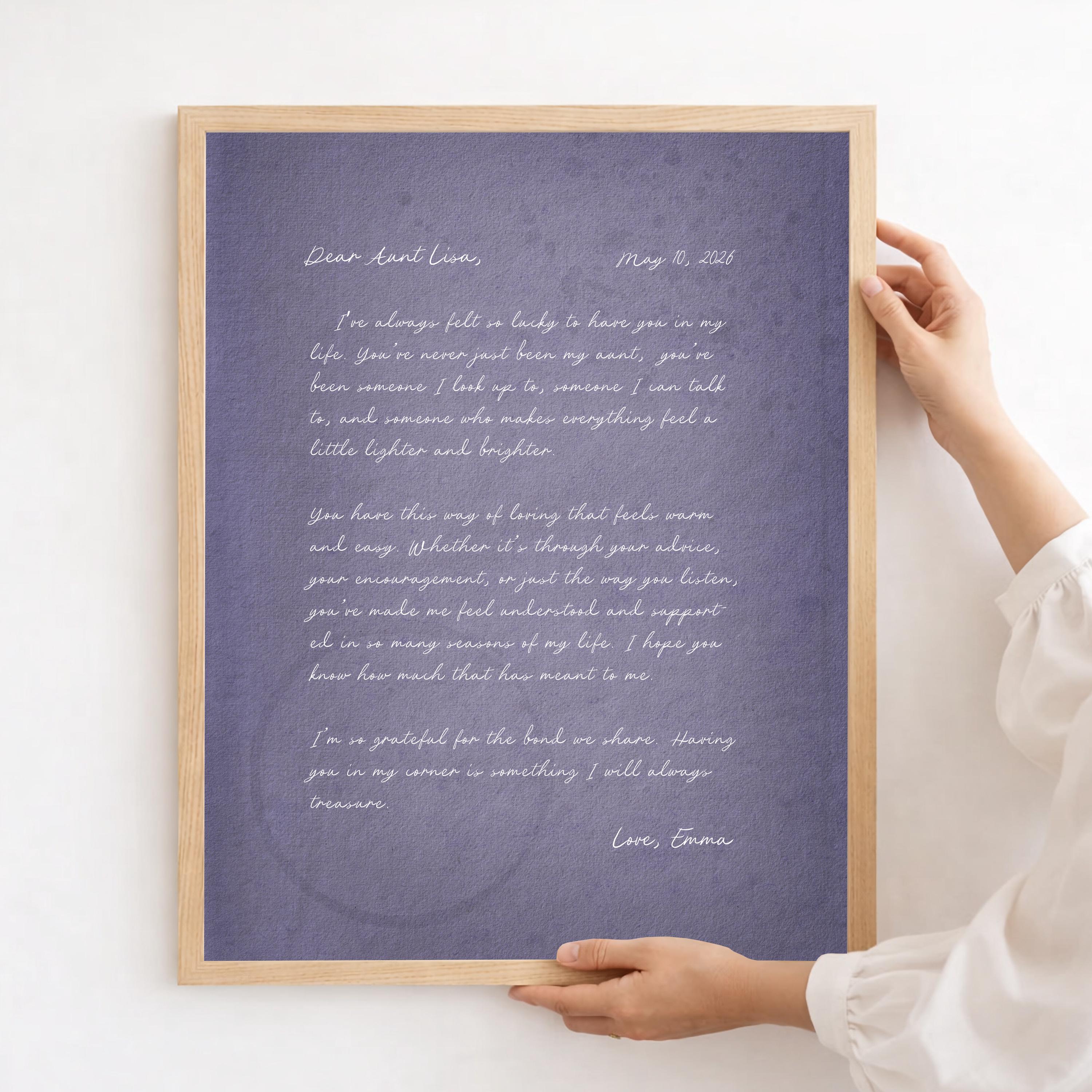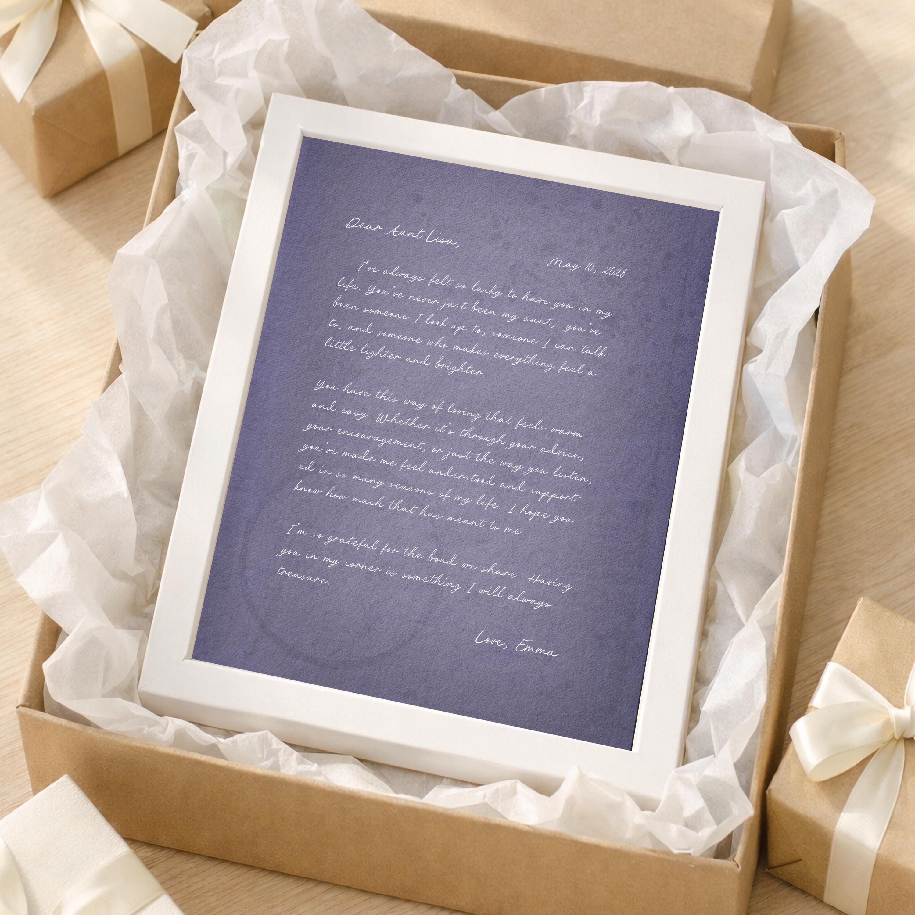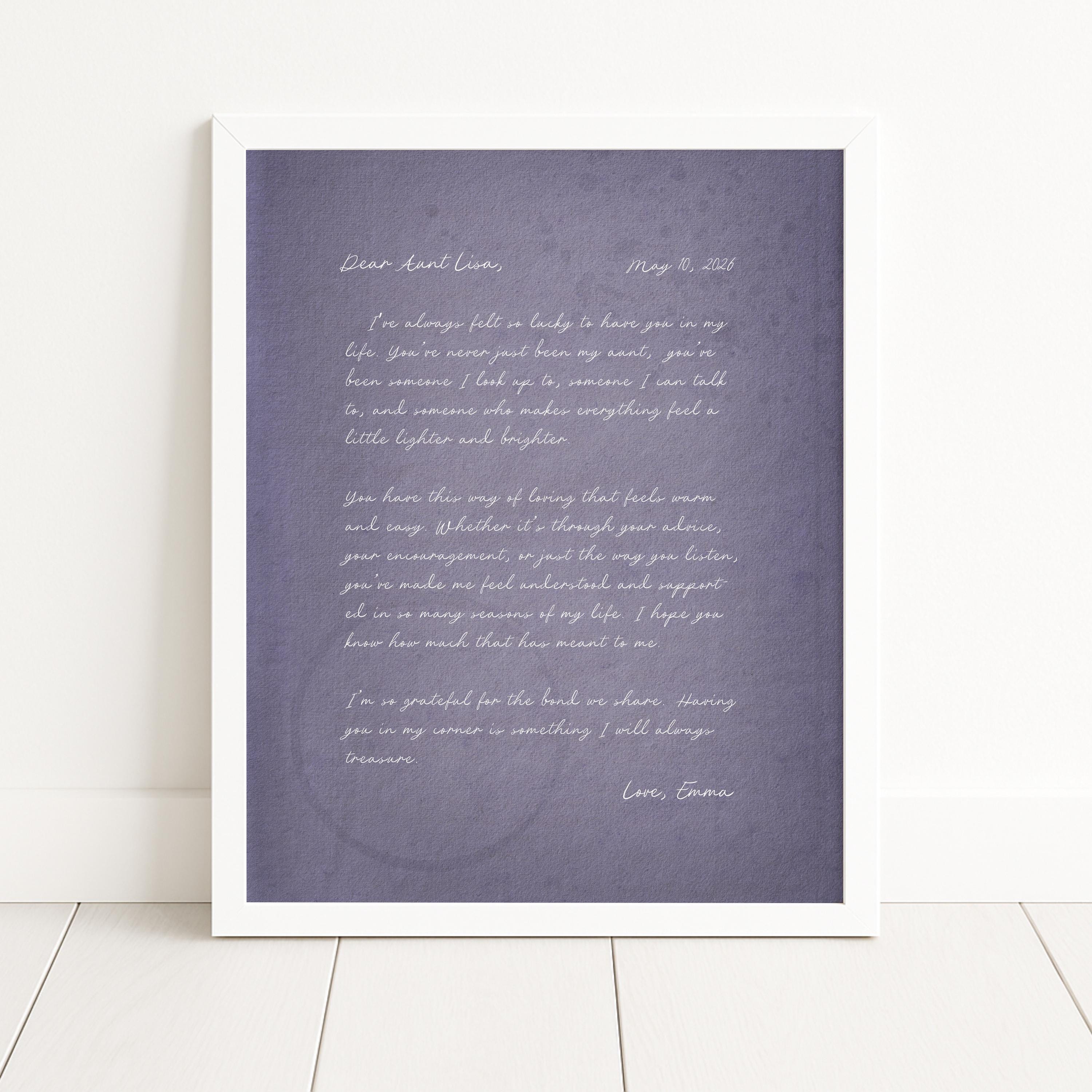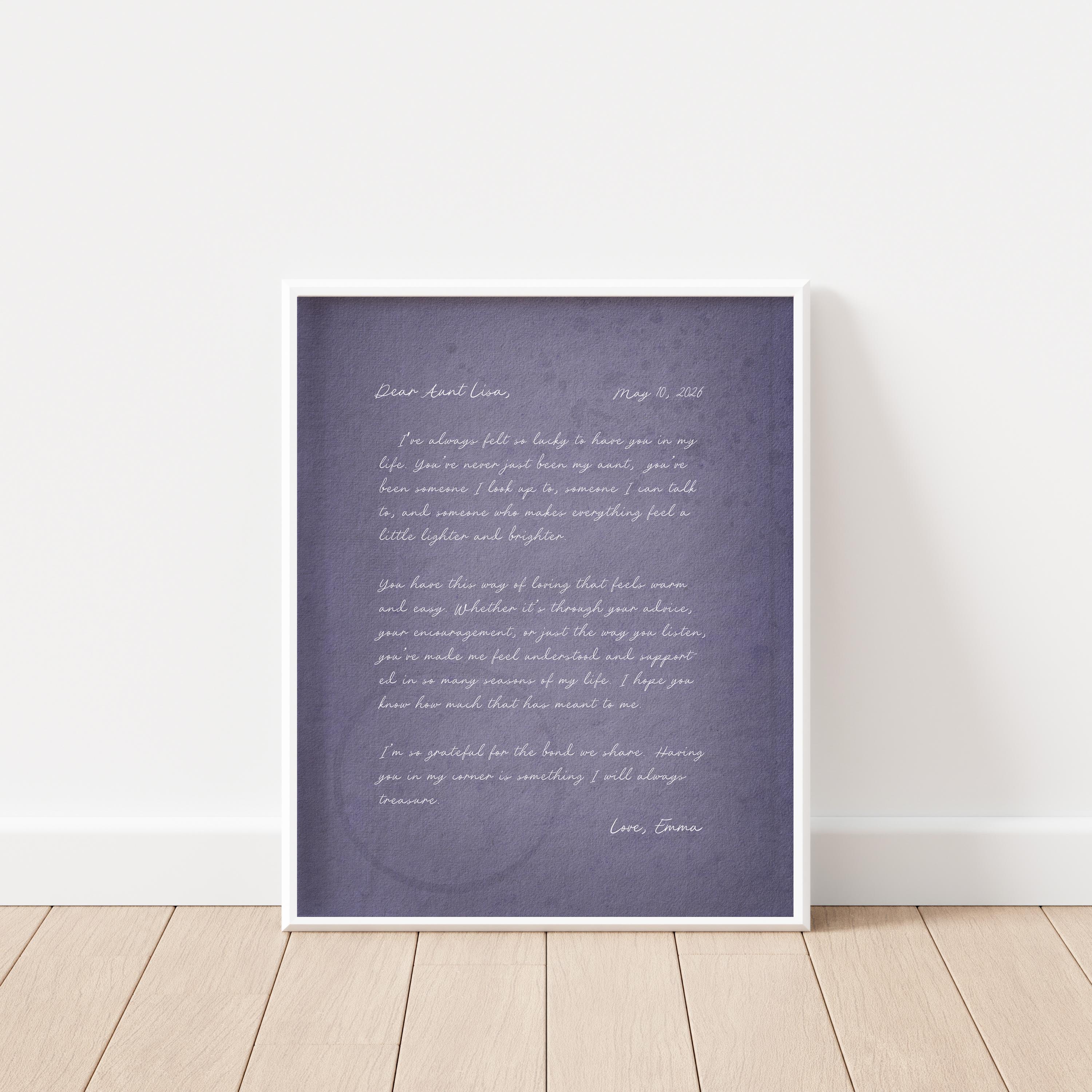 Aunt gift. A heartfelt personalized letter designed to celebrate a special Aunt. This custom message wall art transforms your words into a timeless keepsake. Choose your own words or keep the message as shown. It's up to you!