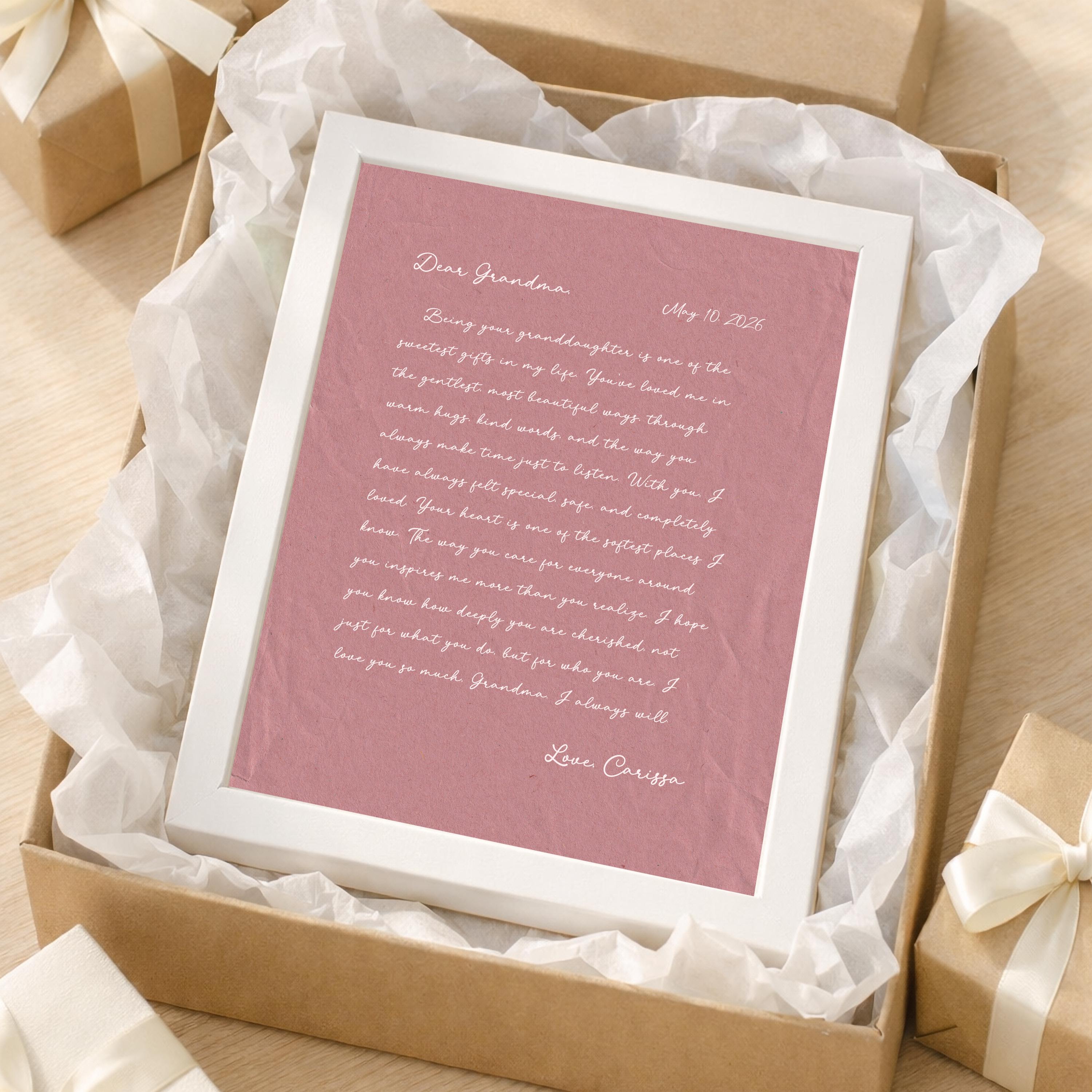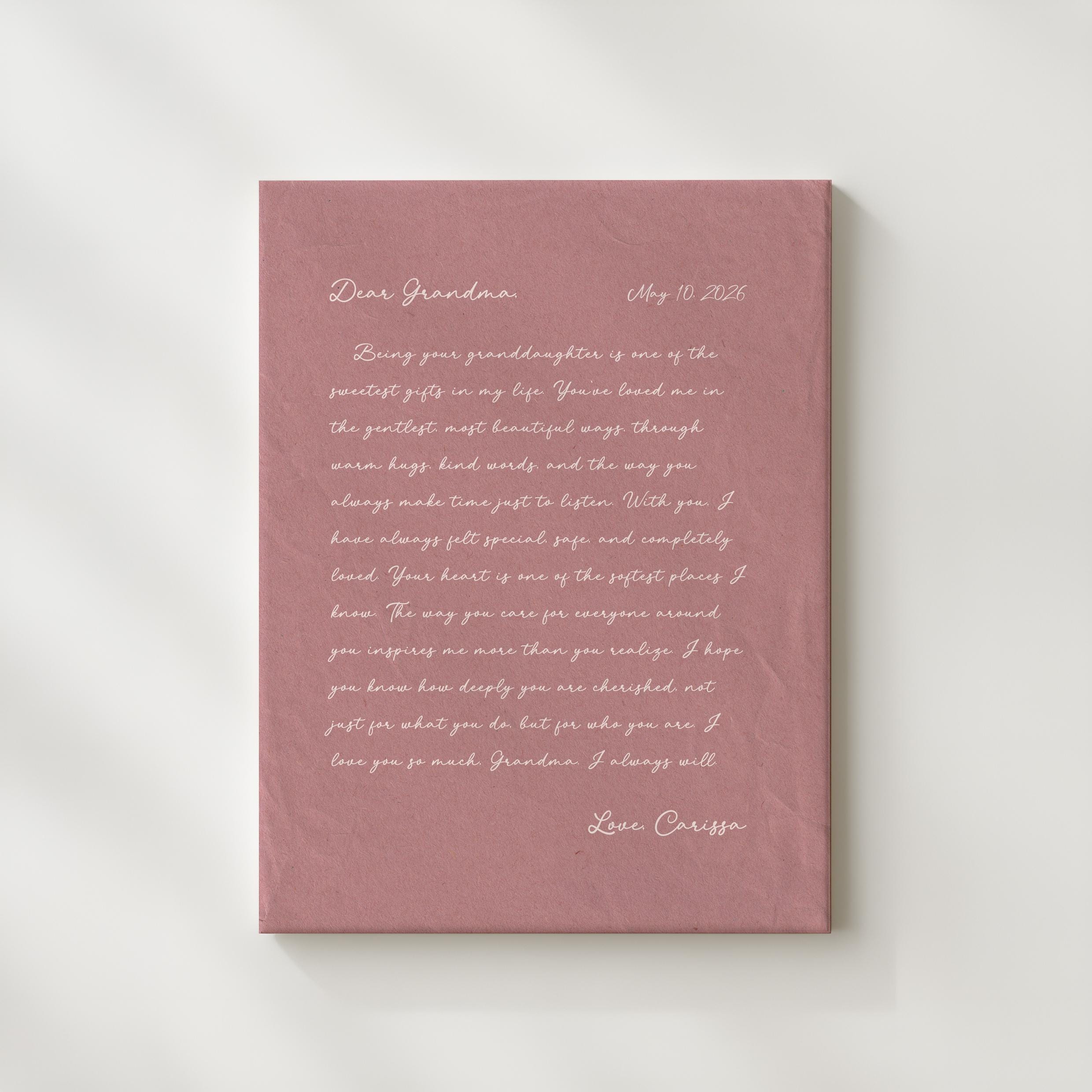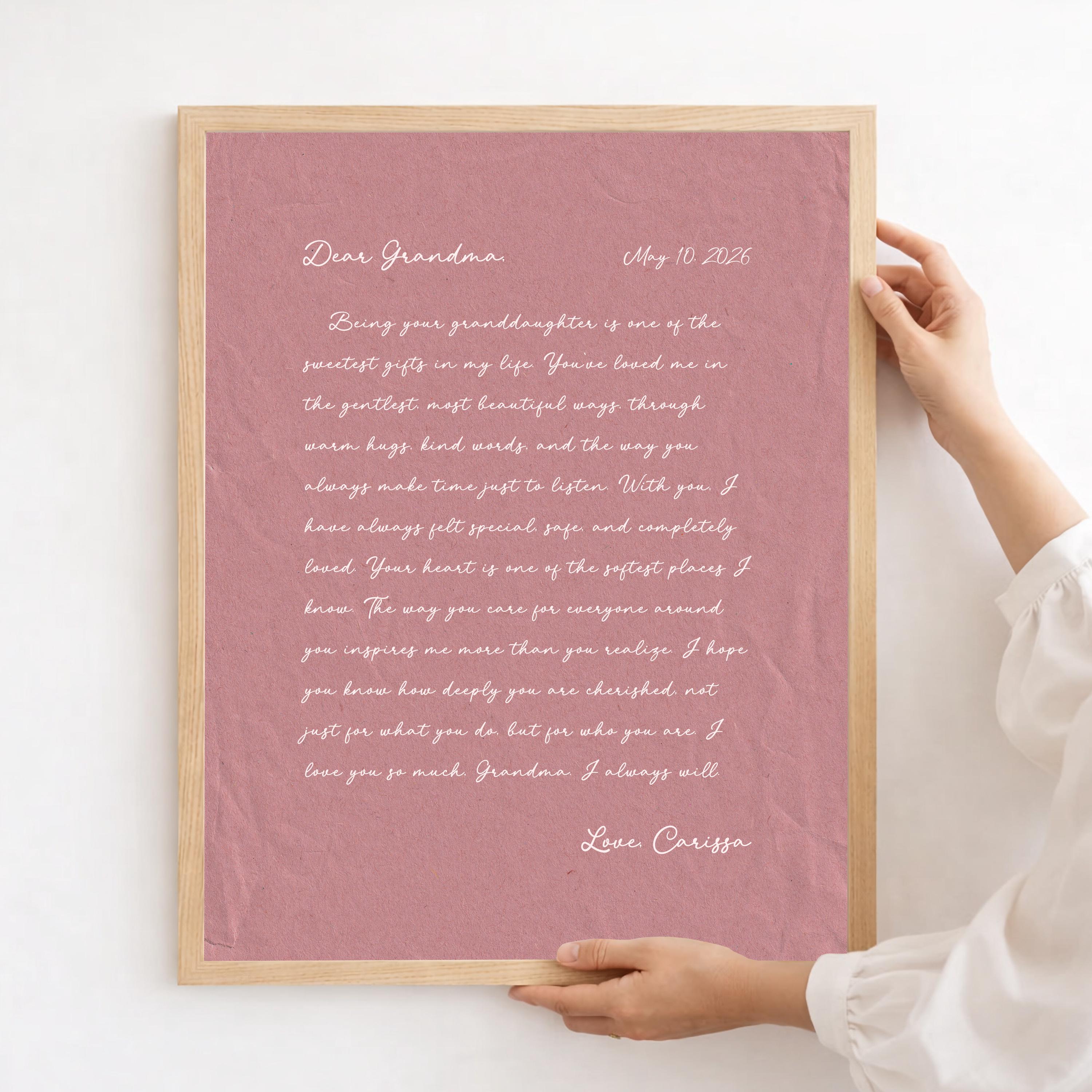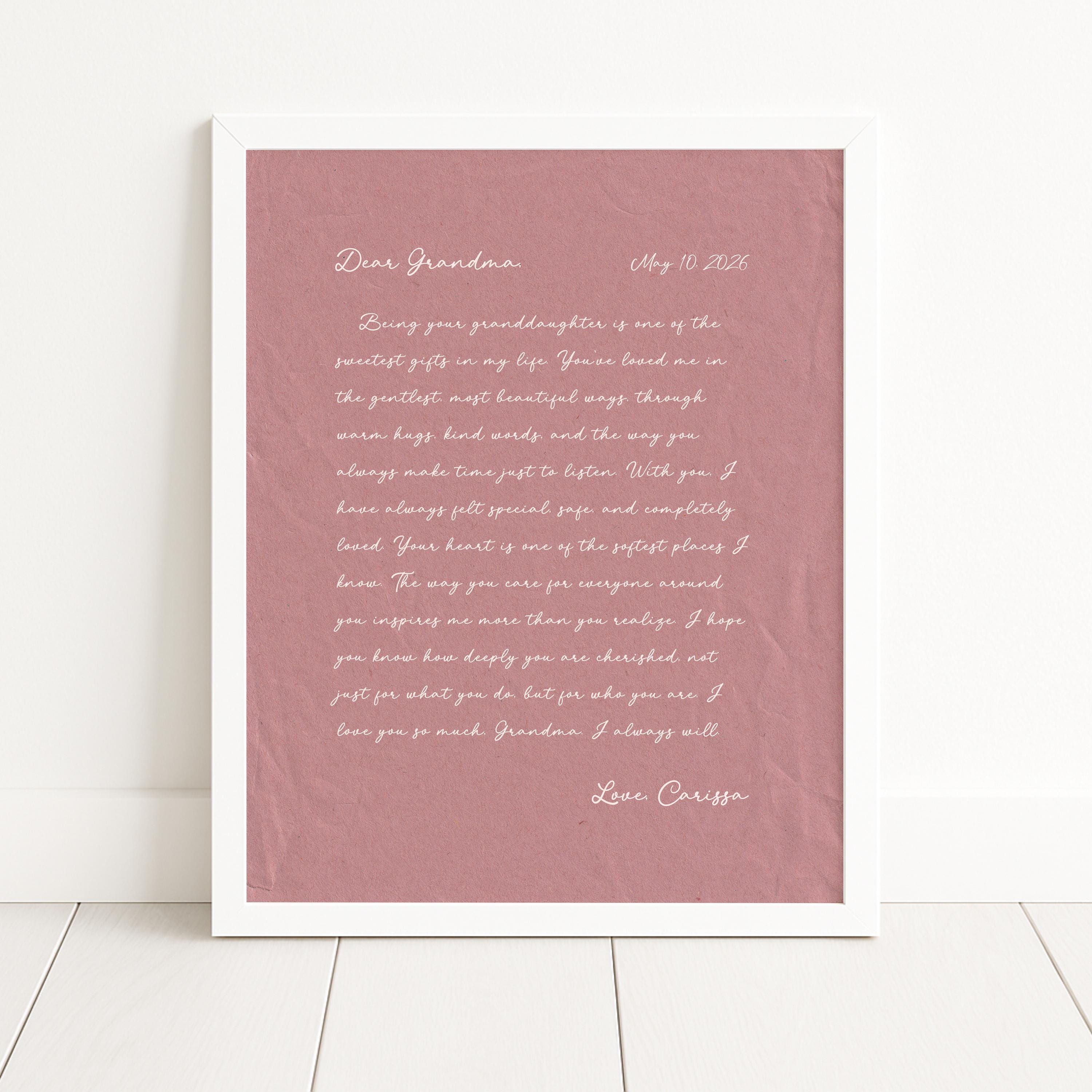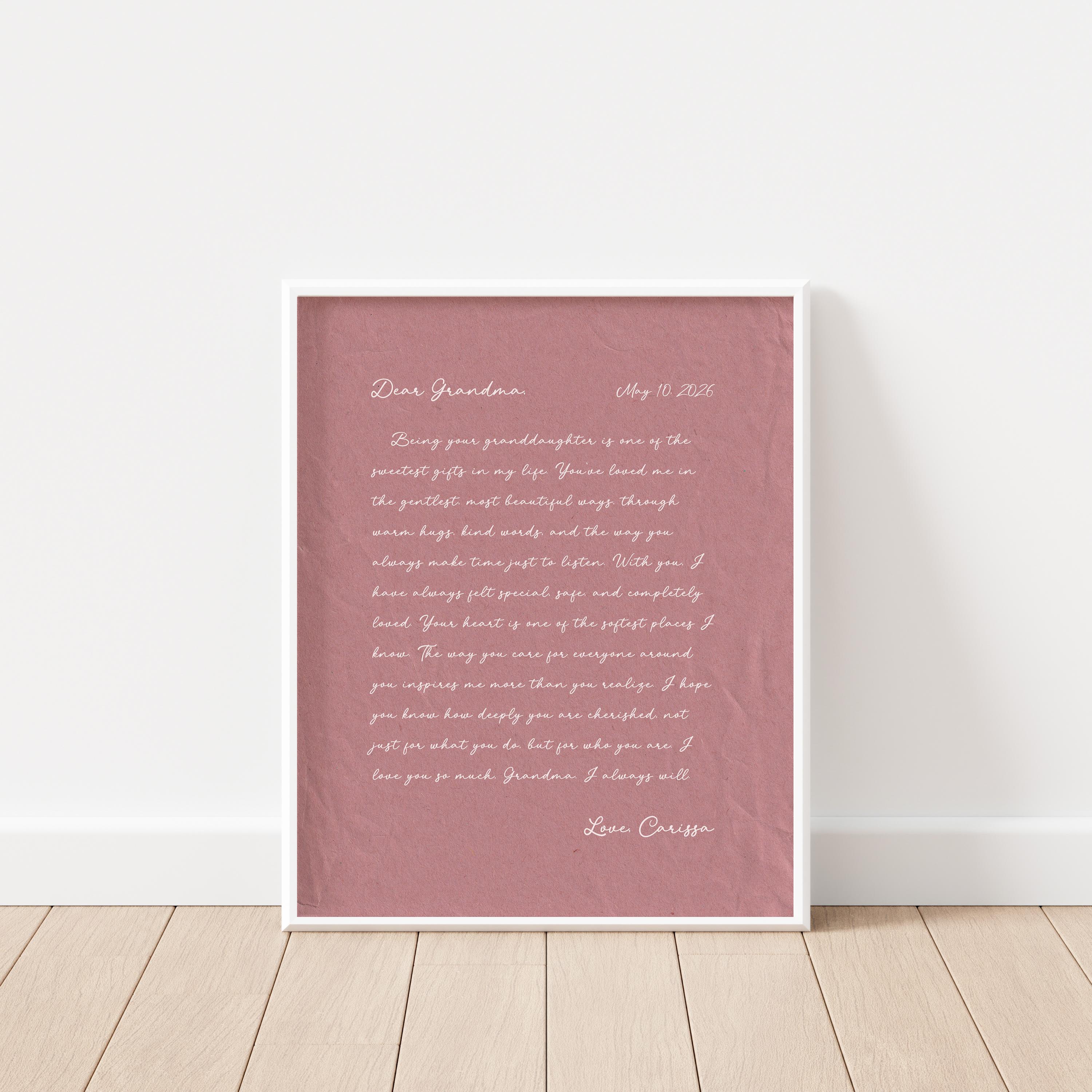 Letter to Grandma Art. A heartfelt personalized letter designed to celebrate Grandma. This custom message wall art transforms your words into a timeless keepsake. Choose your own words or keep the message as shown. It's up to you!