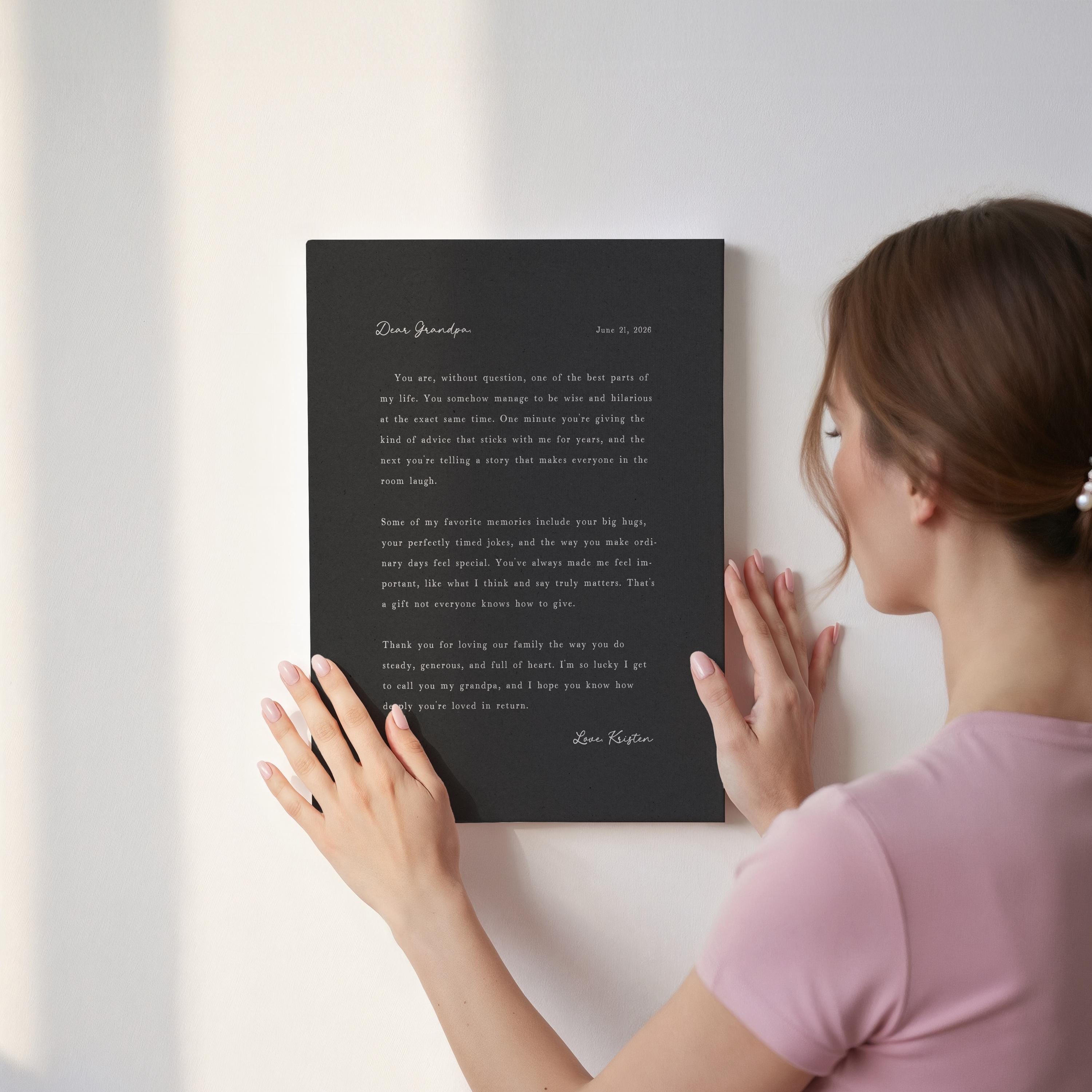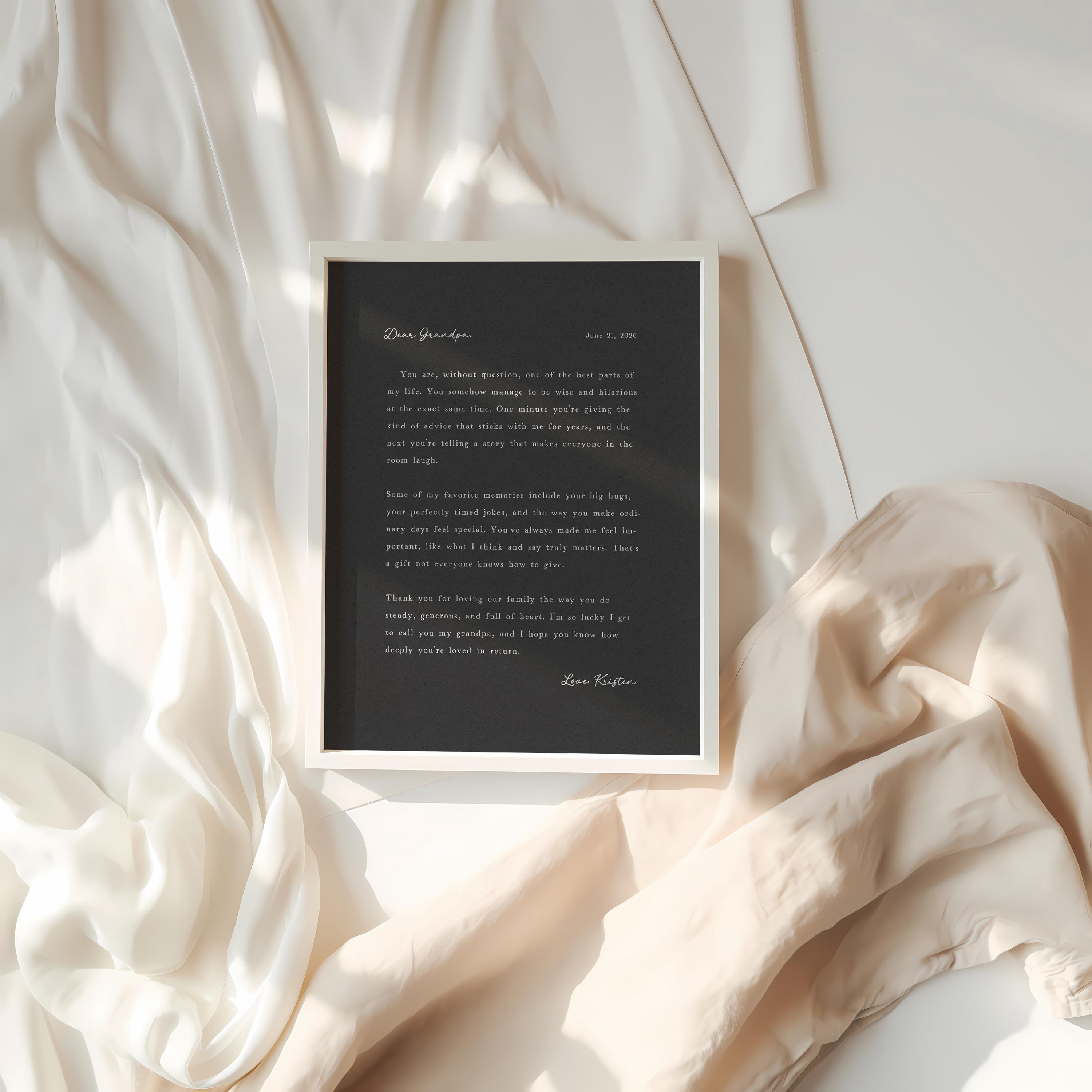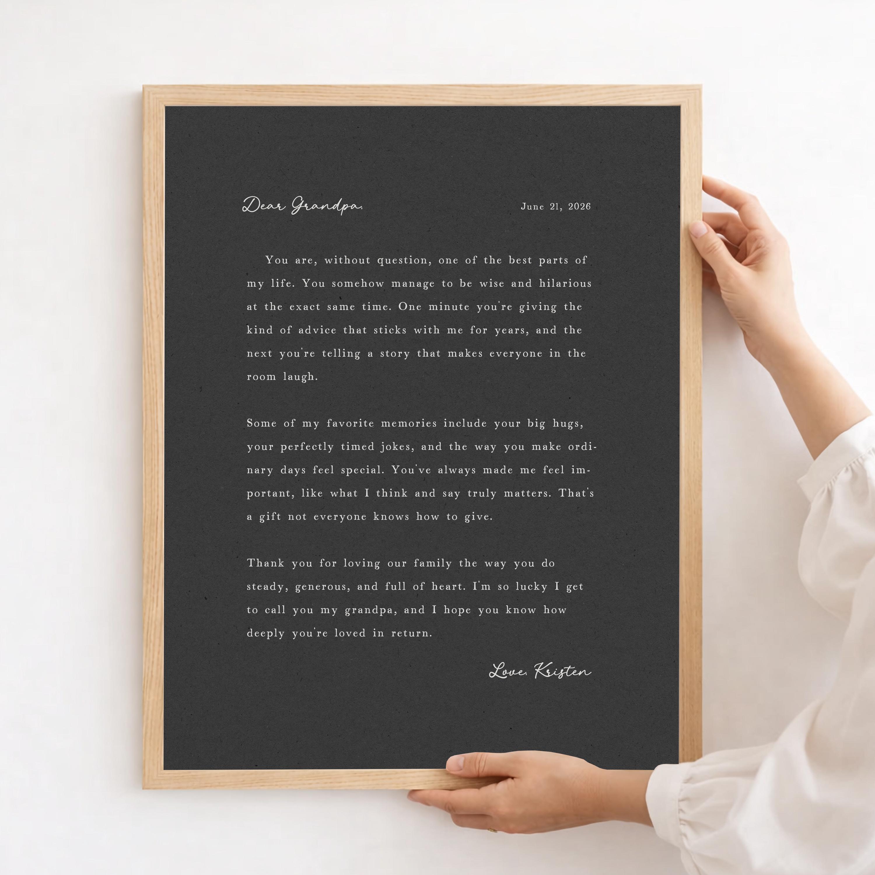 Letter to Grandpa. A heartfelt personalized letter designed to celebrate a special Grandfather. This custom message wall art transforms your words into a timeless keepsake. Choose your own words or keep the message as shown. It's up to you!