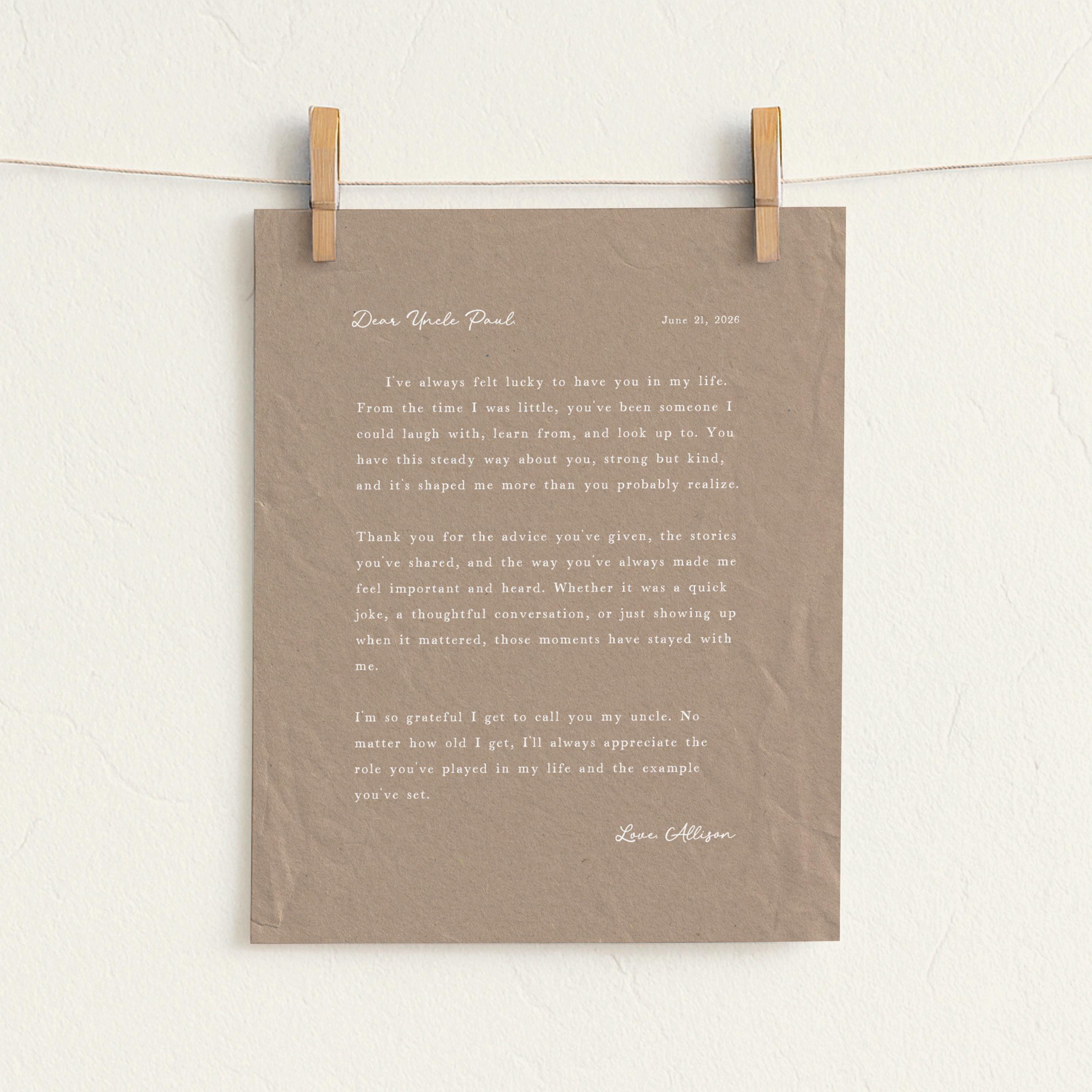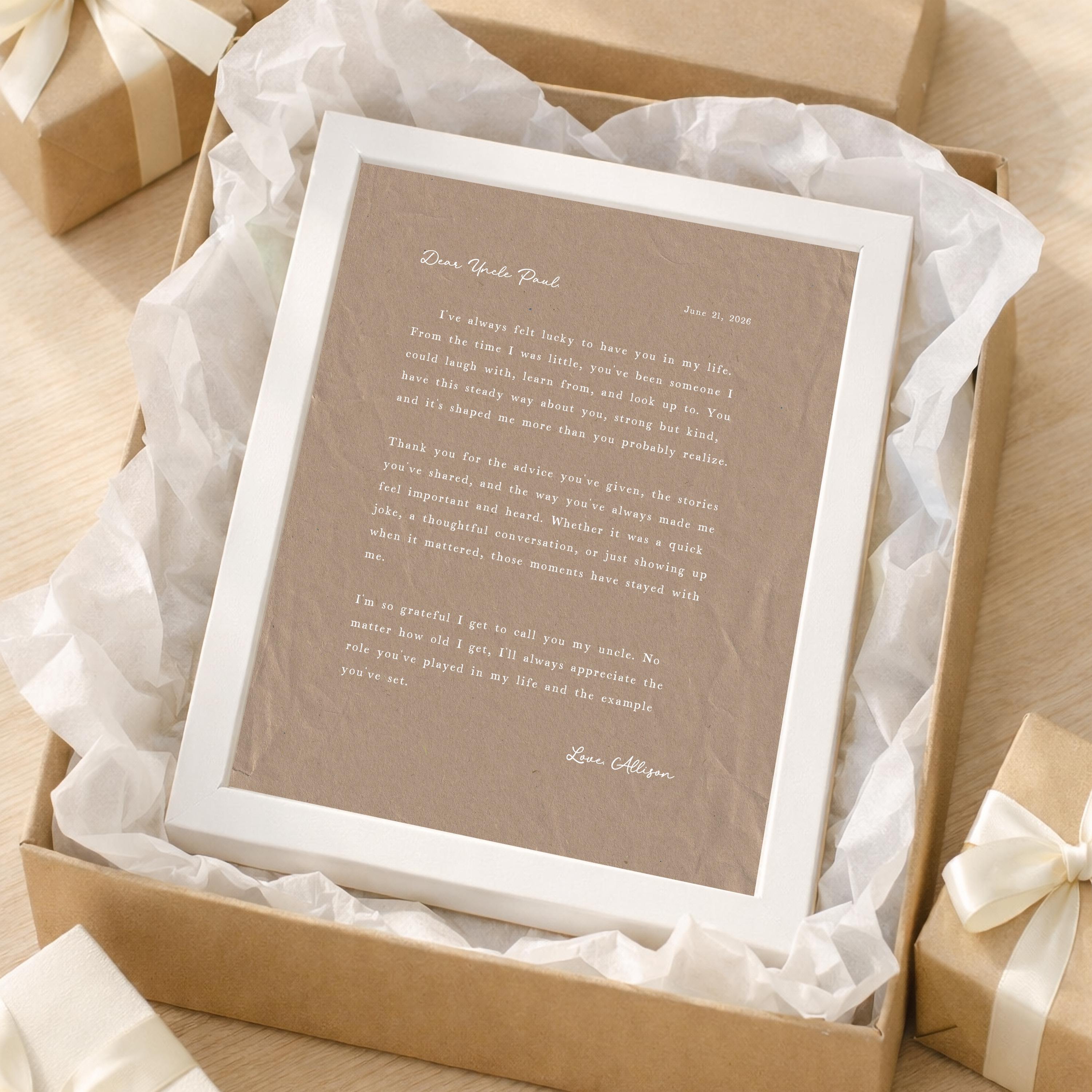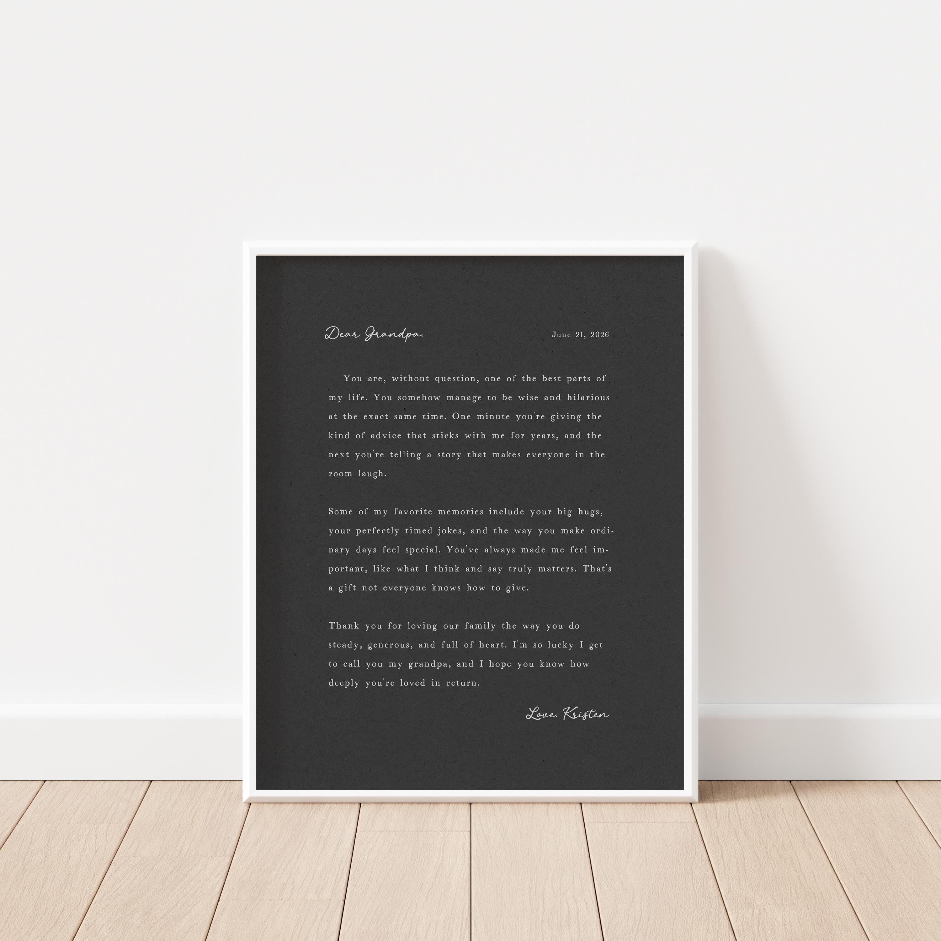 Letter to Grandpa. A heartfelt personalized letter designed to celebrate a special Grandfather. This custom message wall art transforms your words into a timeless keepsake. Choose your own words or keep the message as shown. It's up to you!