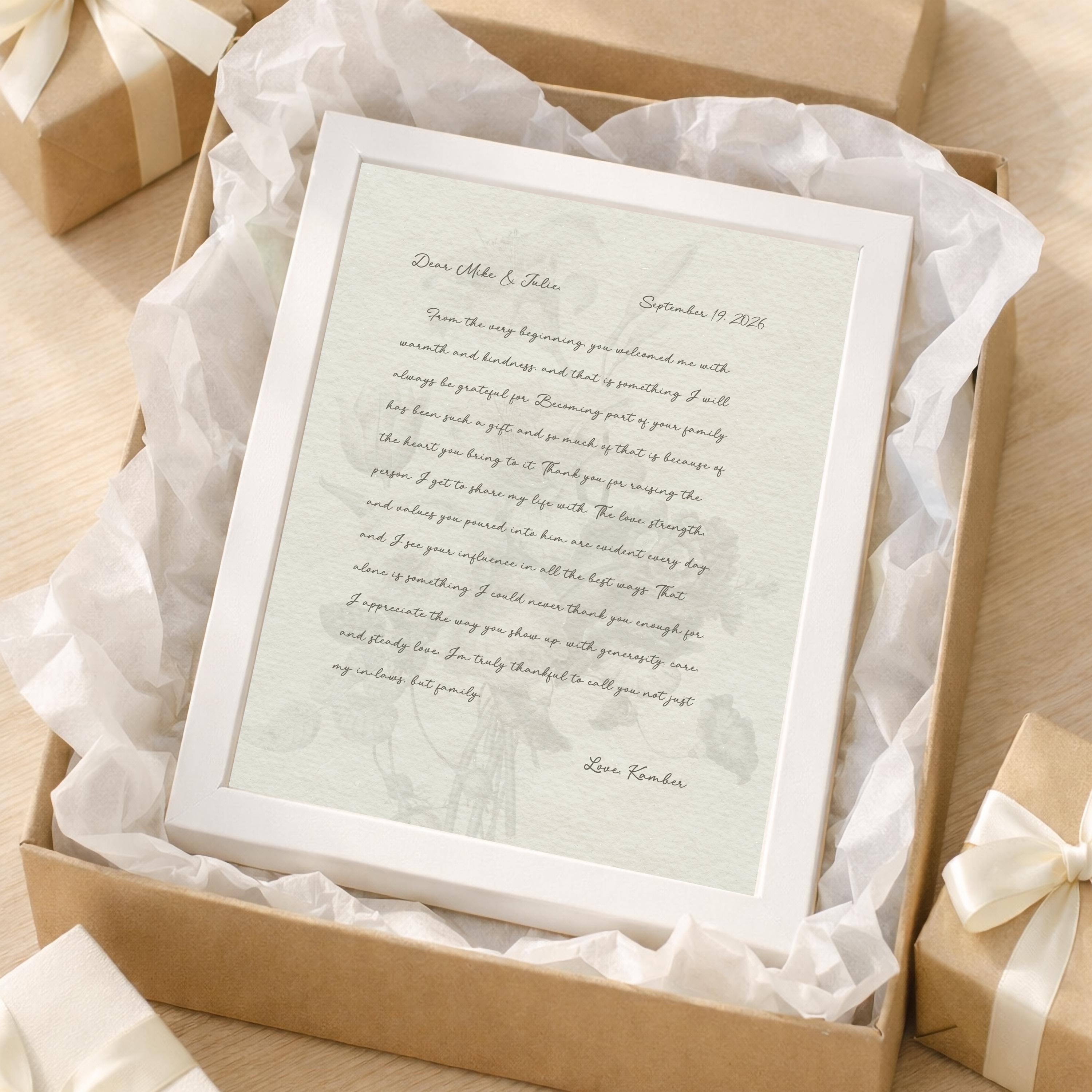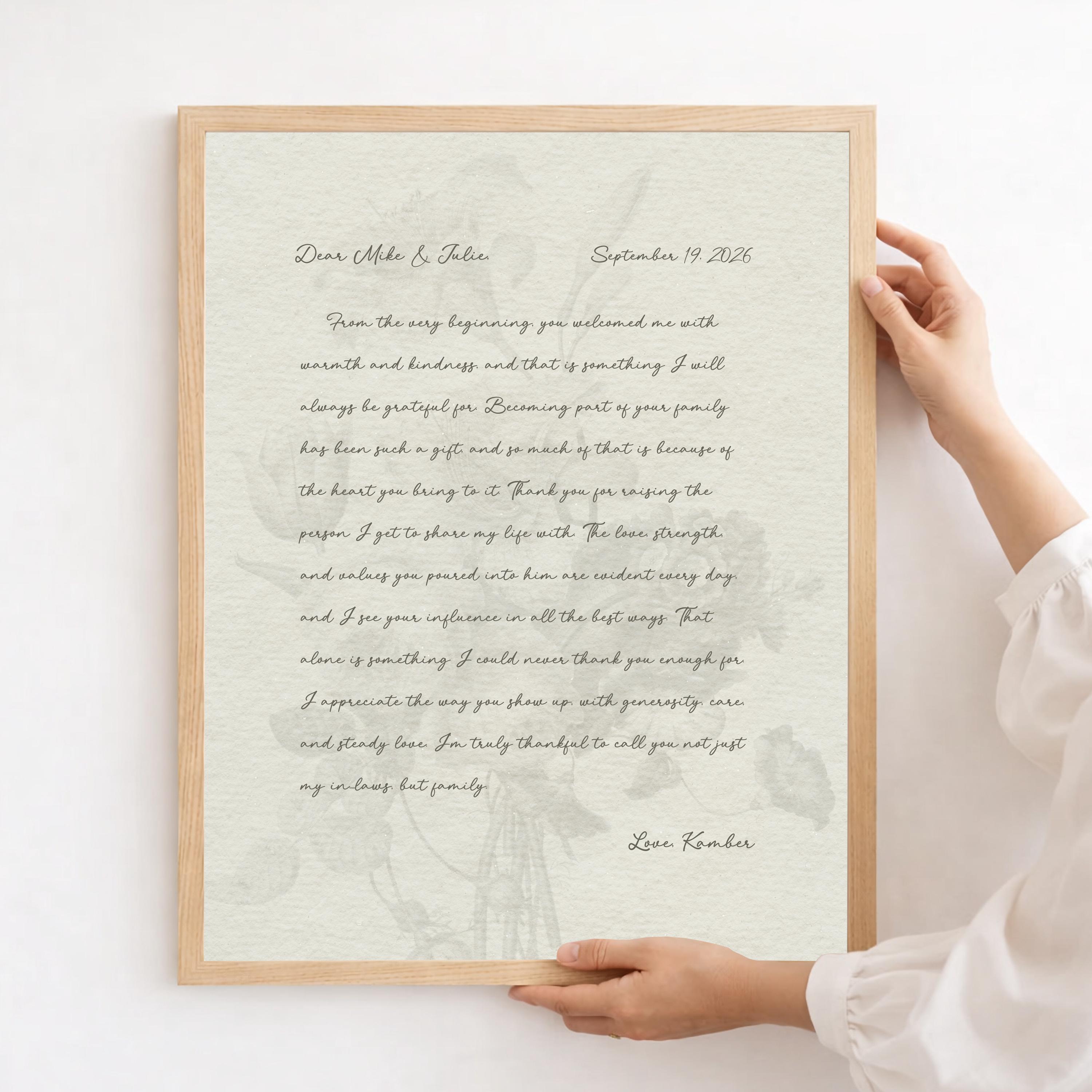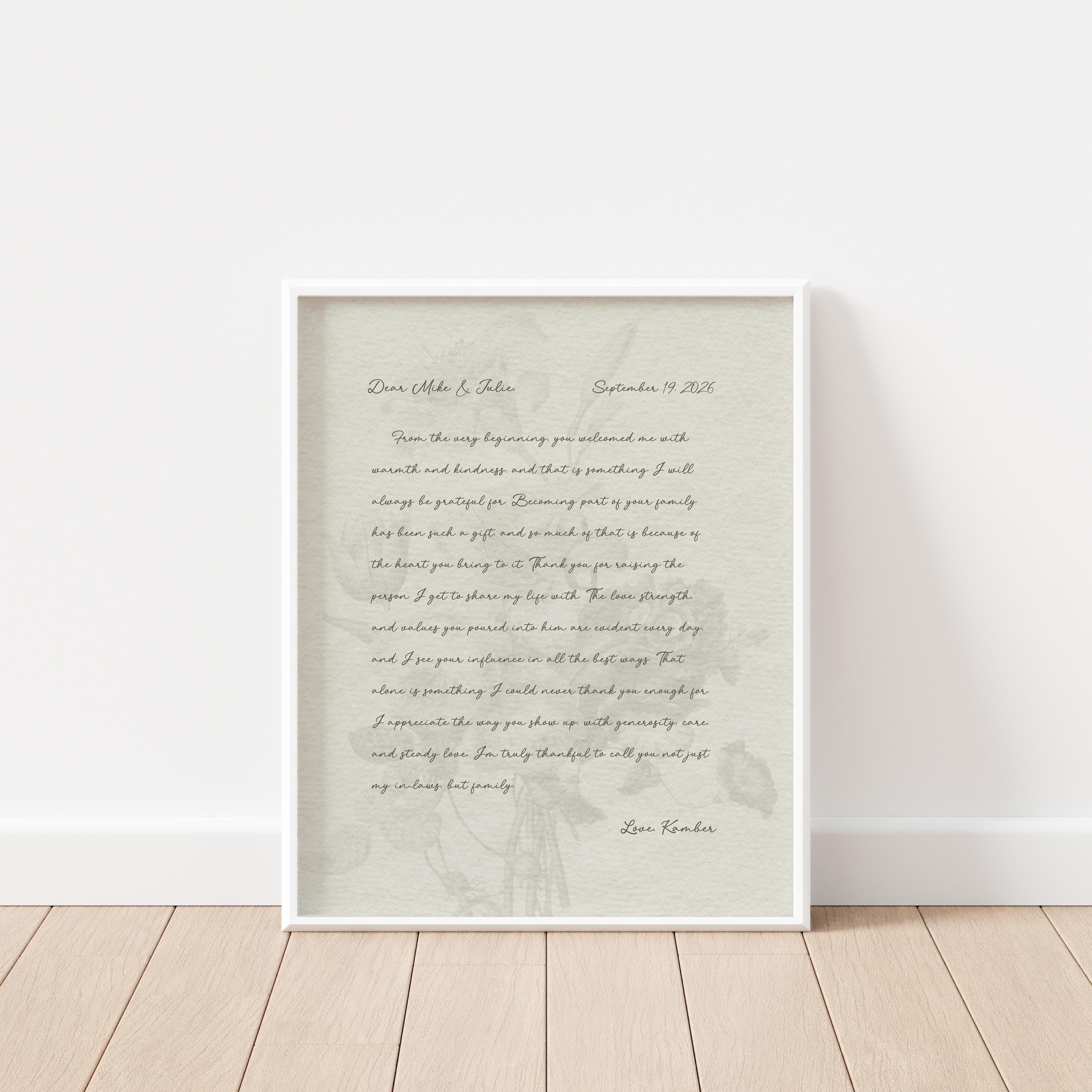 Gift for Parents-in-law. A heartfelt personalized letter designed to celebrate a Mother-in-Law and Father-in-Law. This custom message wall art transforms your words into a timeless keepsake. Choose your own words or keep the message as shown. It's up to you!