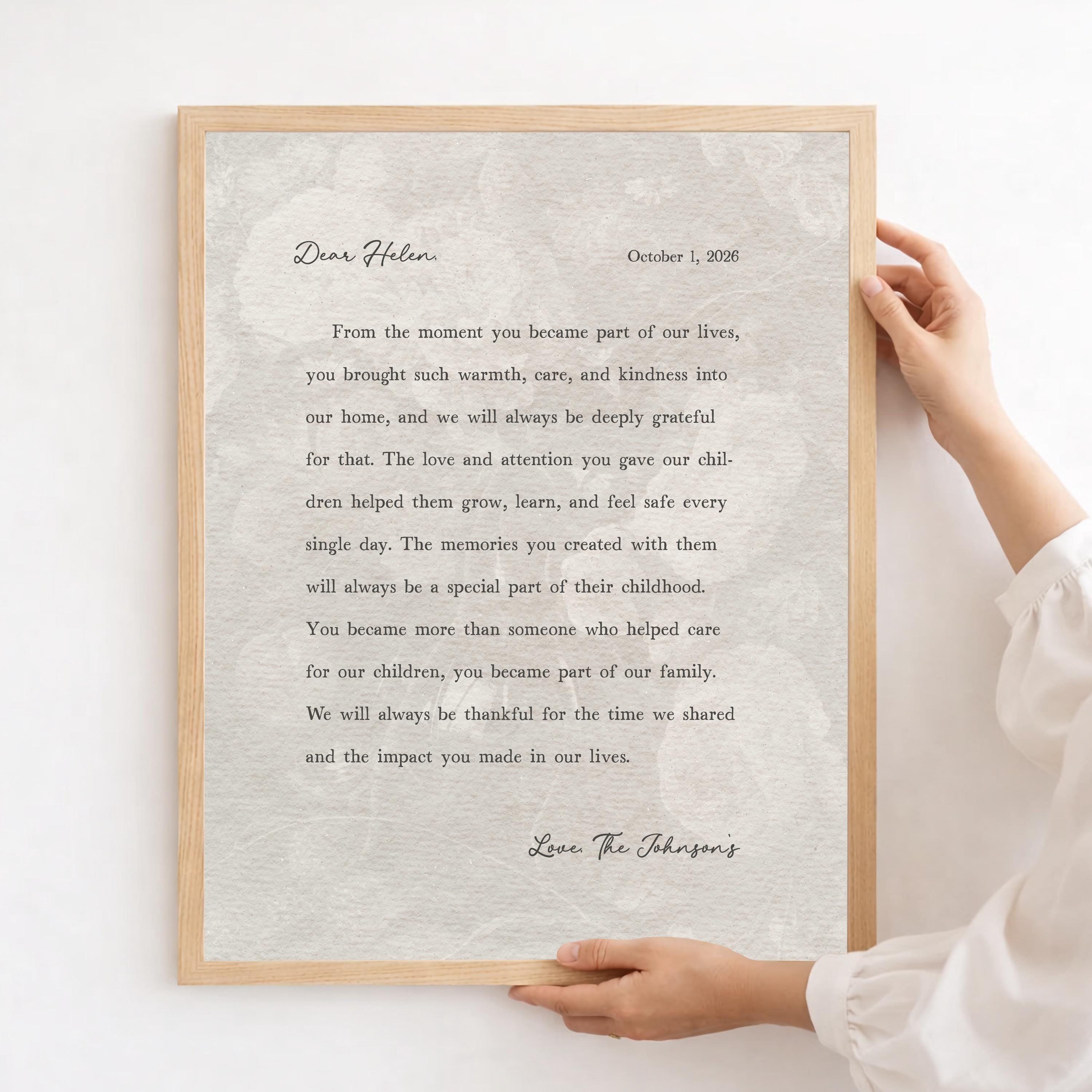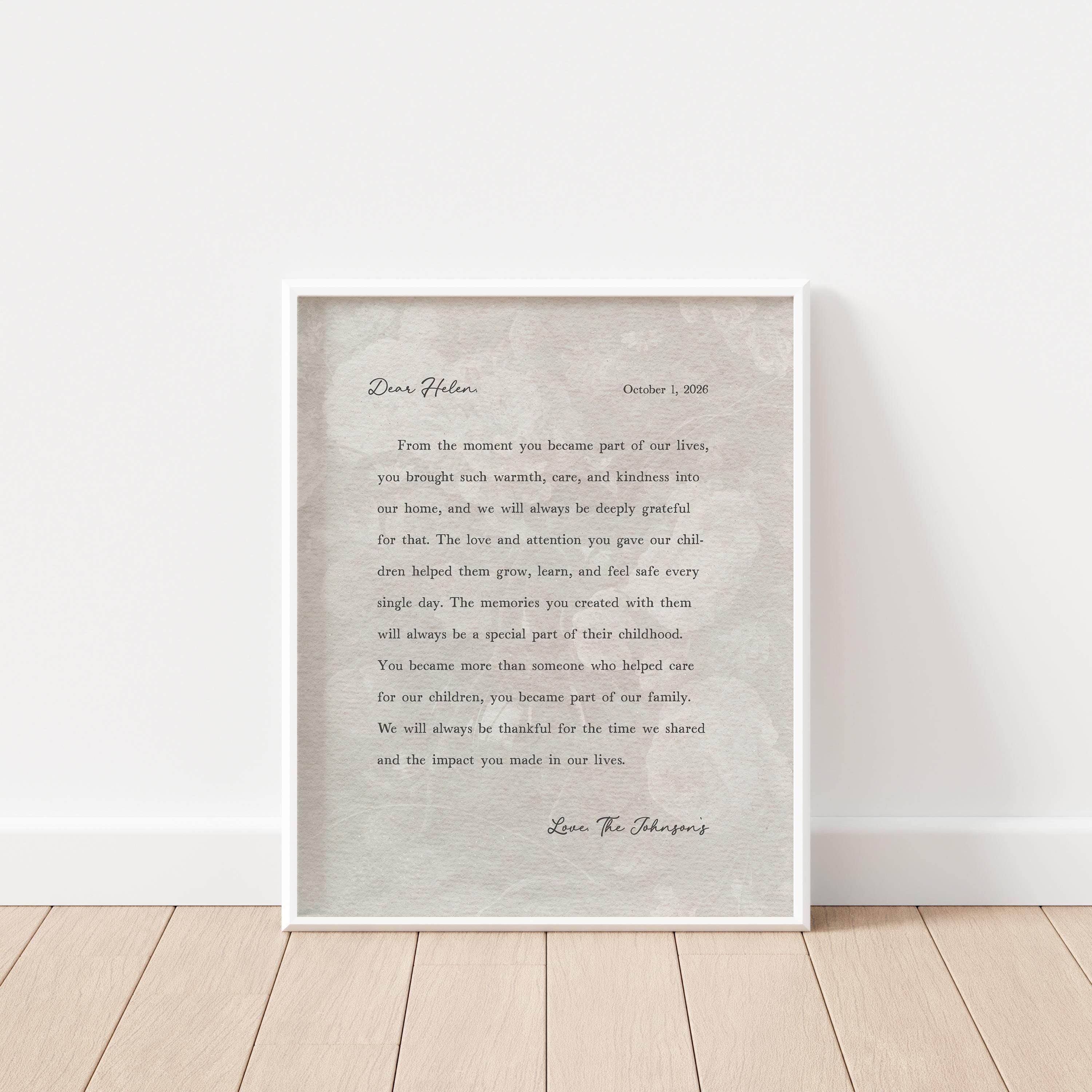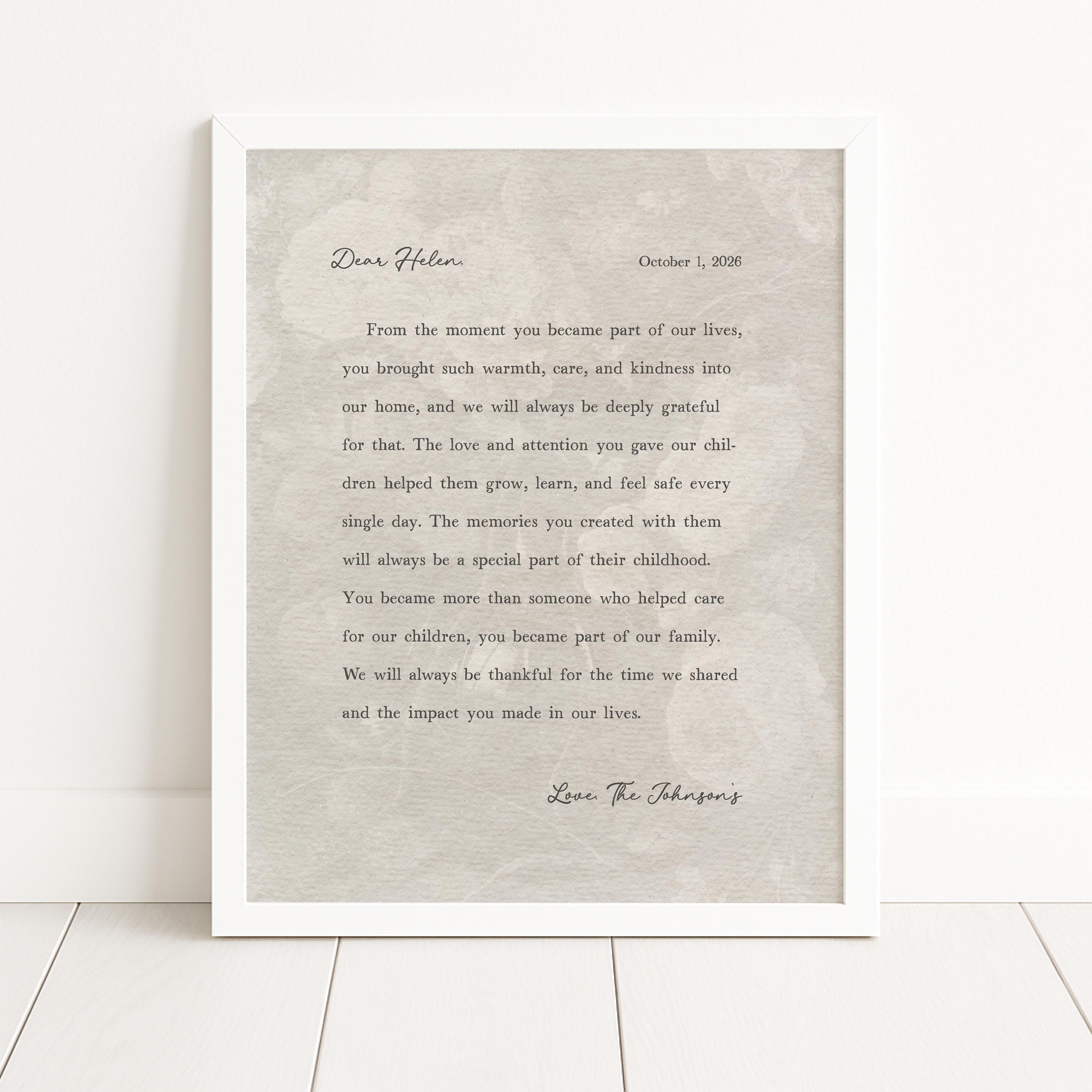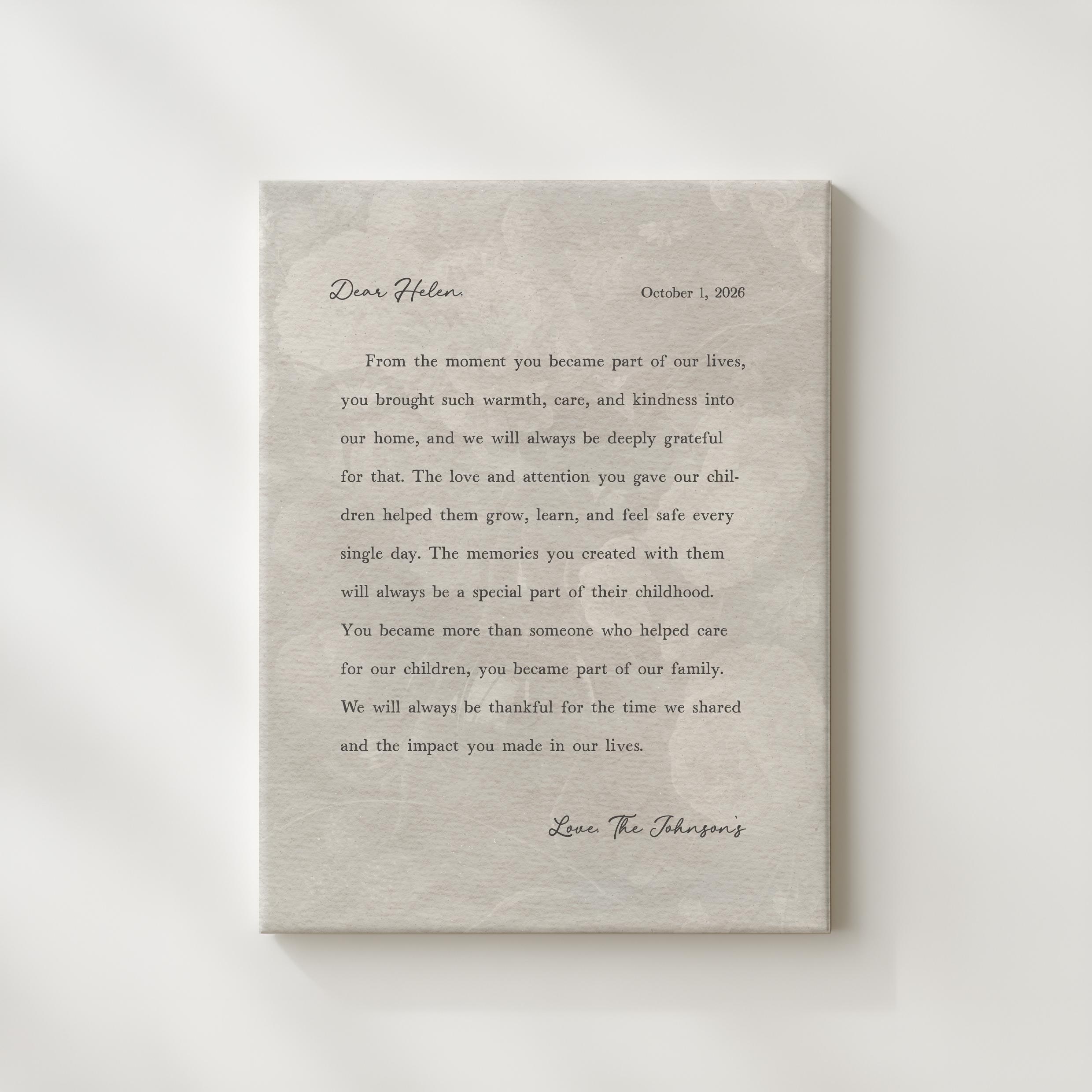 Letter to Nanny. A heartfelt personalized letter designed to celebrate a special Nanny. This custom message wall art transforms your words into a timeless keepsake. Choose your own words or keep the message as shown. It's up to you!