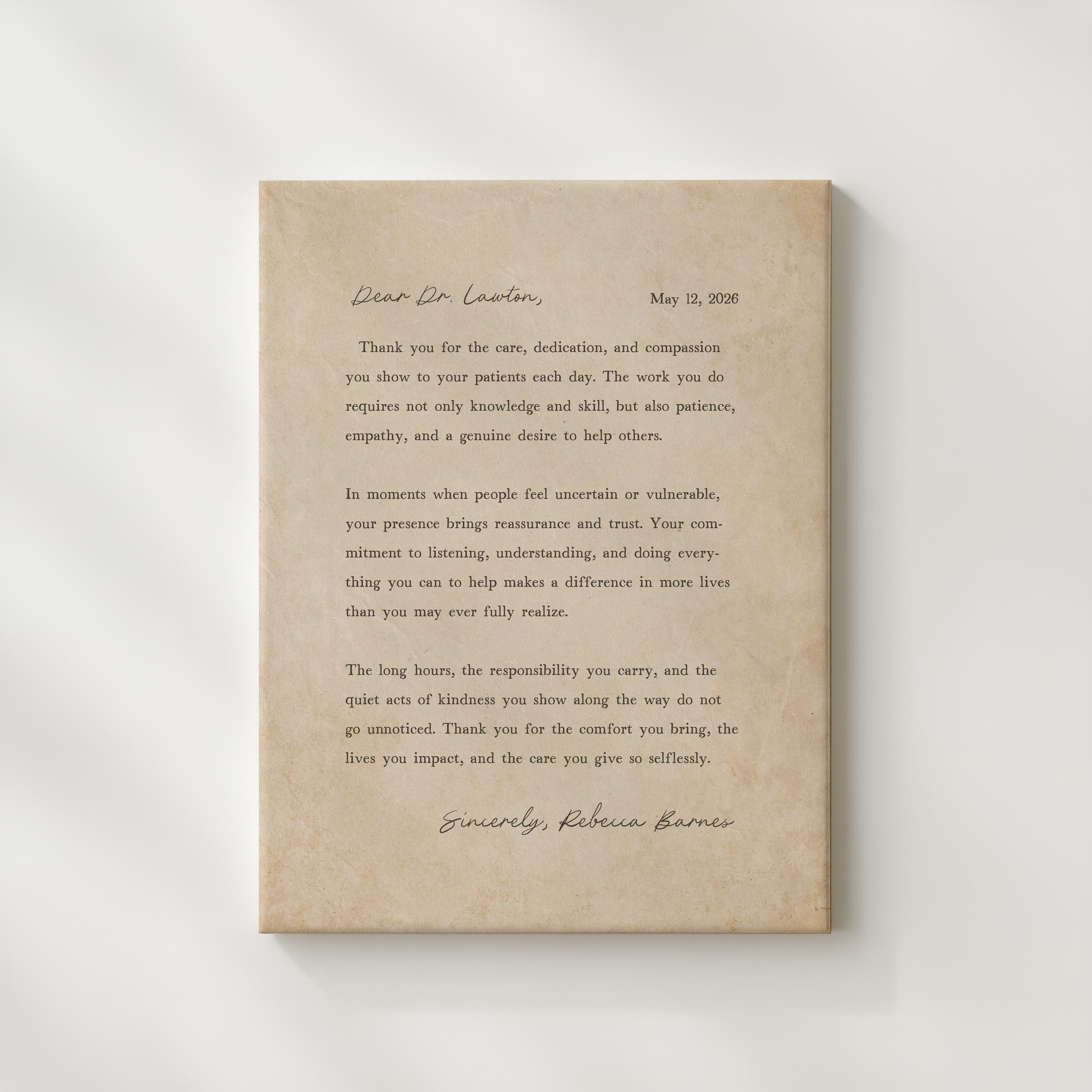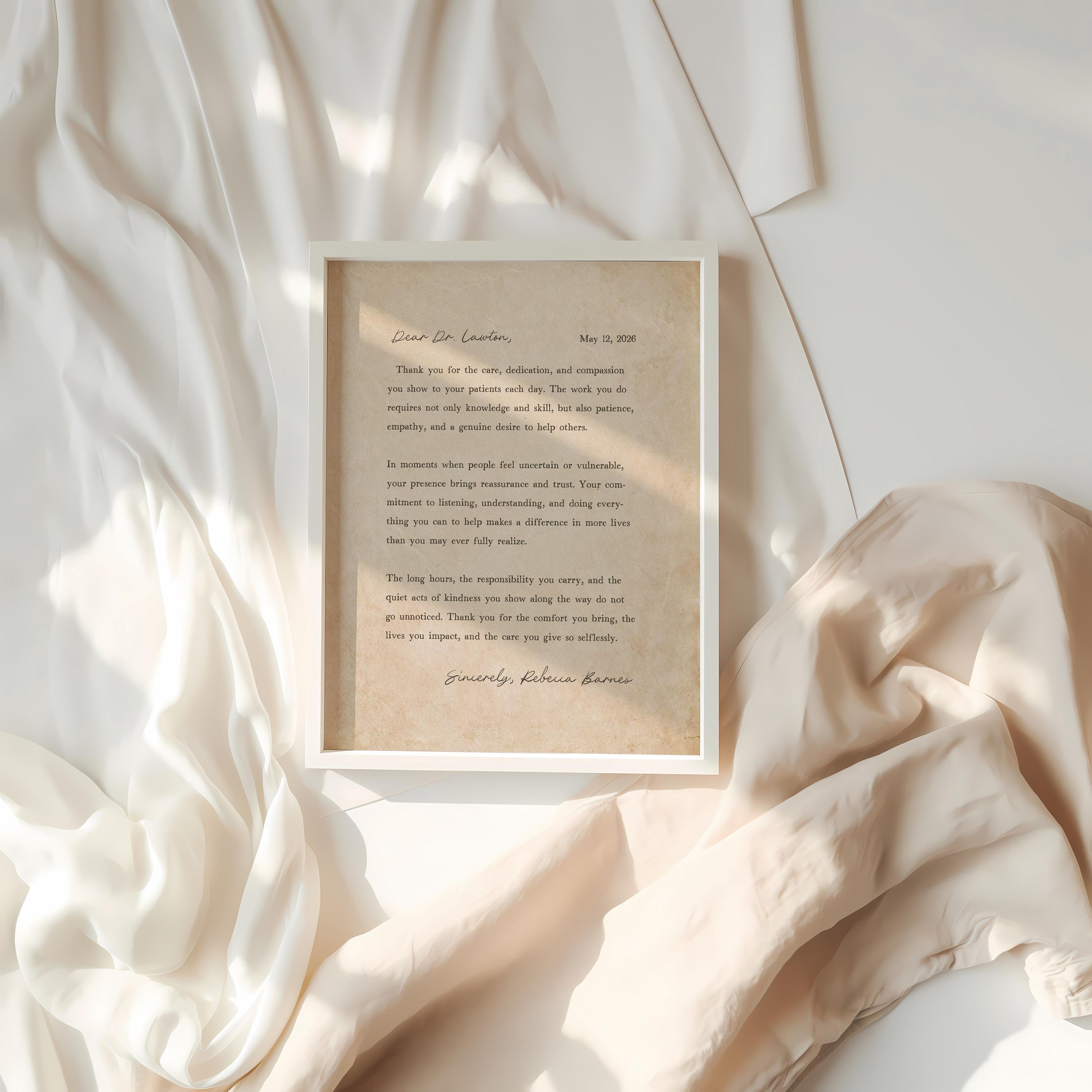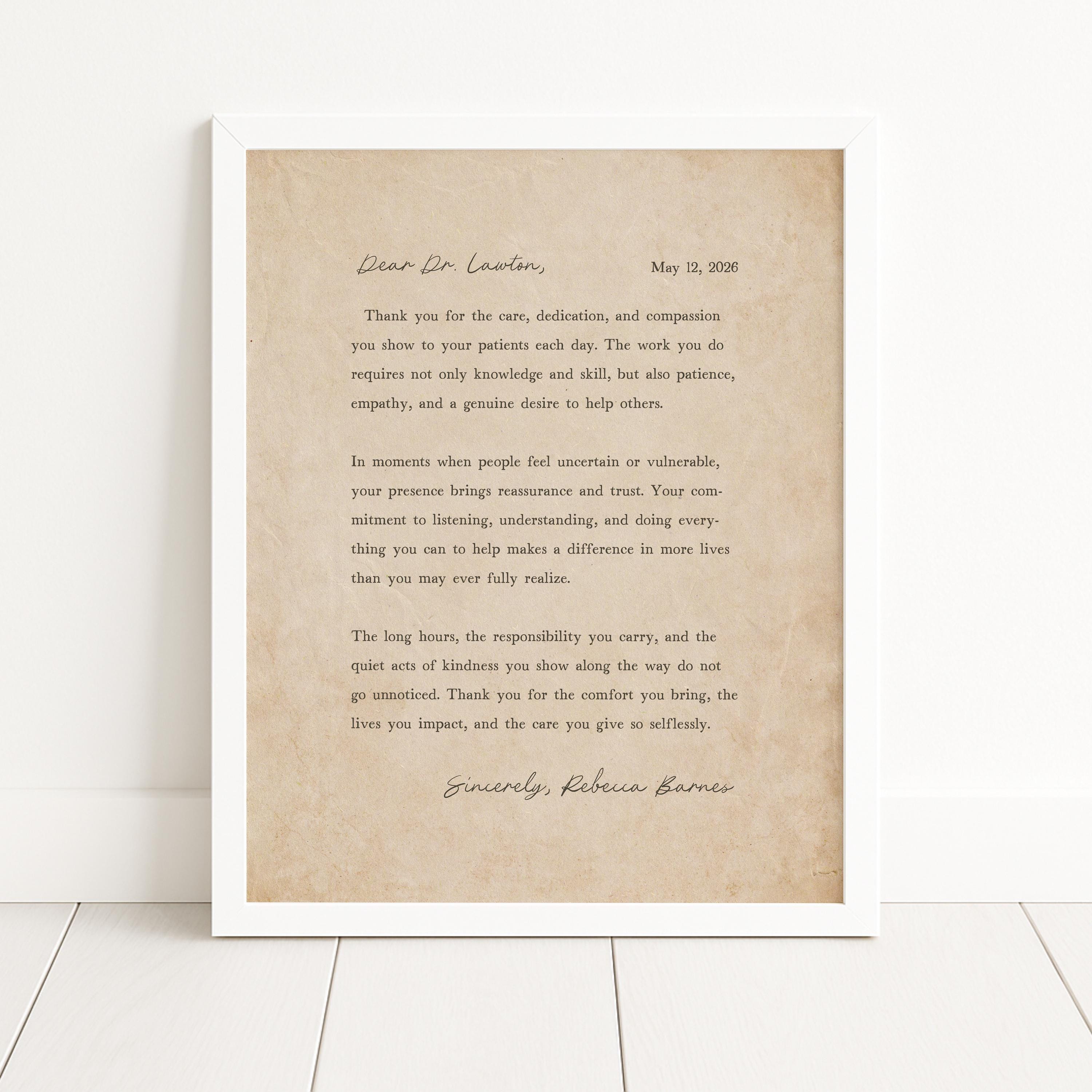 Thank you gift for Doctor. A heartfelt personalized letter designed to celebrate a special Doctor. This custom message wall art transforms your words into a timeless keepsake. Choose your own words or keep the message as shown. It's up to you!