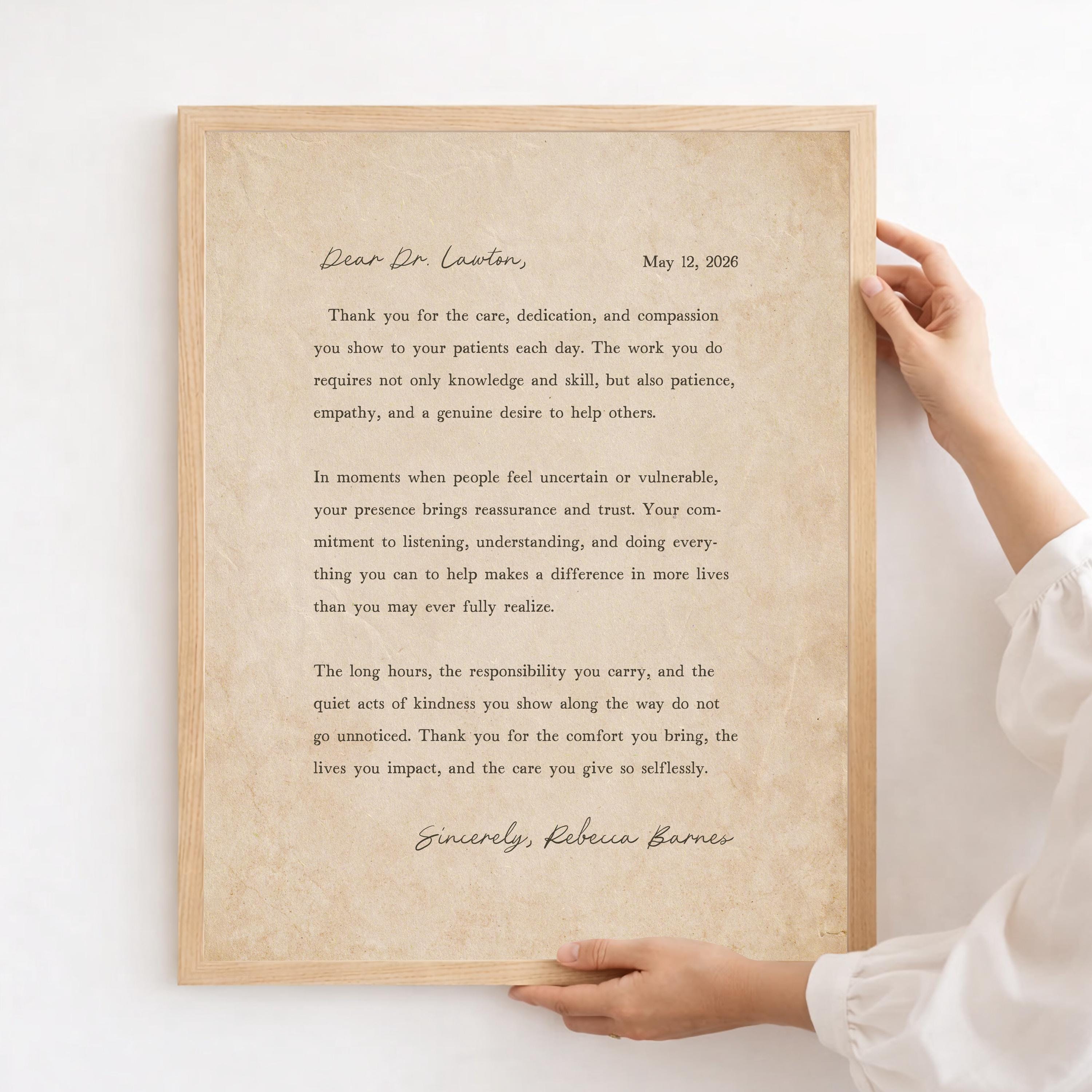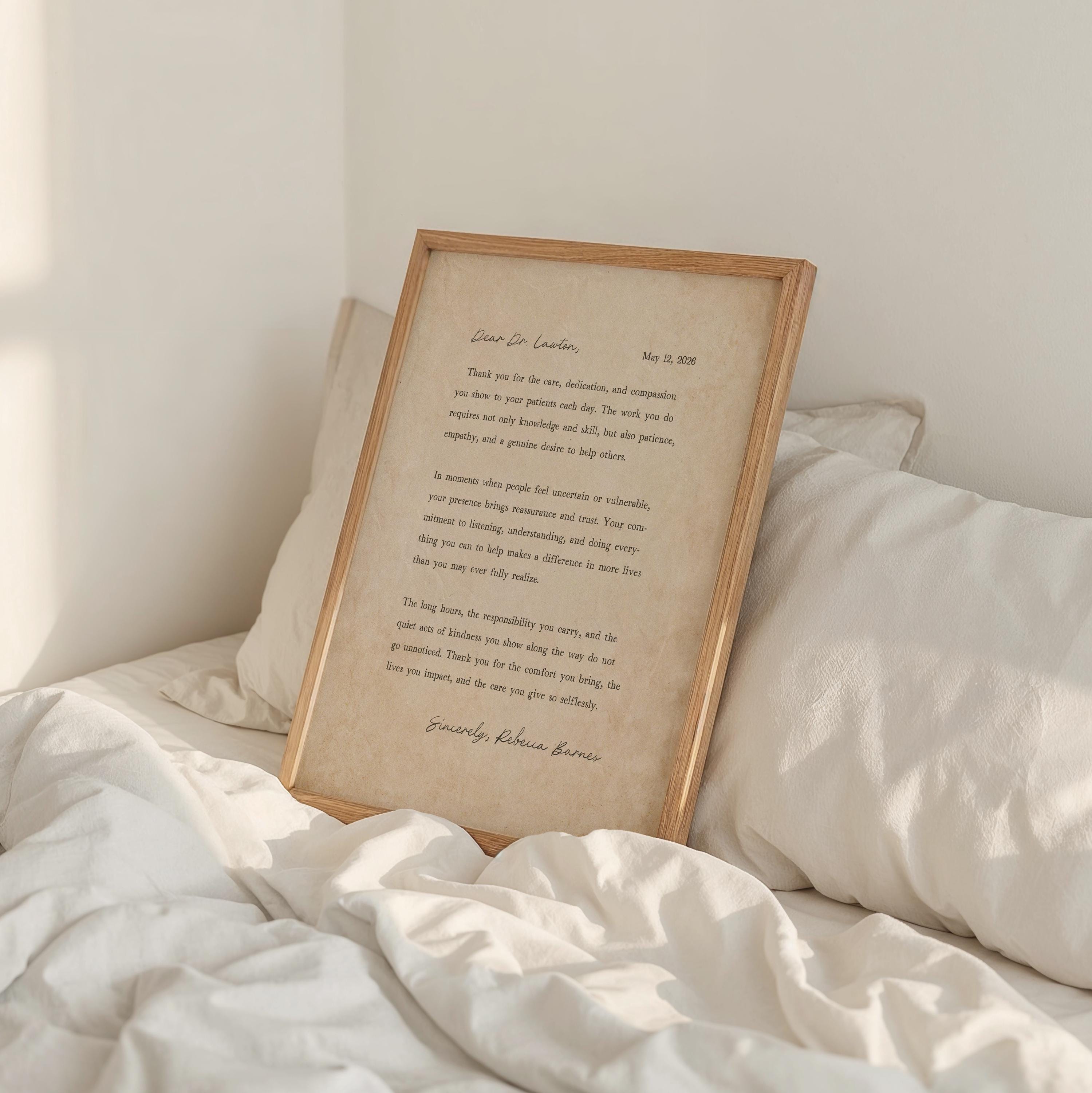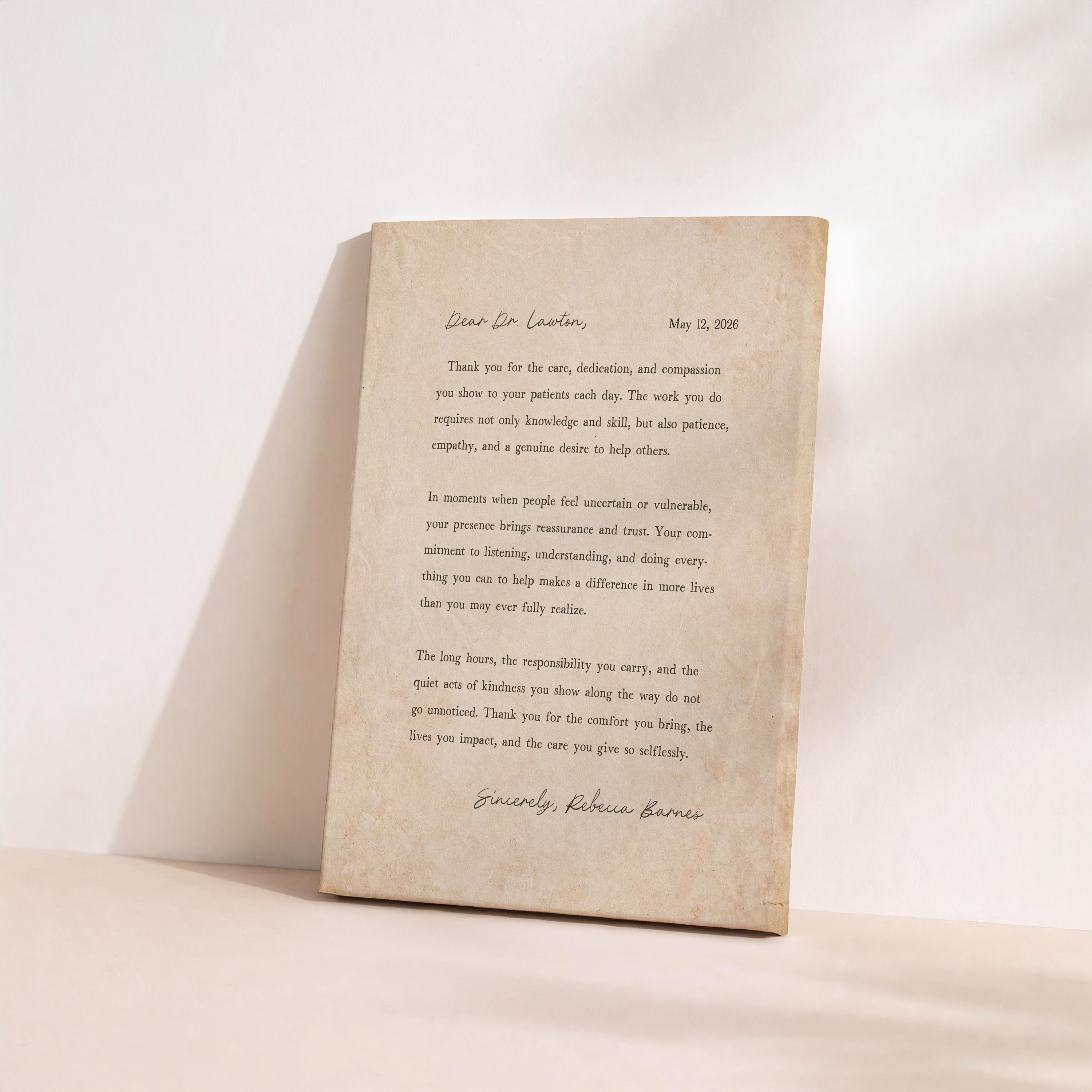 Thank you gift for Doctor. A heartfelt personalized letter designed to celebrate a special Doctor. This custom message wall art transforms your words into a timeless keepsake. Choose your own words or keep the message as shown. It's up to you!