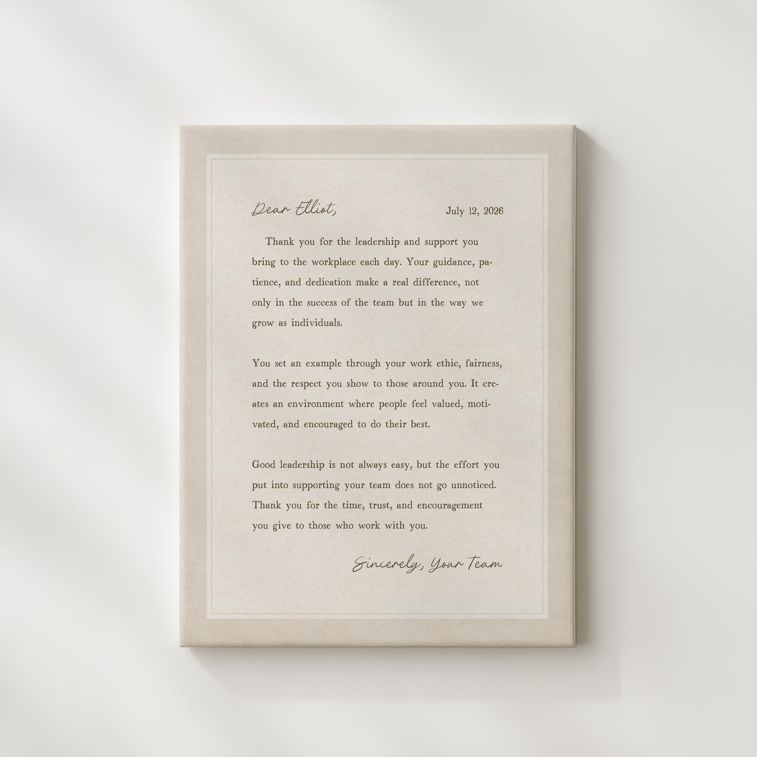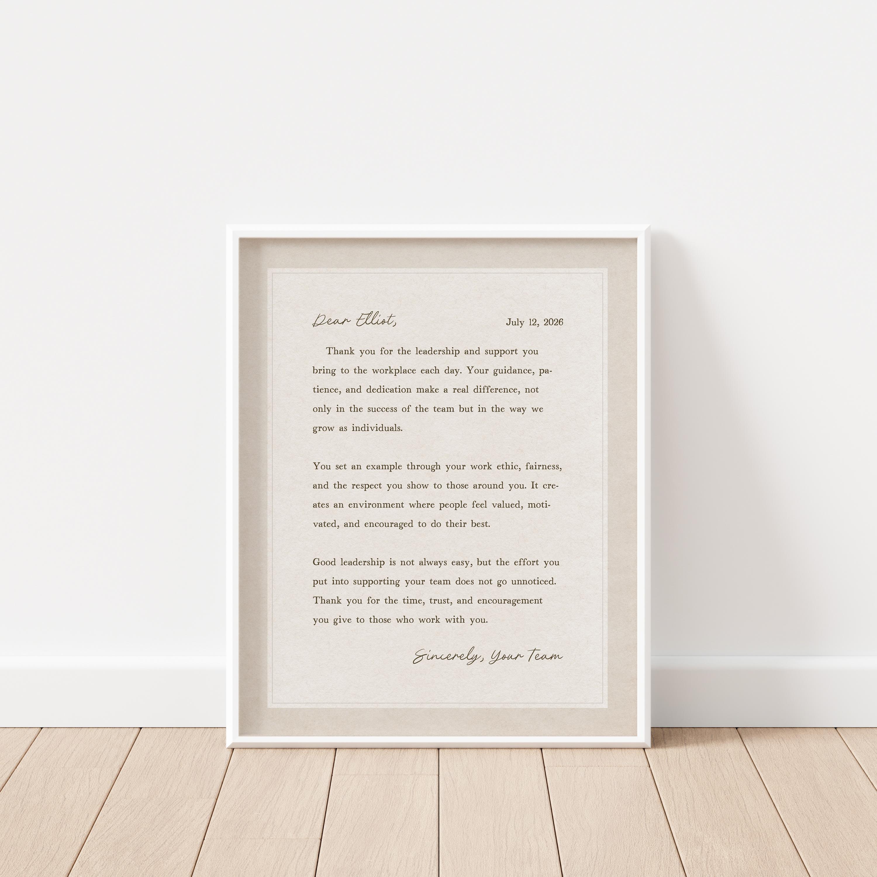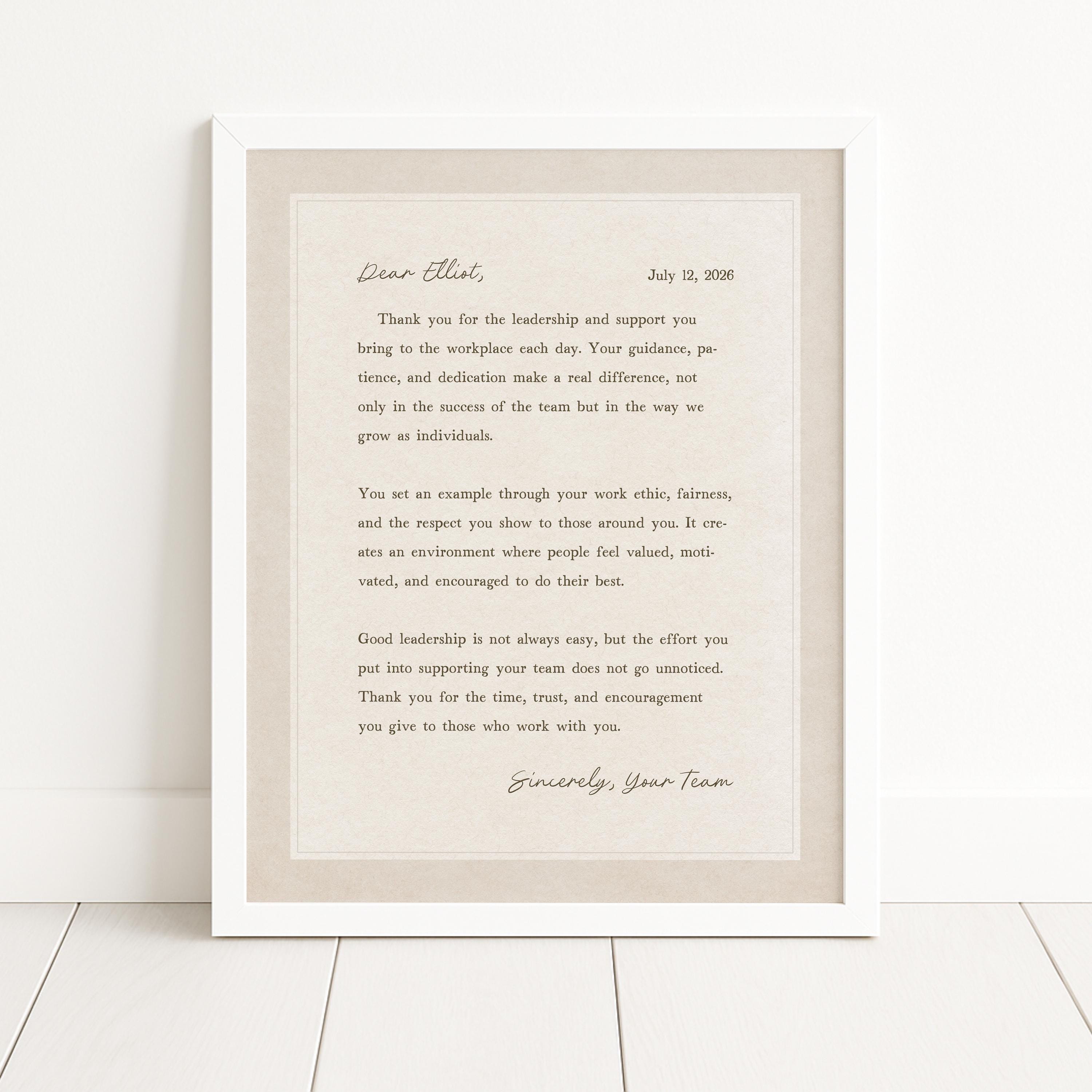 Letter to boss. A heartfelt personalized letter designed to celebrate a special manager. This custom message wall art transforms your words into a timeless keepsake. Choose your own words or keep the message as shown. It's up to you!
