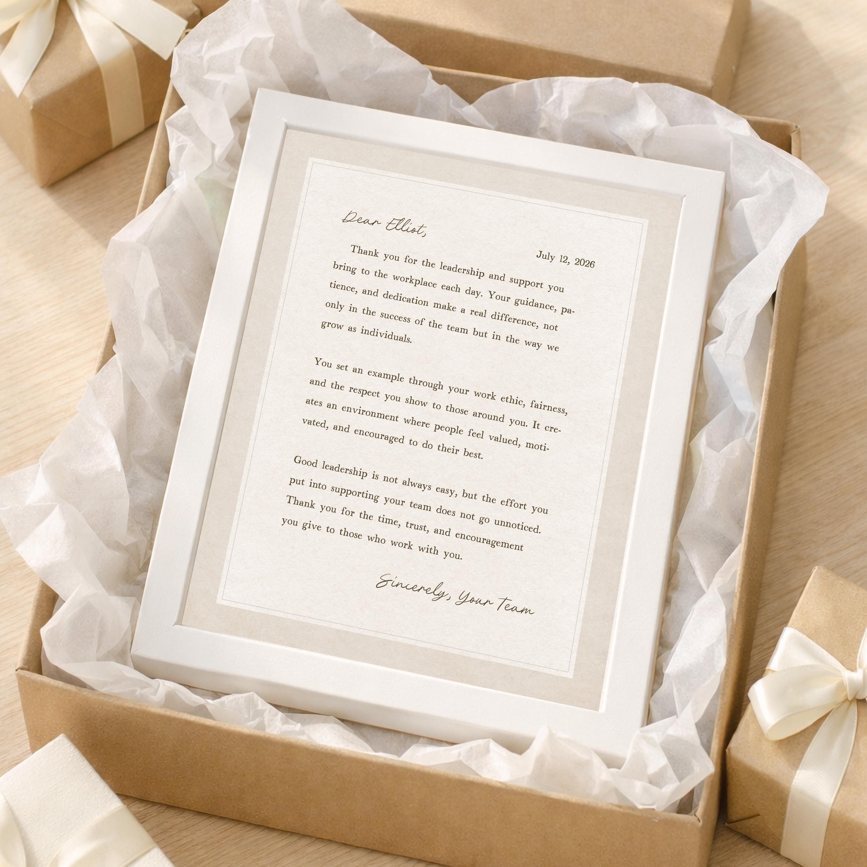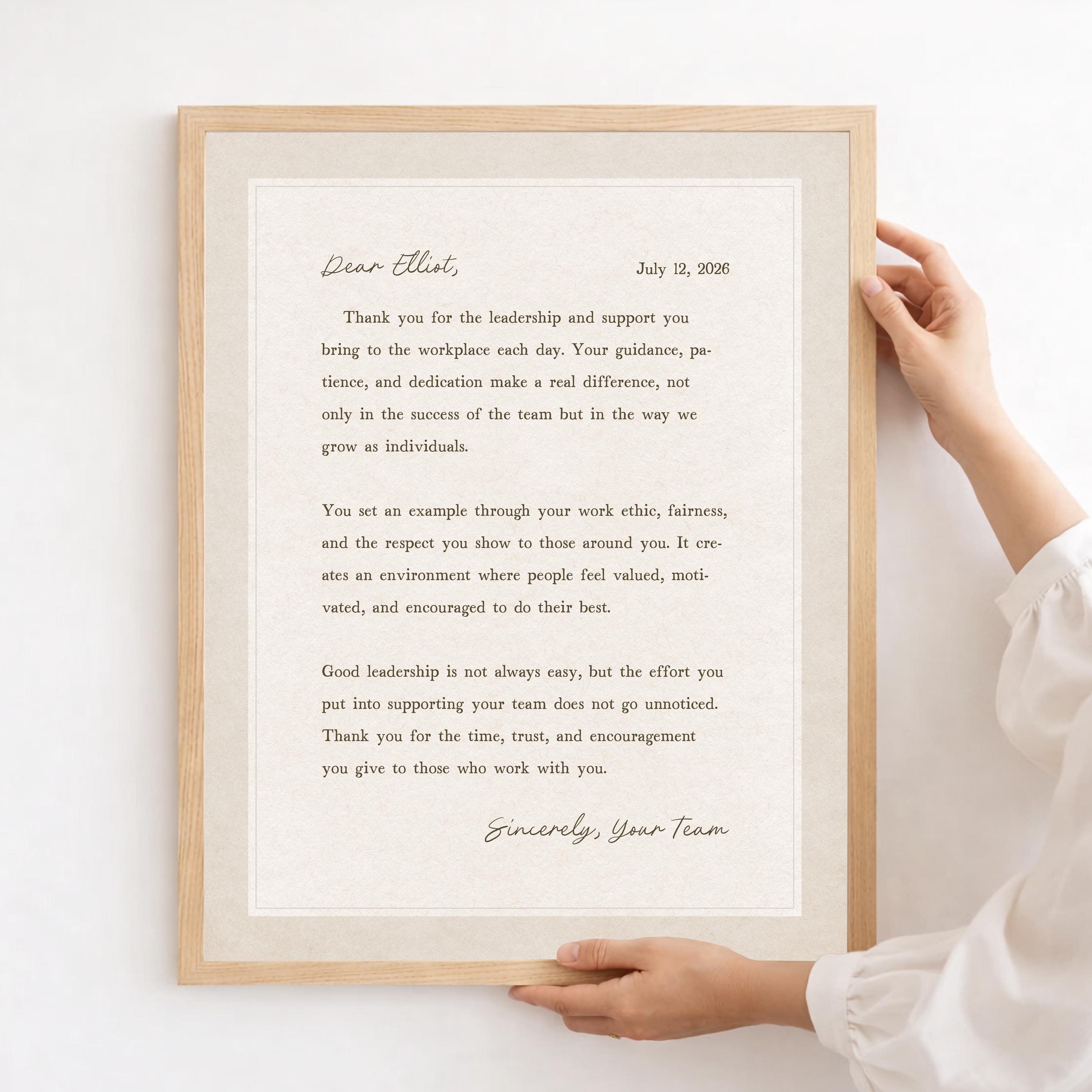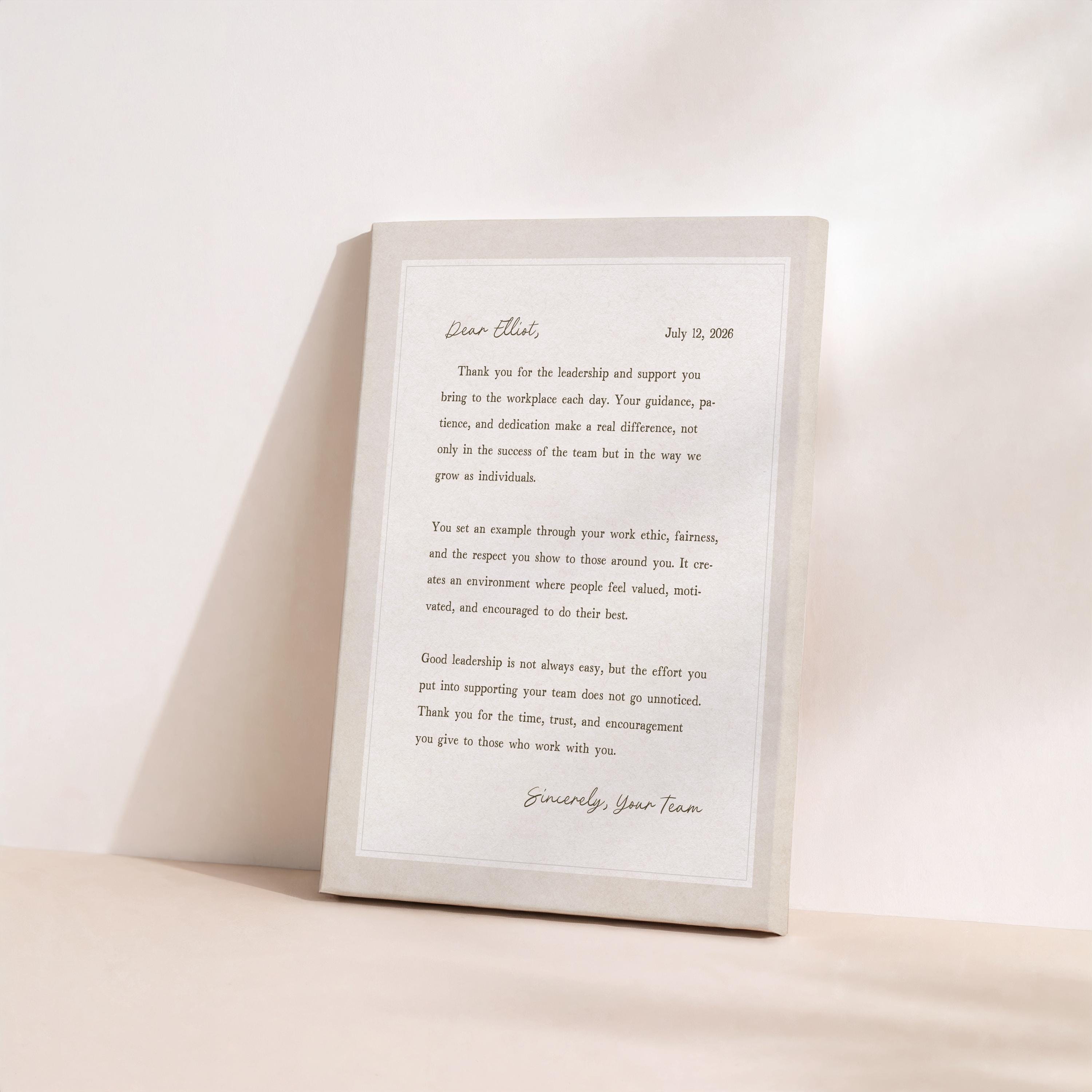 Letter to boss. A heartfelt personalized letter designed to celebrate a special manager. This custom message wall art transforms your words into a timeless keepsake. Choose your own words or keep the message as shown. It's up to you!