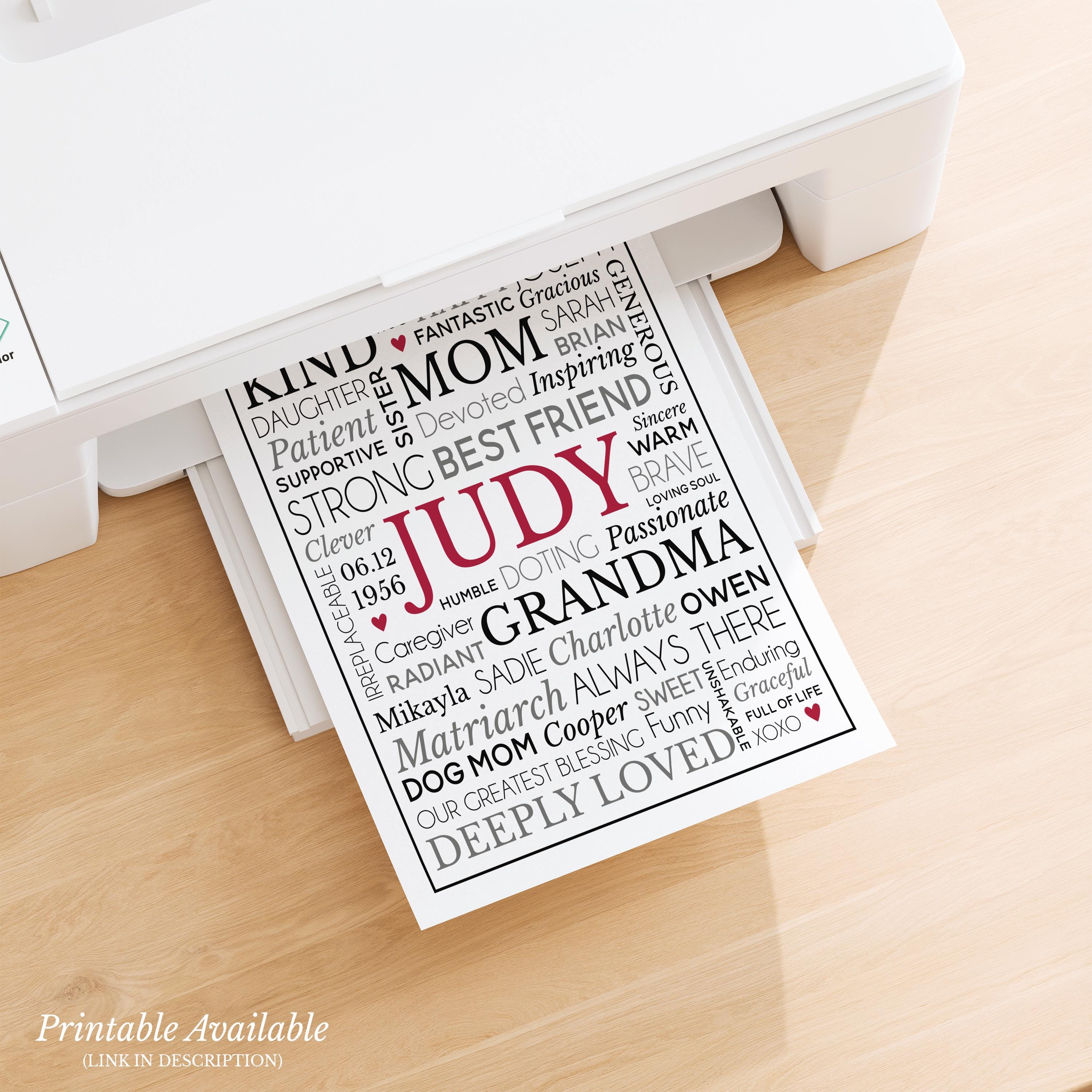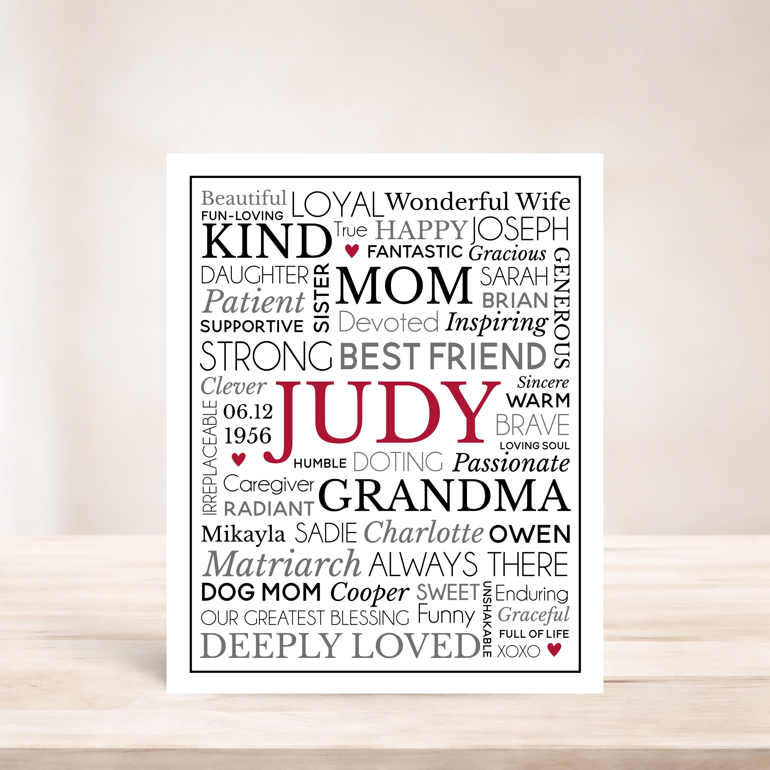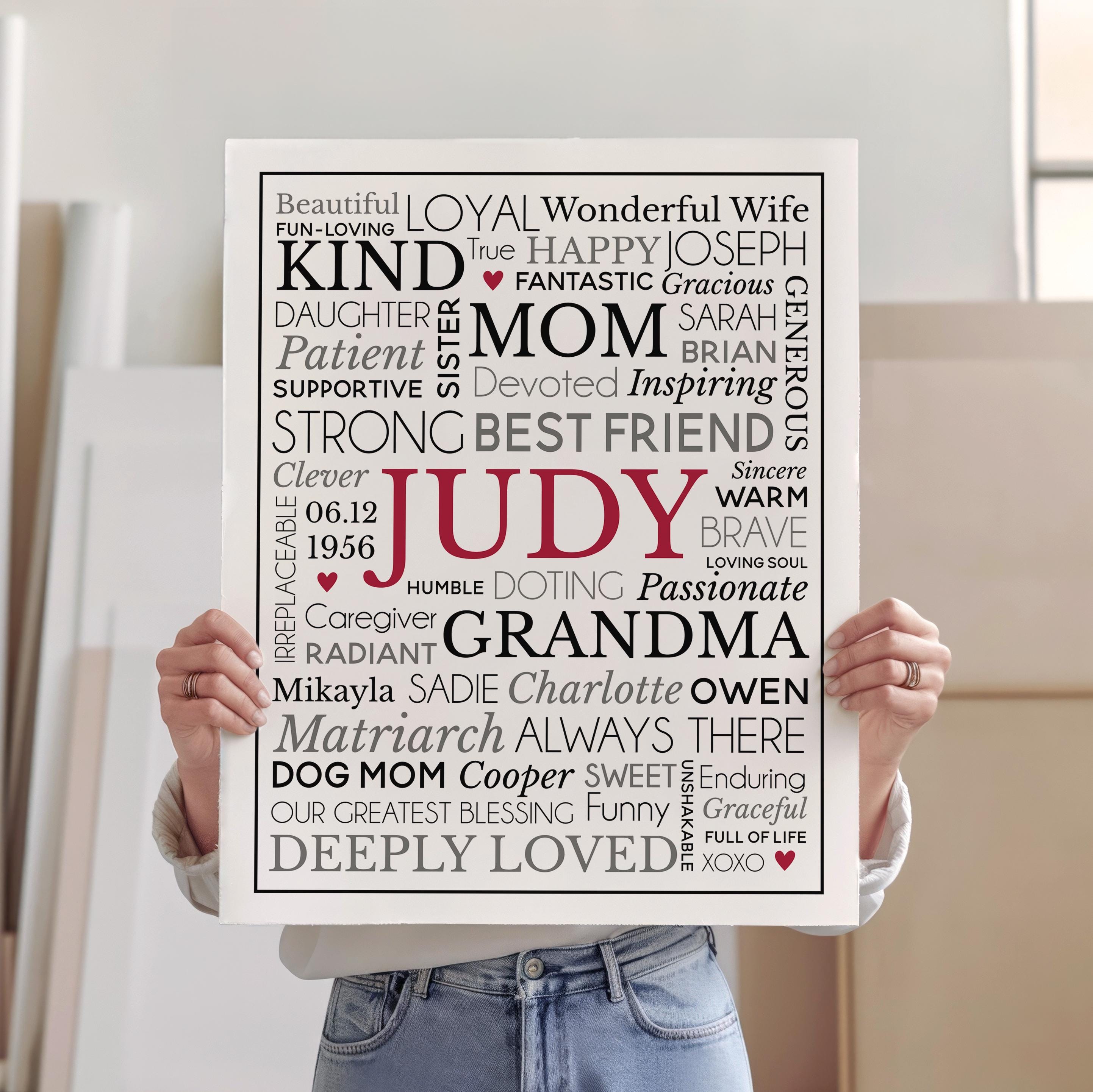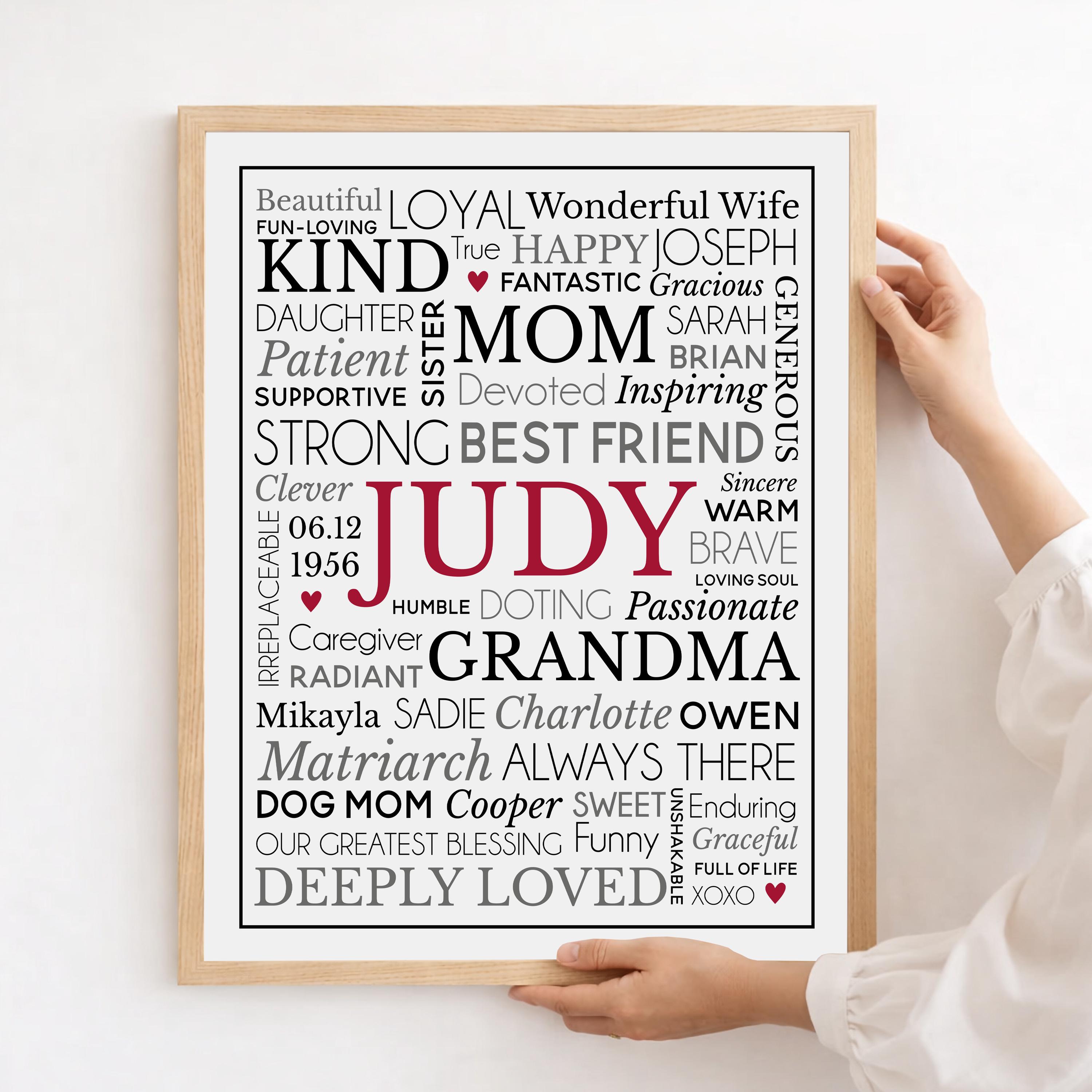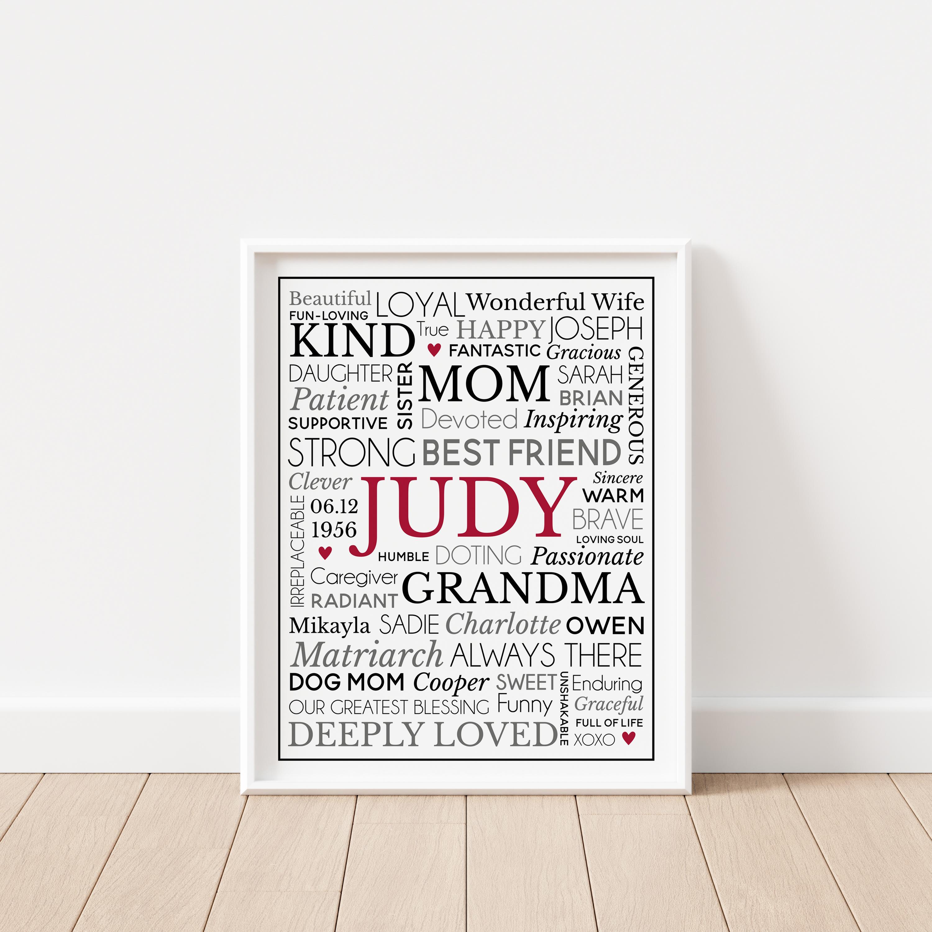 The perfect gift for Mom, Grandma, Wife, or any special woman in your life. This custom word cloud print with be personalized with a name, birthdate and heartfelt words of your choice.