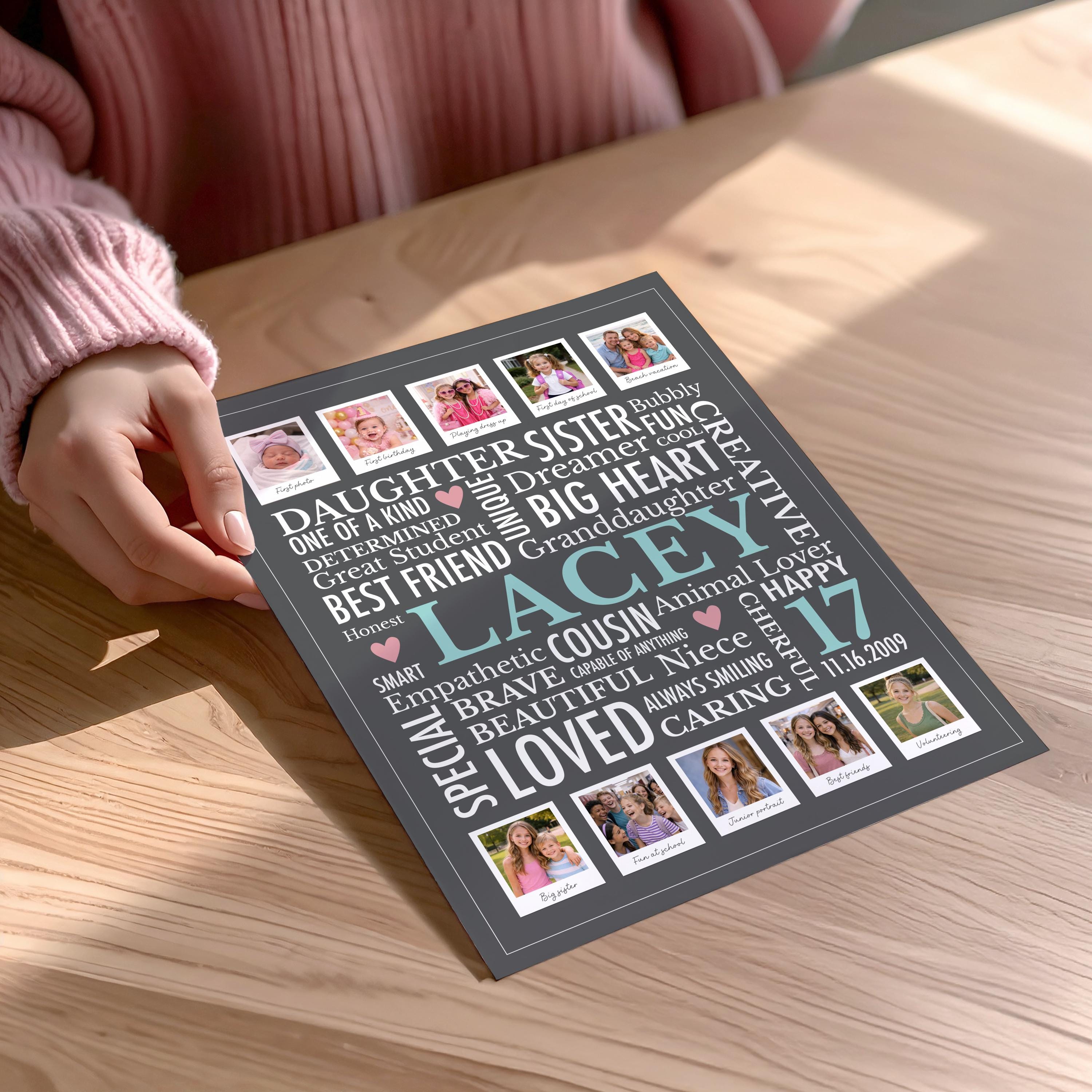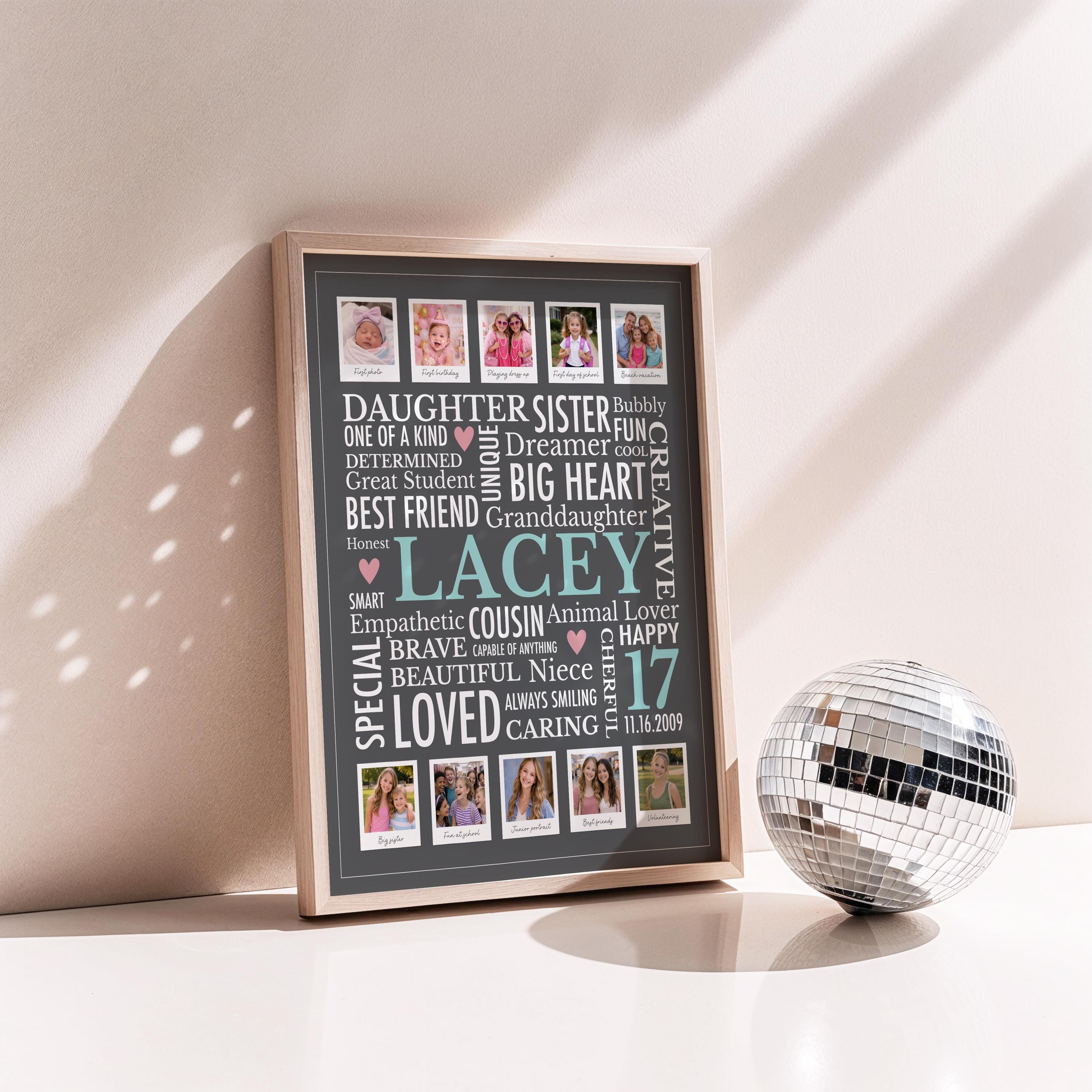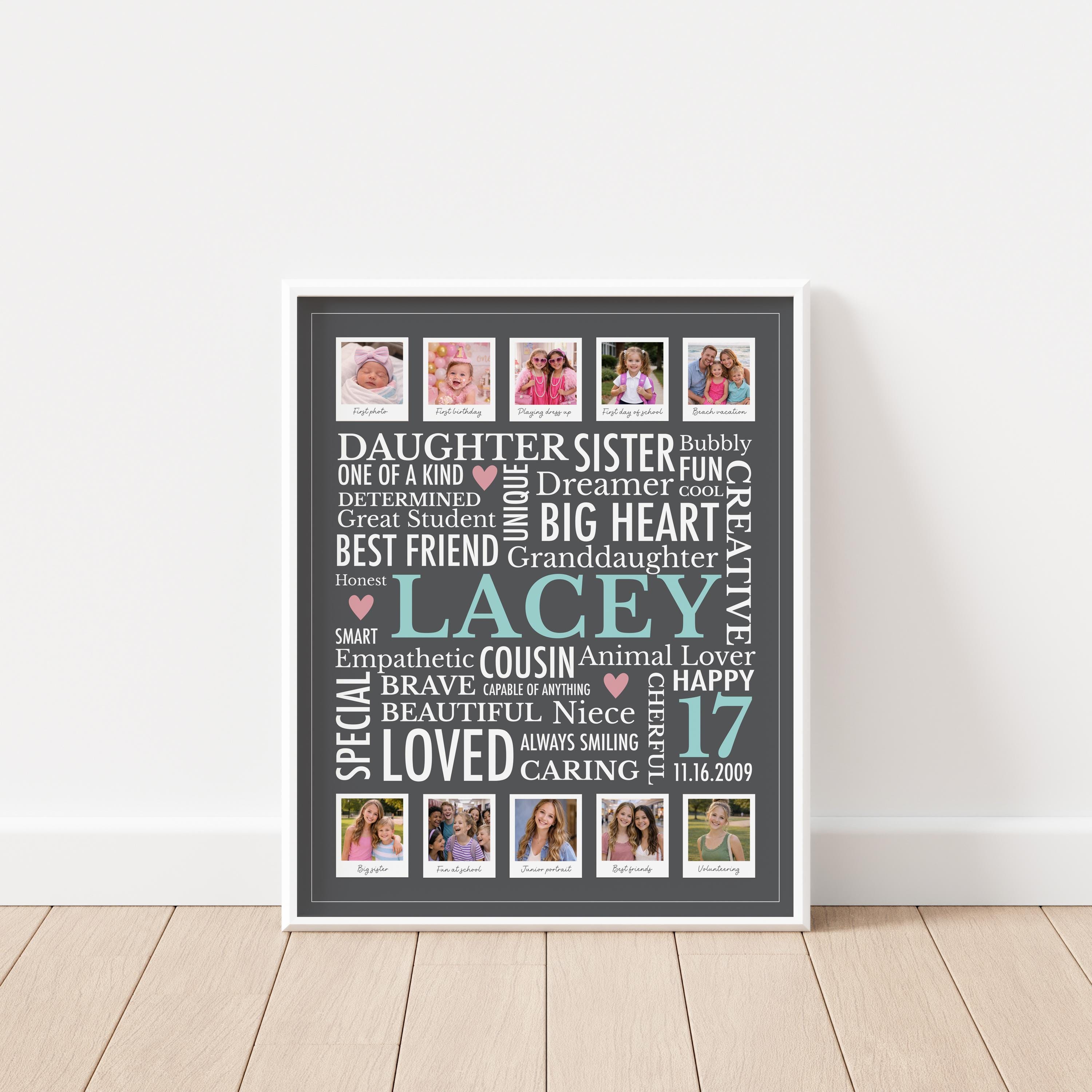 The perfect 17th birthday gift! This custom word cloud print with be personalized with a name, birthdate and heartfelt words of your choice. Also included are 10 special photos with captions.