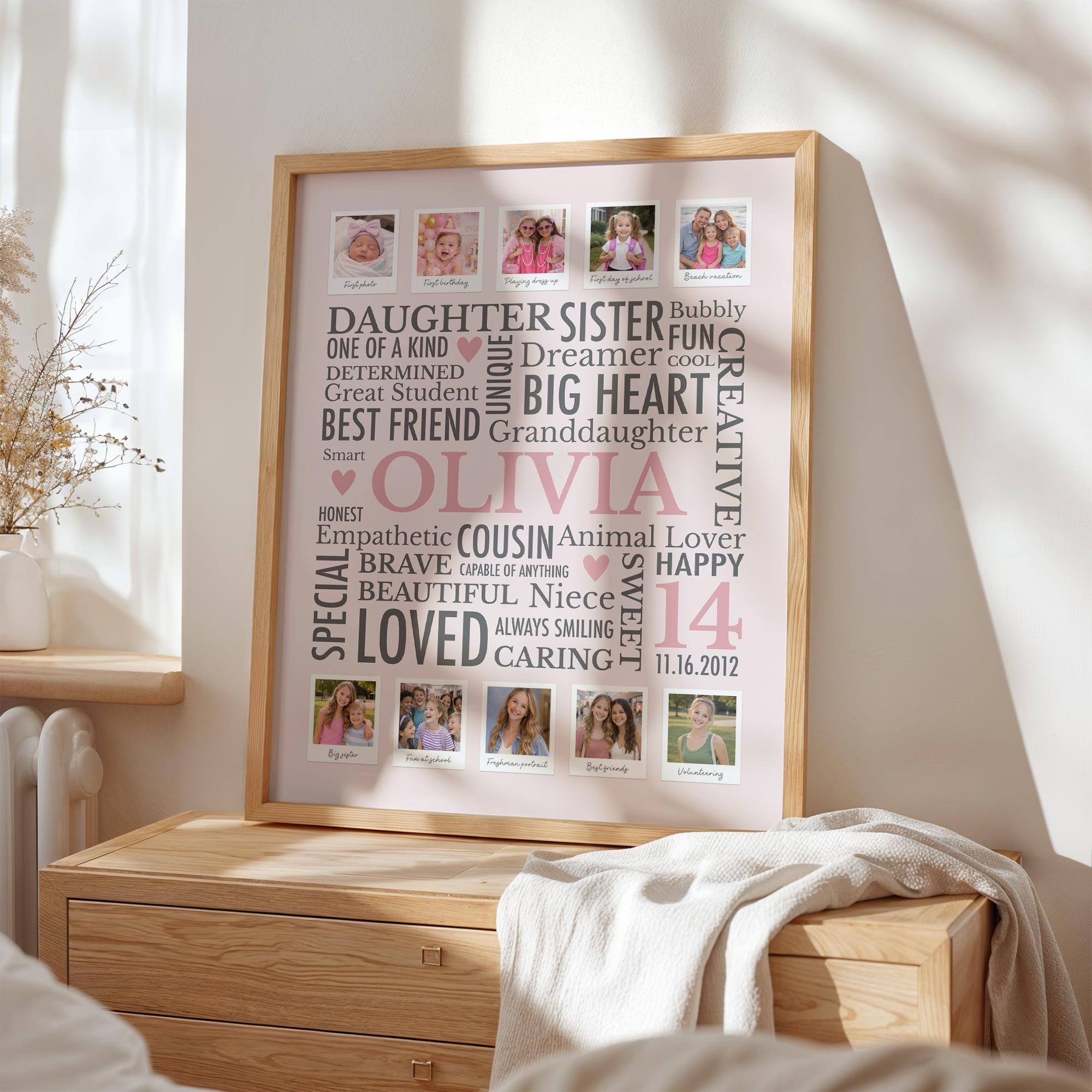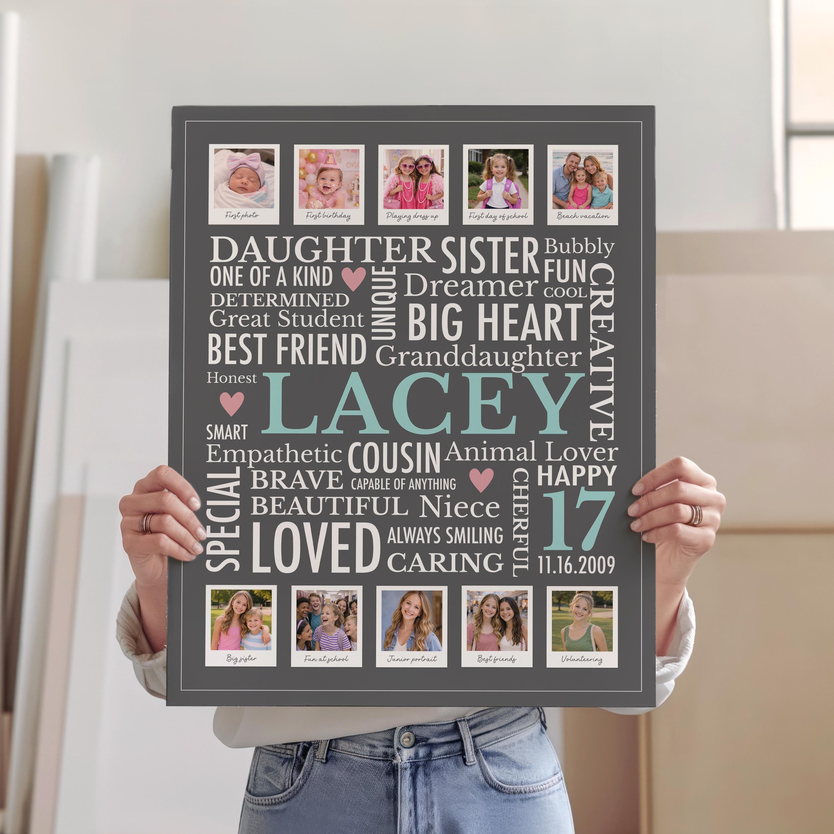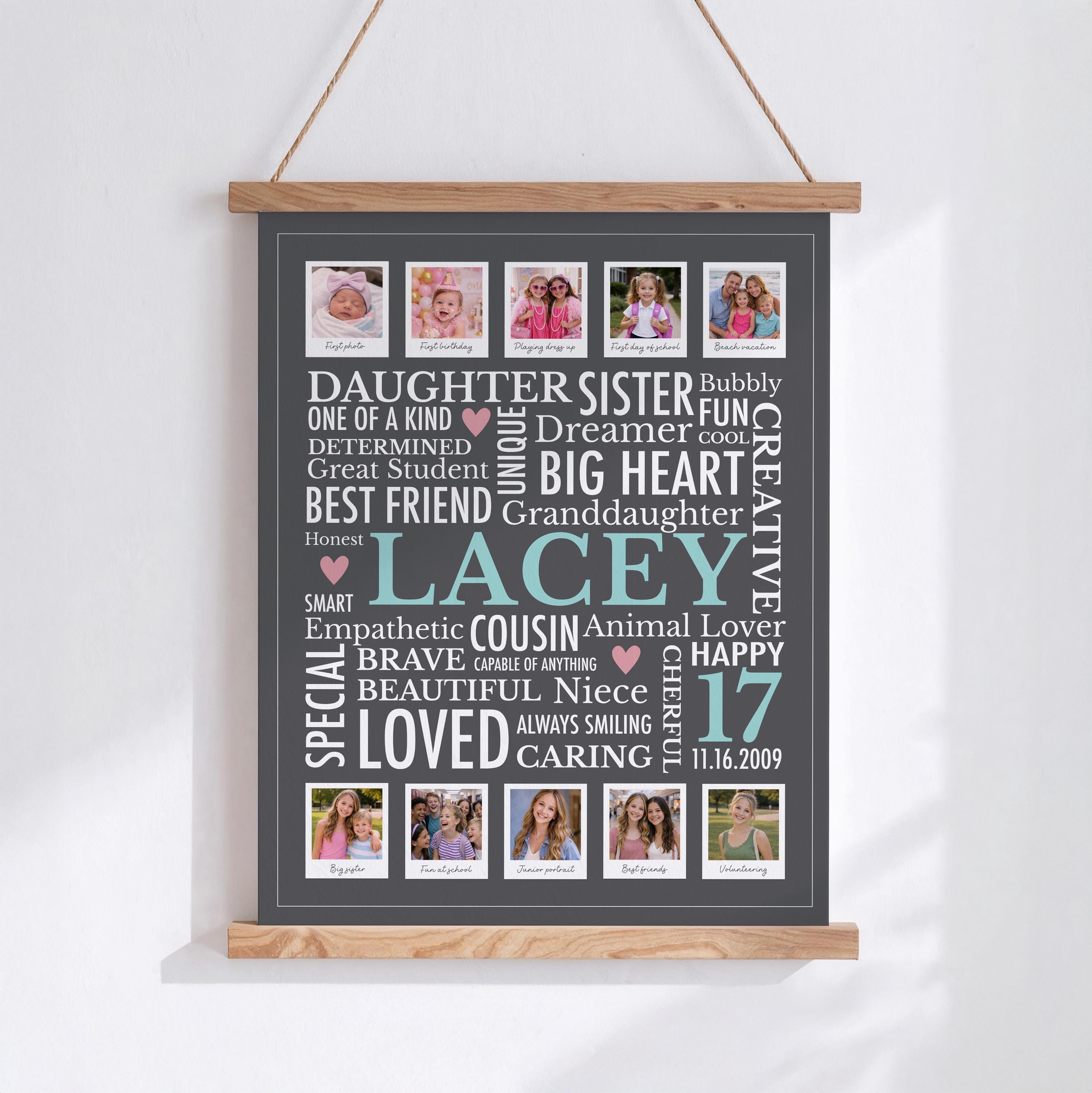 The perfect 17th birthday gift! This custom word cloud print with be personalized with a name, birthdate and heartfelt words of your choice. Also included are 10 special photos with captions.