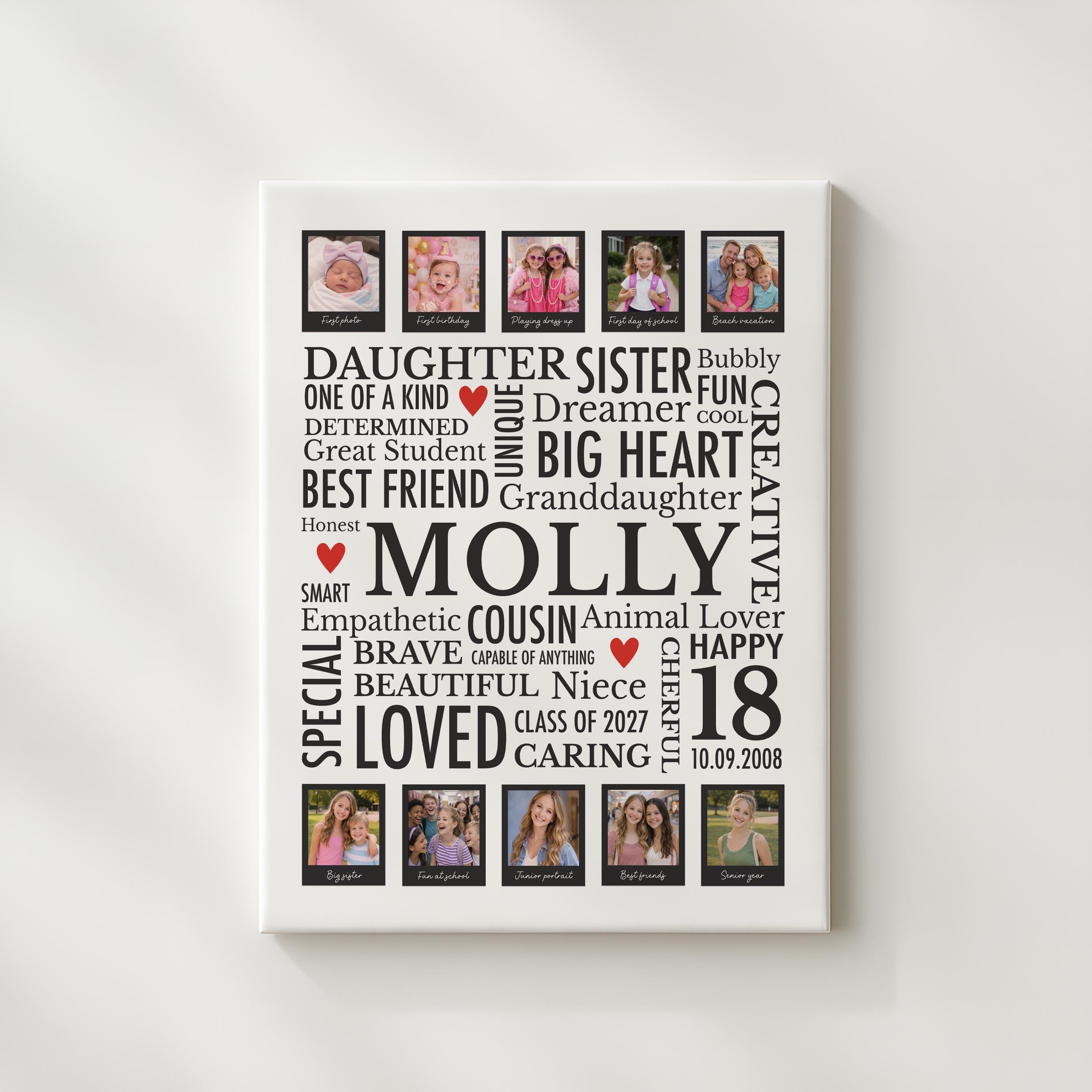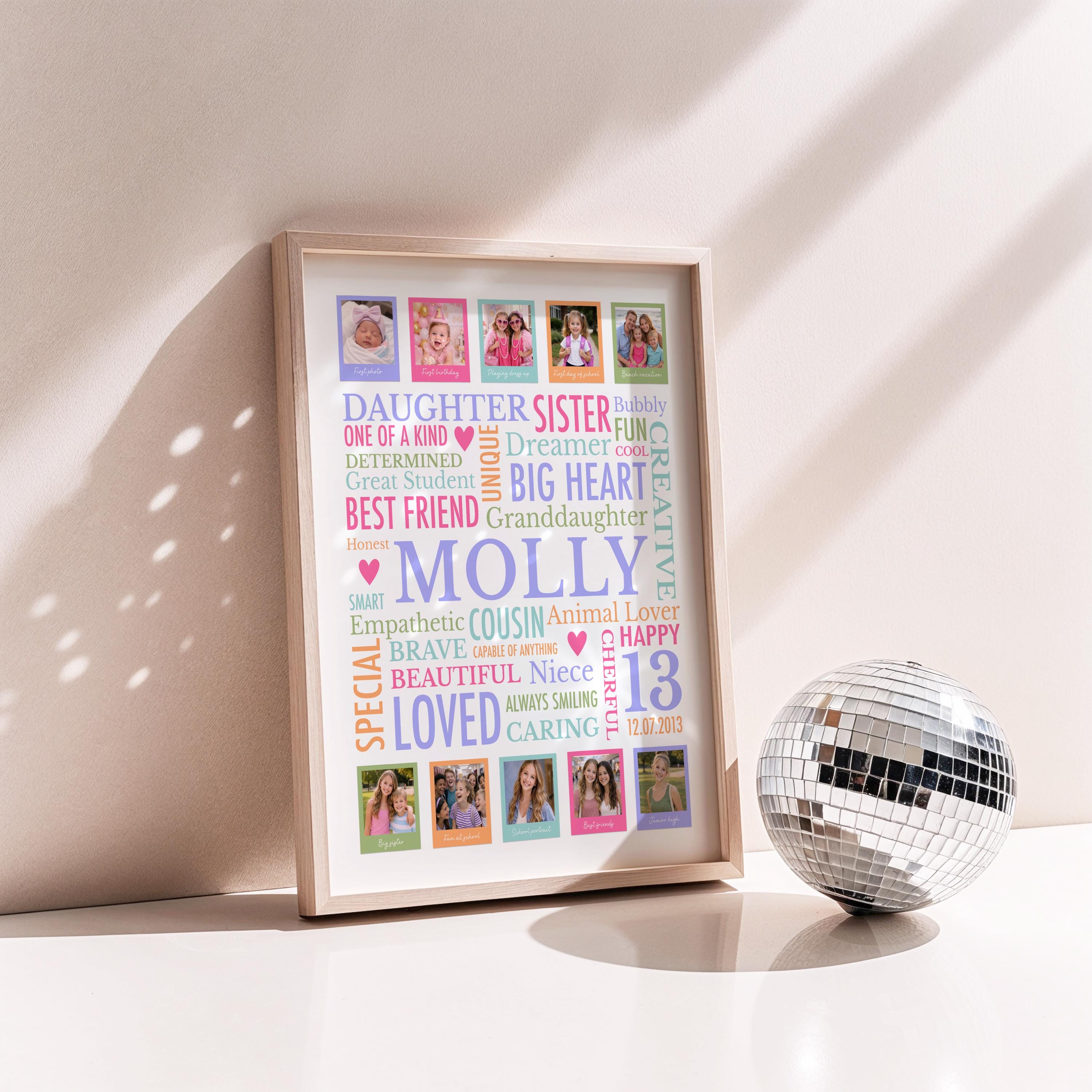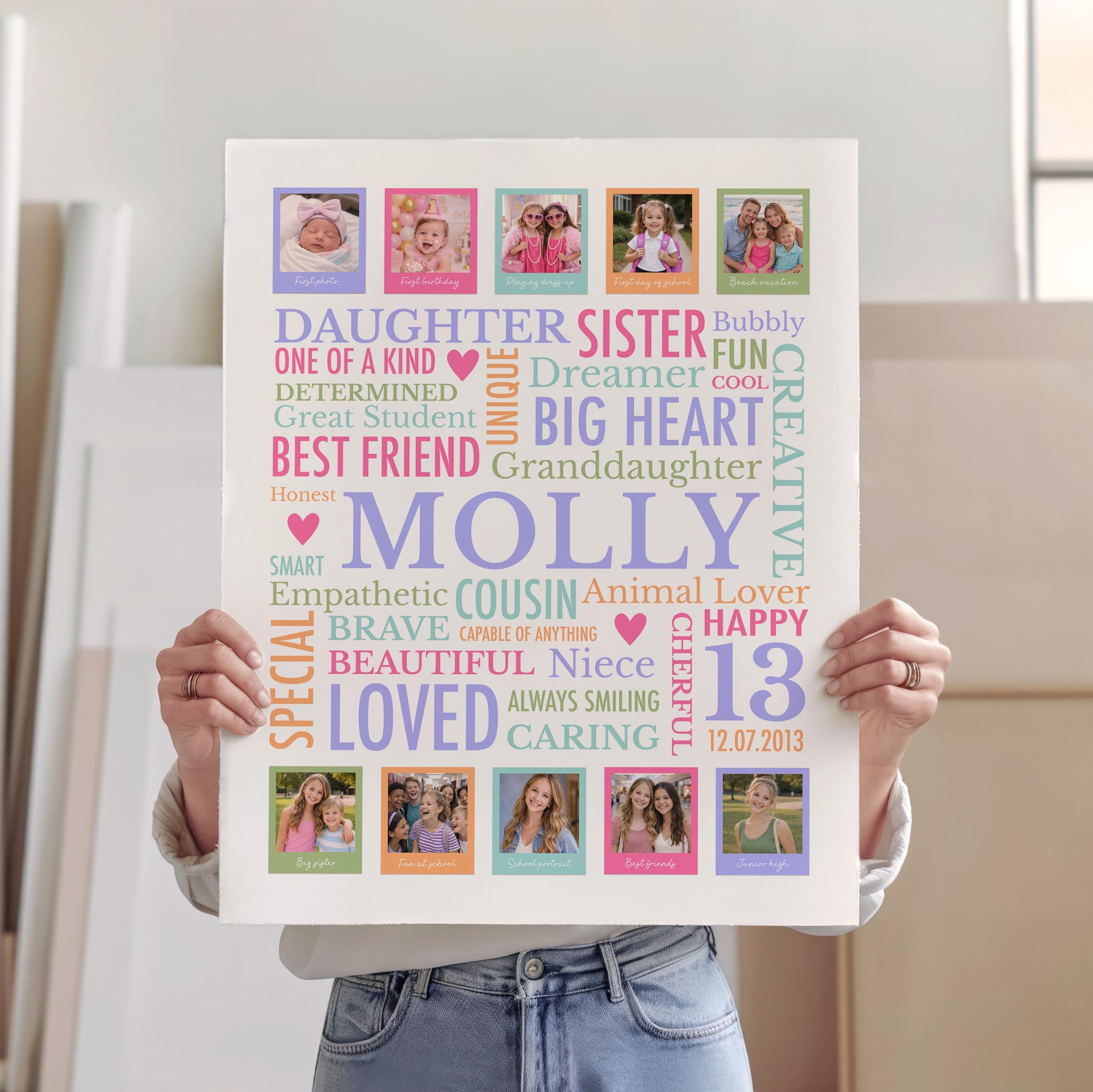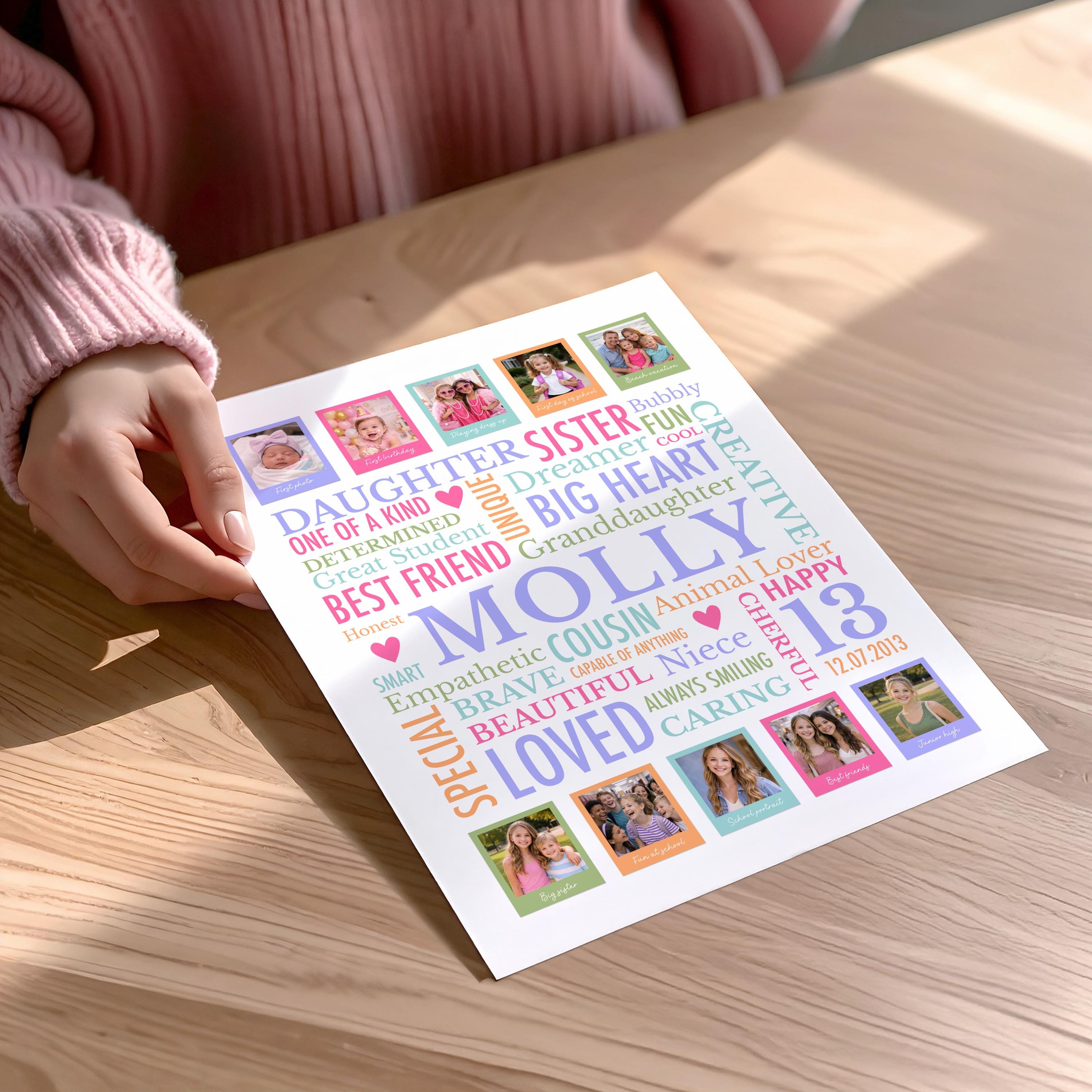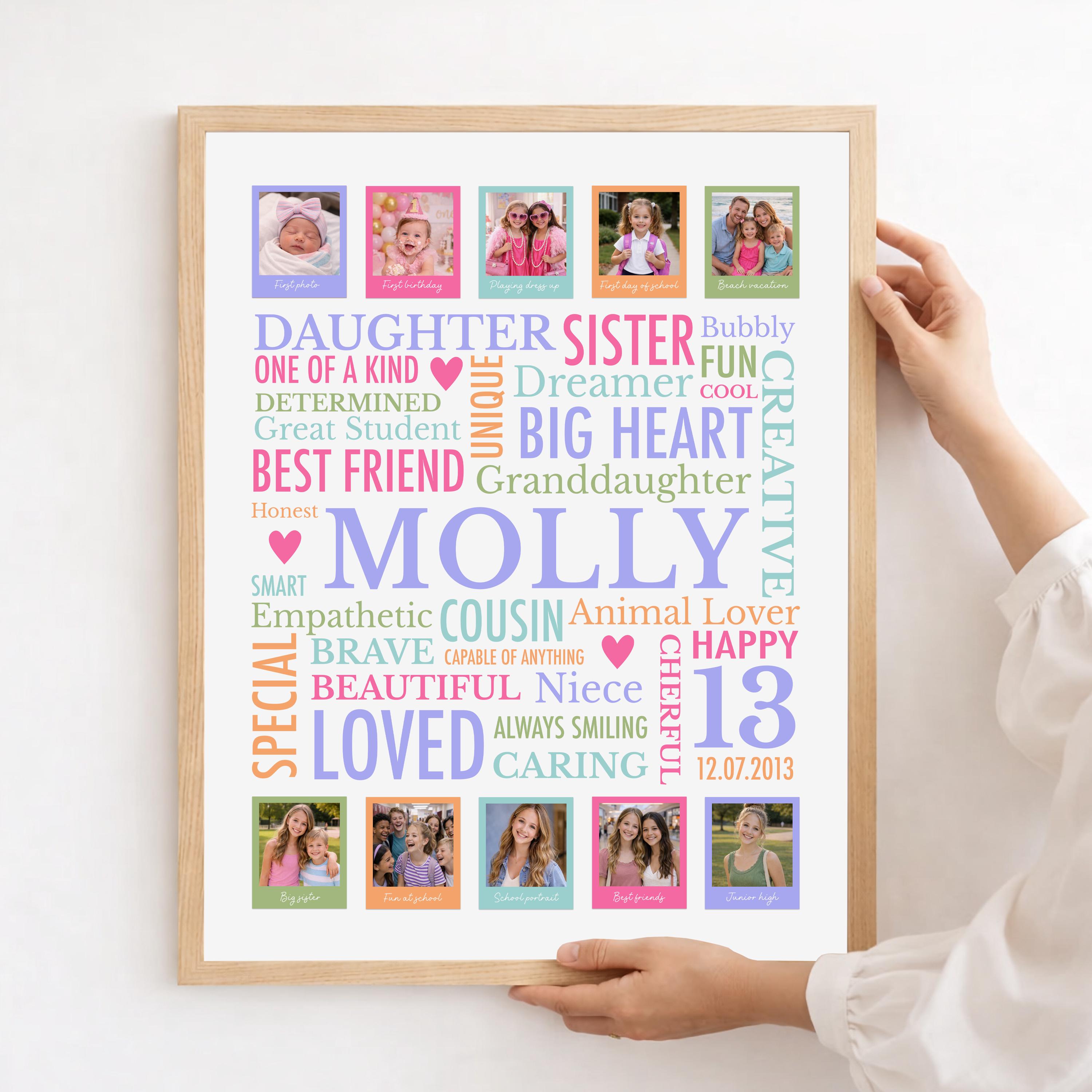 The perfect 13th birthday gift! This custom word cloud print with be personalized with a name, birthdate and heartfelt words of your choice. Also included are 10 special photos with captions.