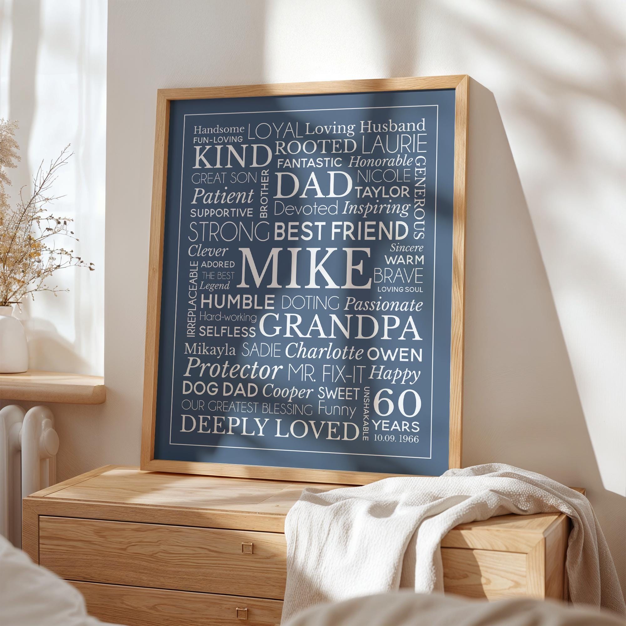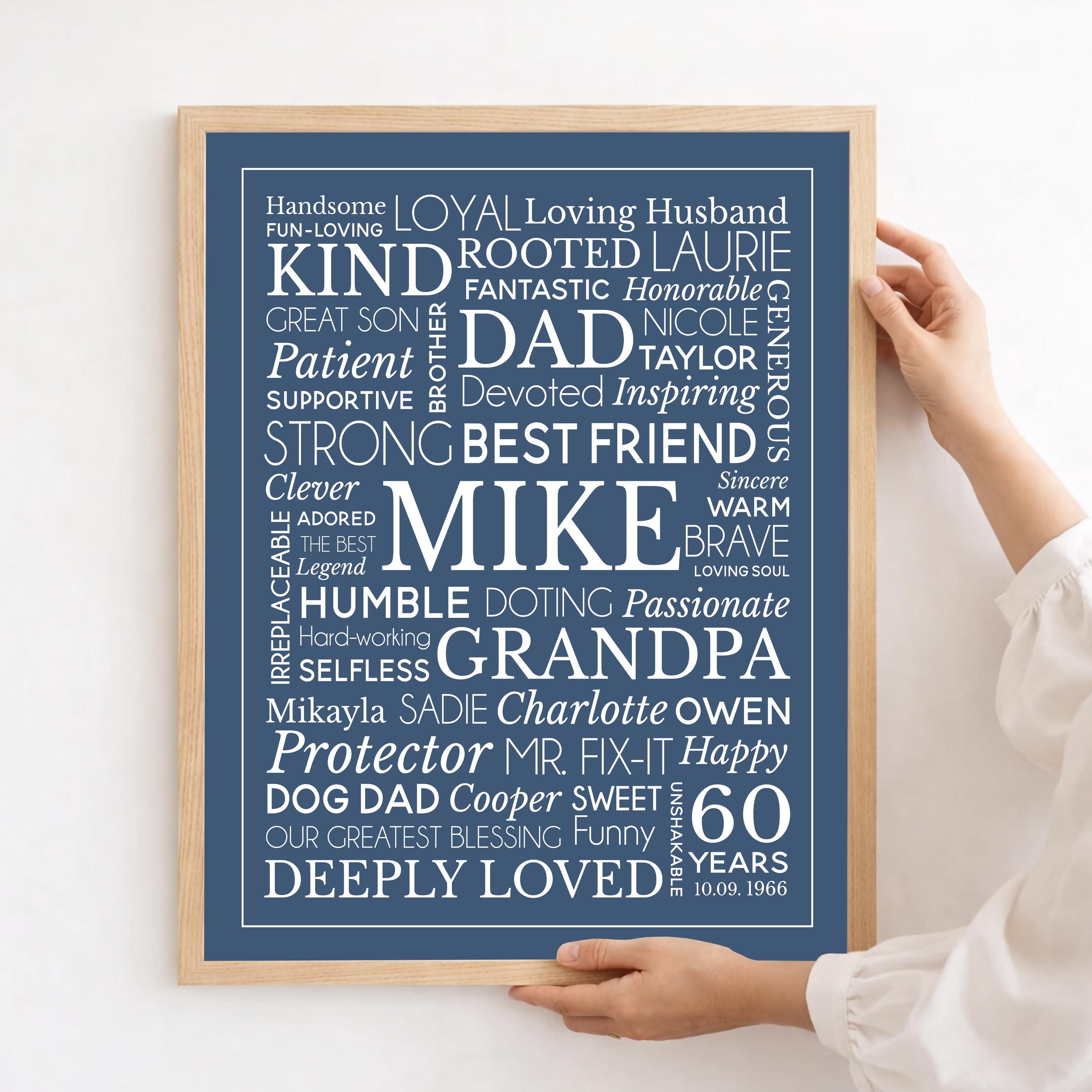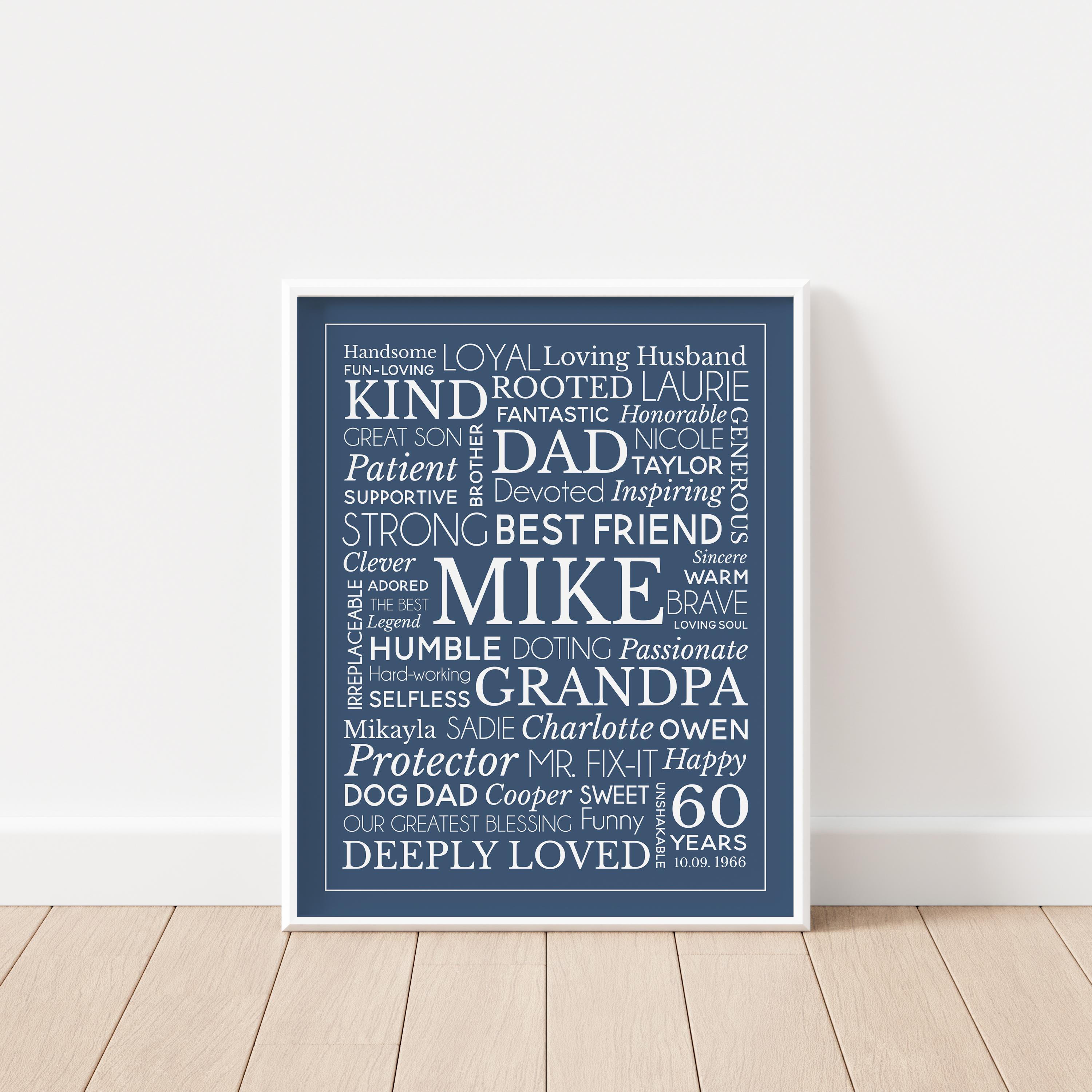 60th birthday gift. The perfect way to celebrate a Dad, Grandpa, Husband, or any special man in your life. This custom word cloud print with be personalized with a name, birthdate and heartfelt words of your choice.