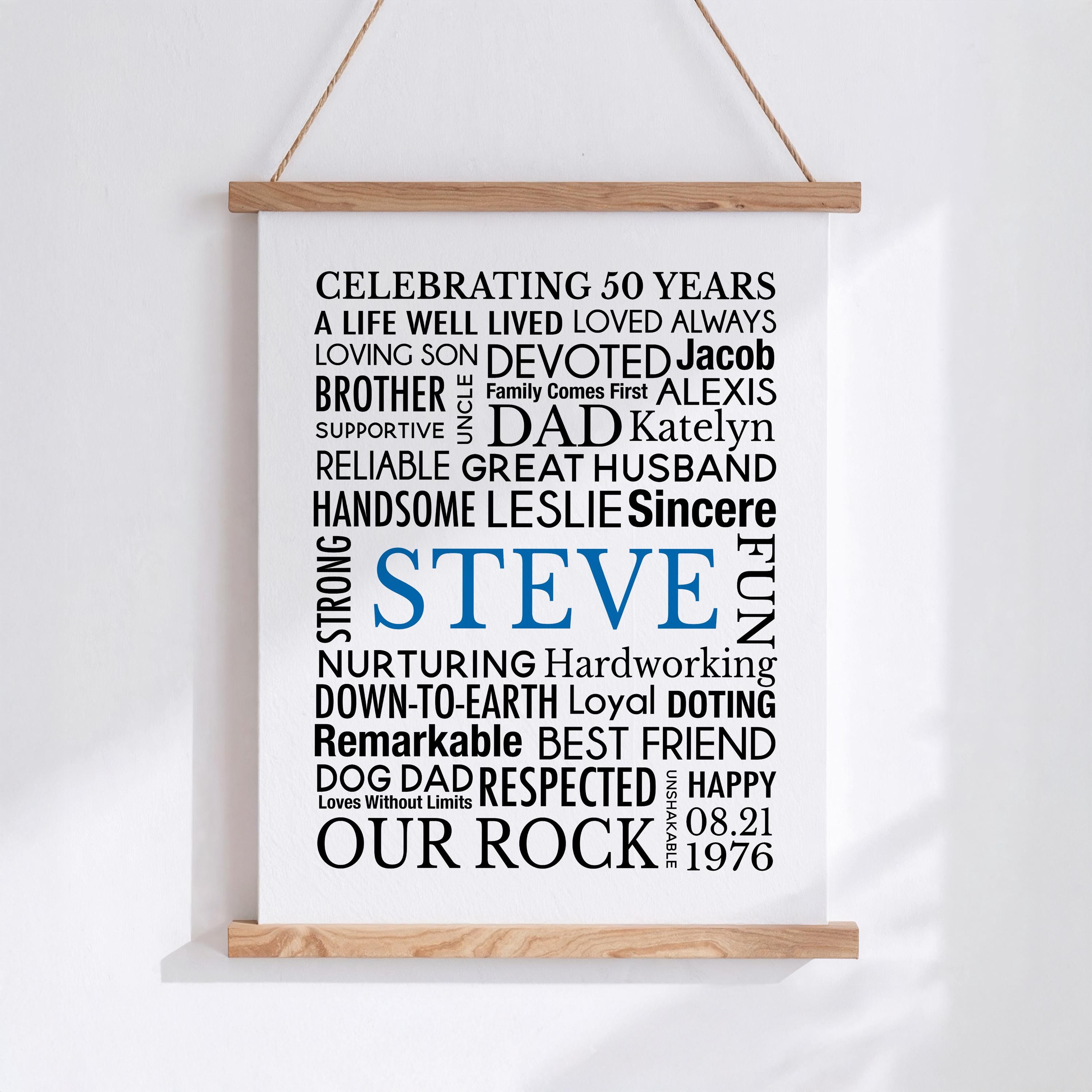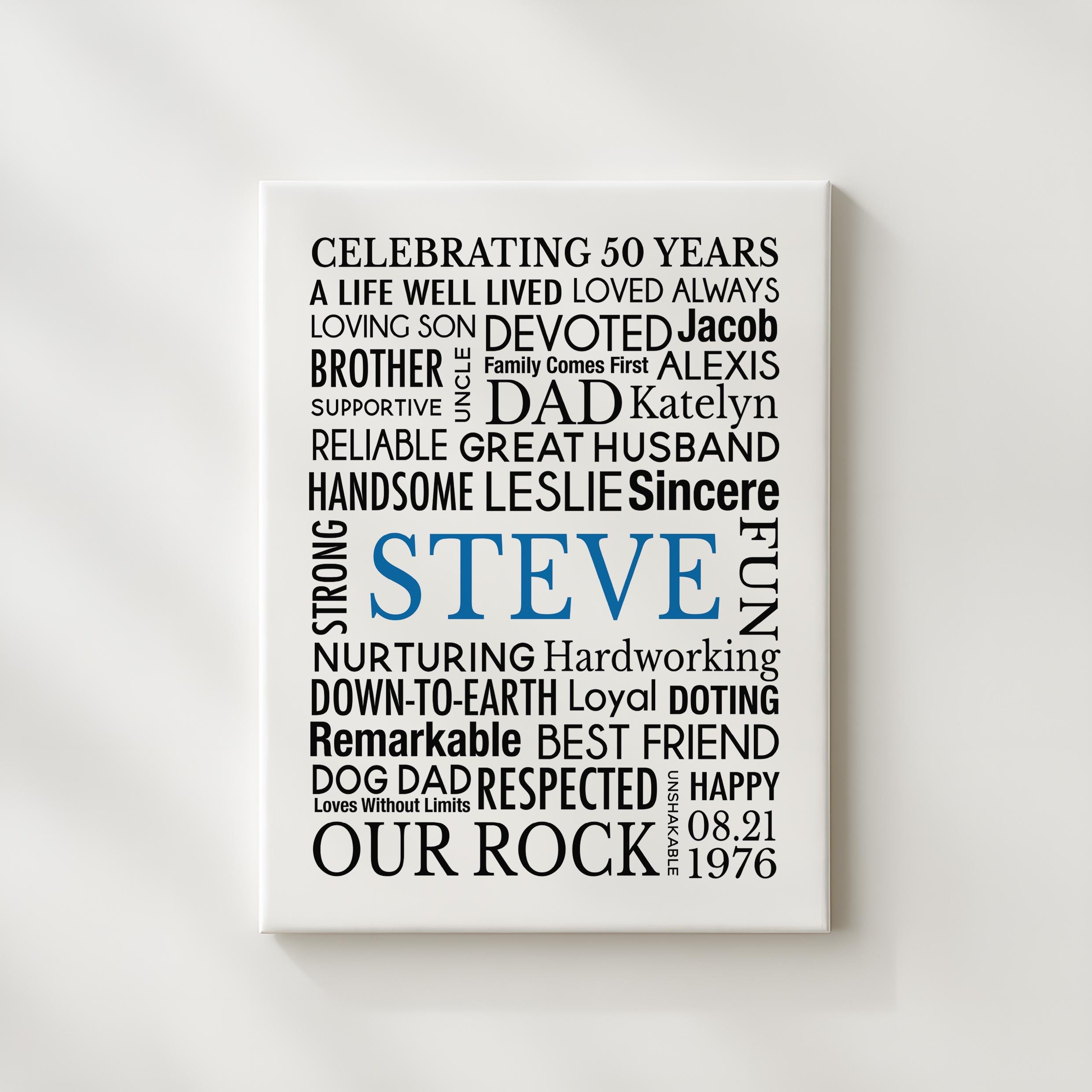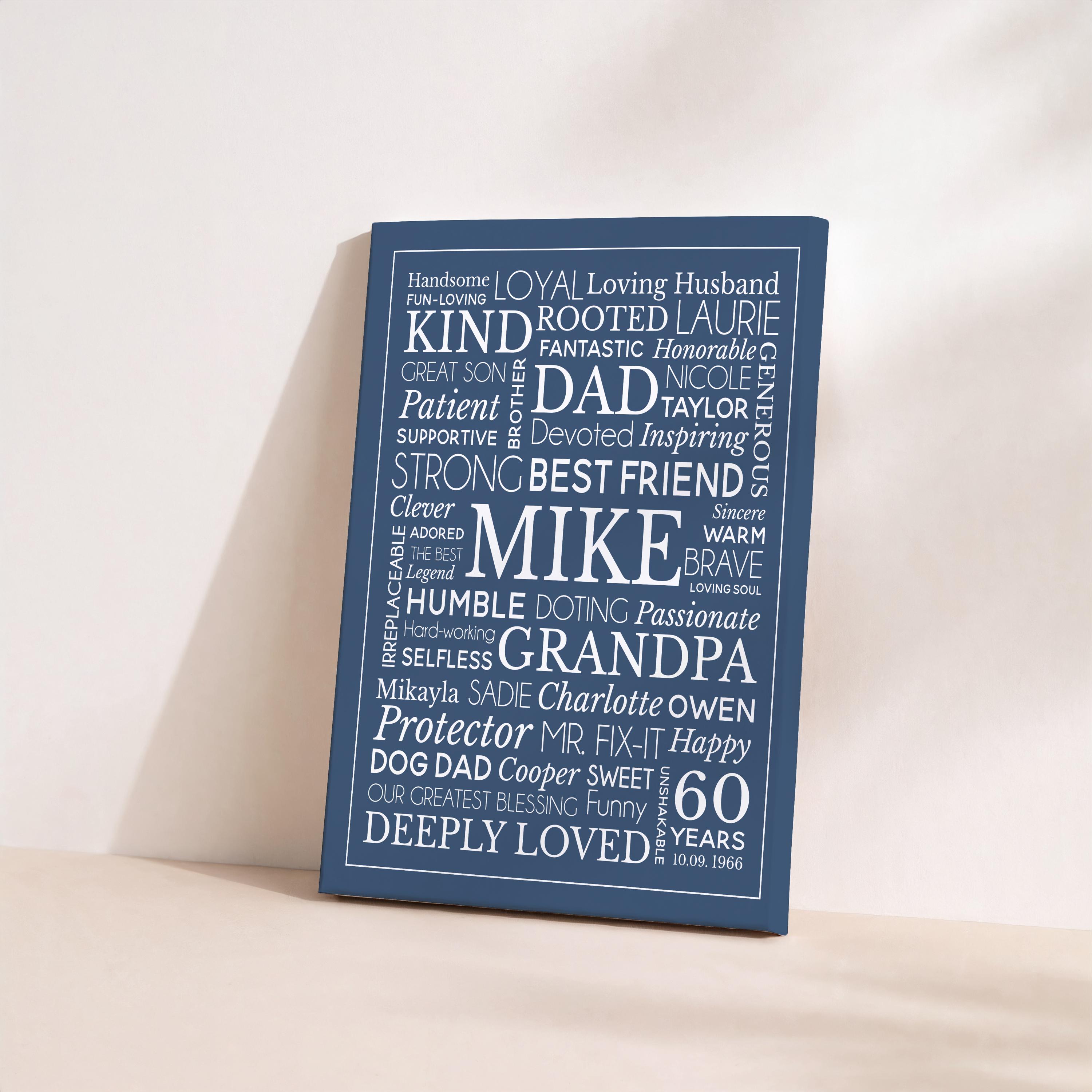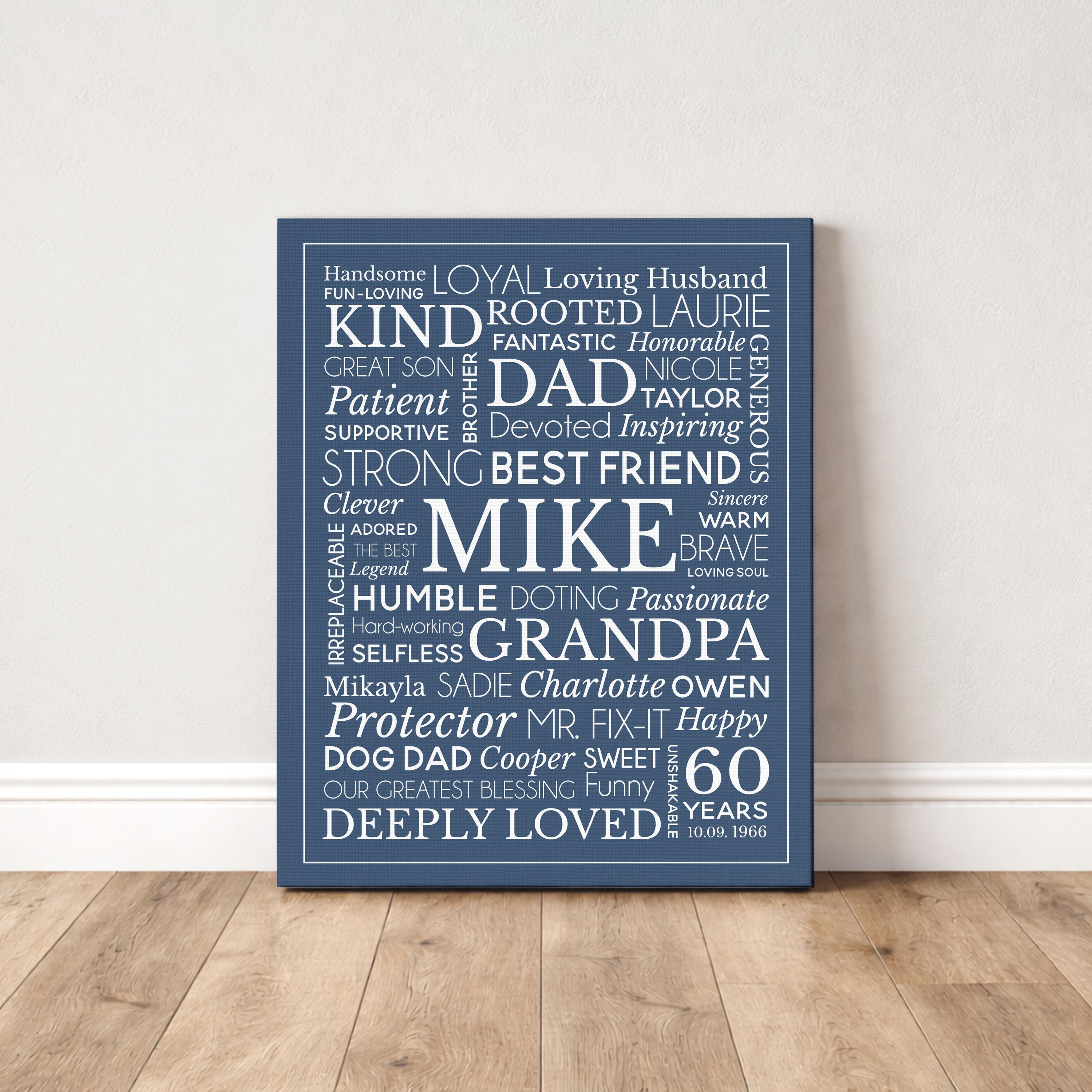 60th birthday gift. The perfect way to celebrate a Dad, Grandpa, Husband, or any special man in your life. This custom word cloud print with be personalized with a name, birthdate and heartfelt words of your choice.
