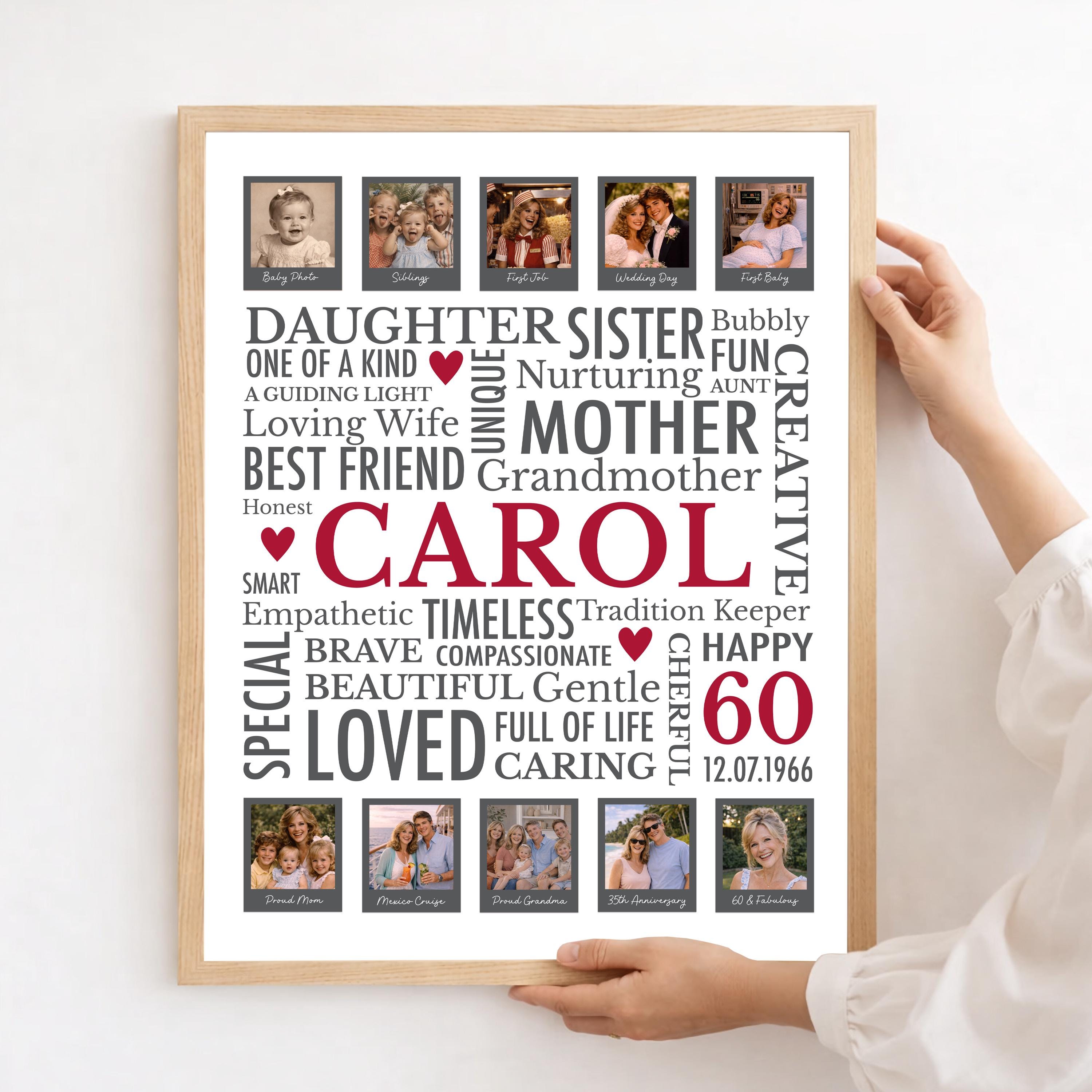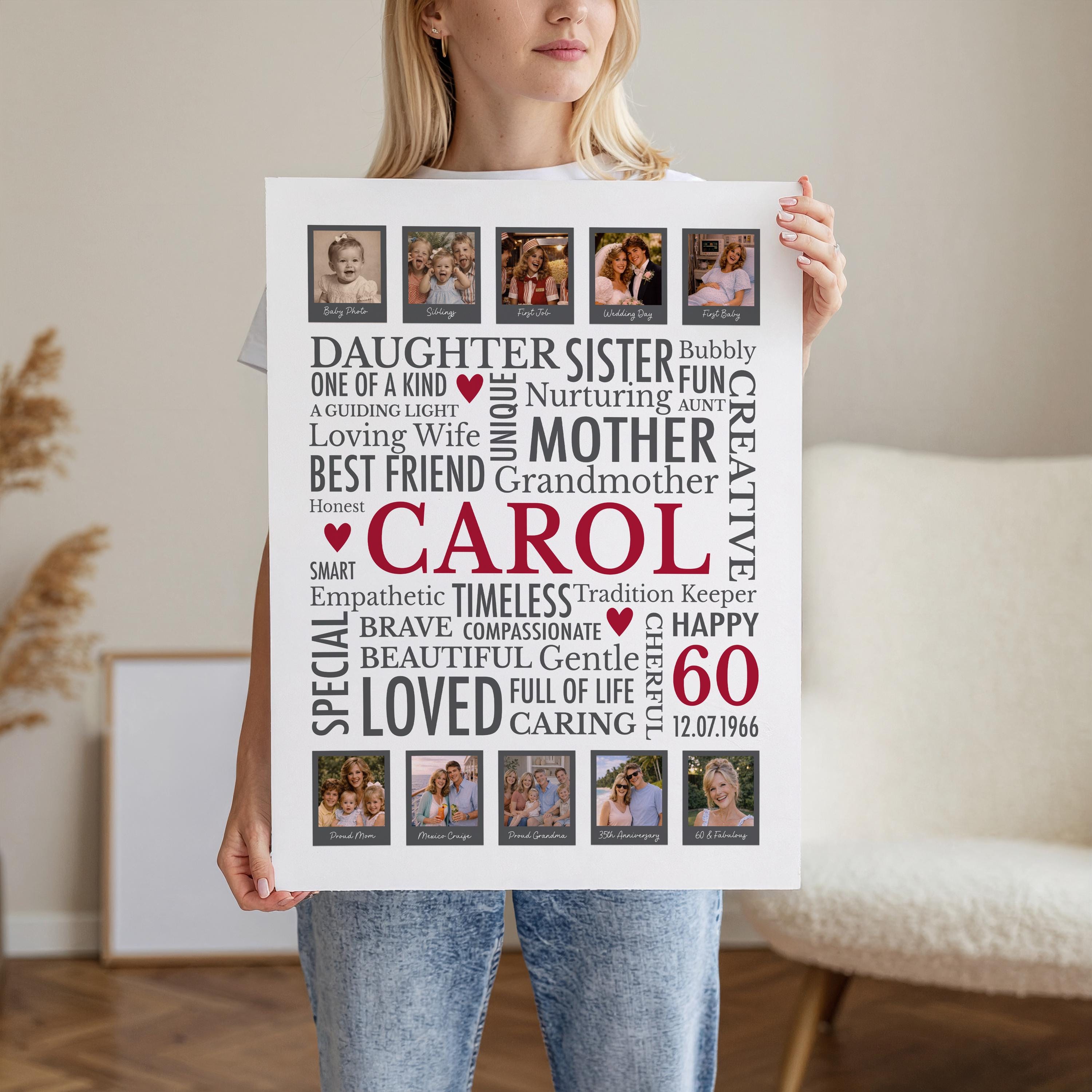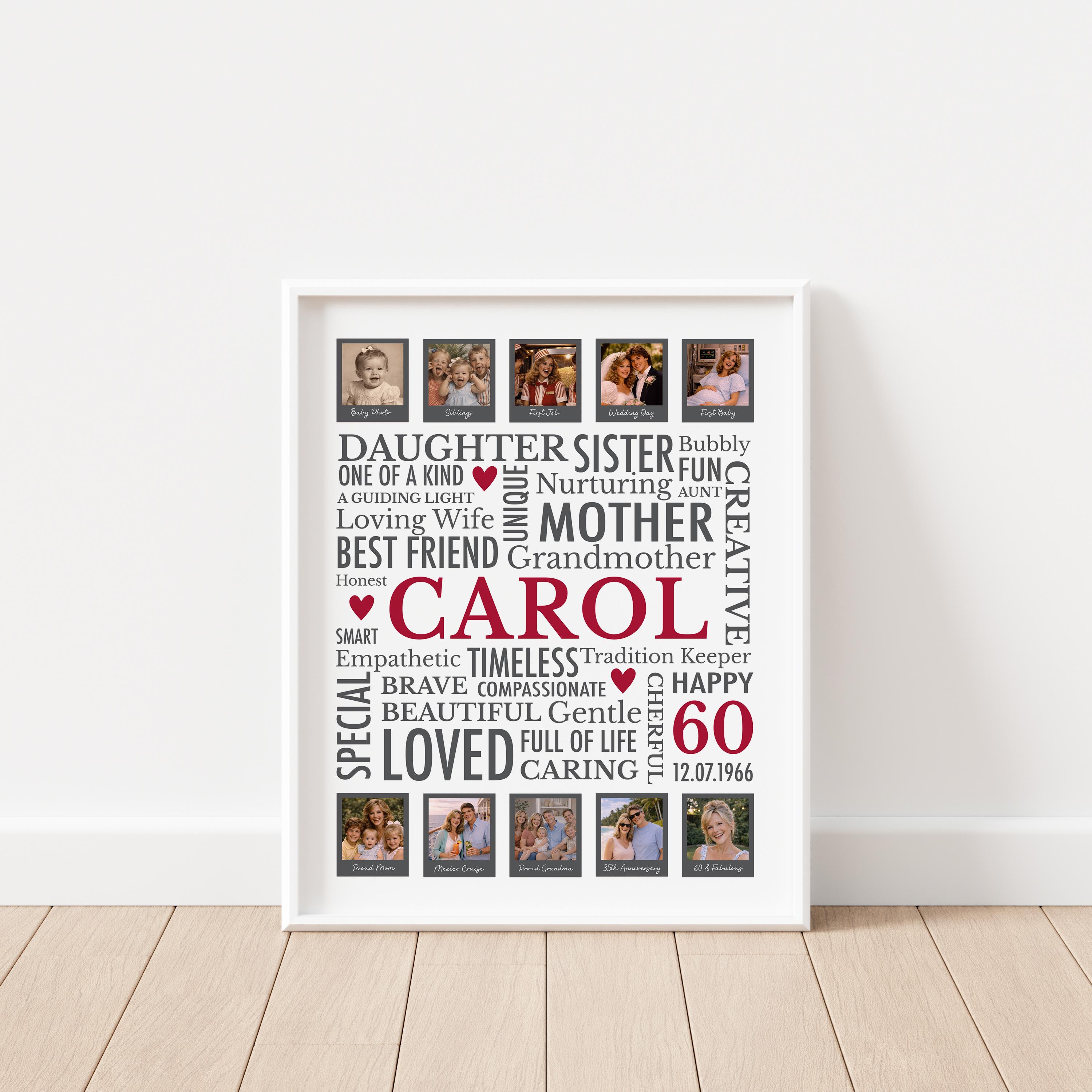 Birthday gift for Mom! This custom word cloud print with be personalized with a name, birthdate and heartfelt words of your choice. Also included are 10 special photos with captions.