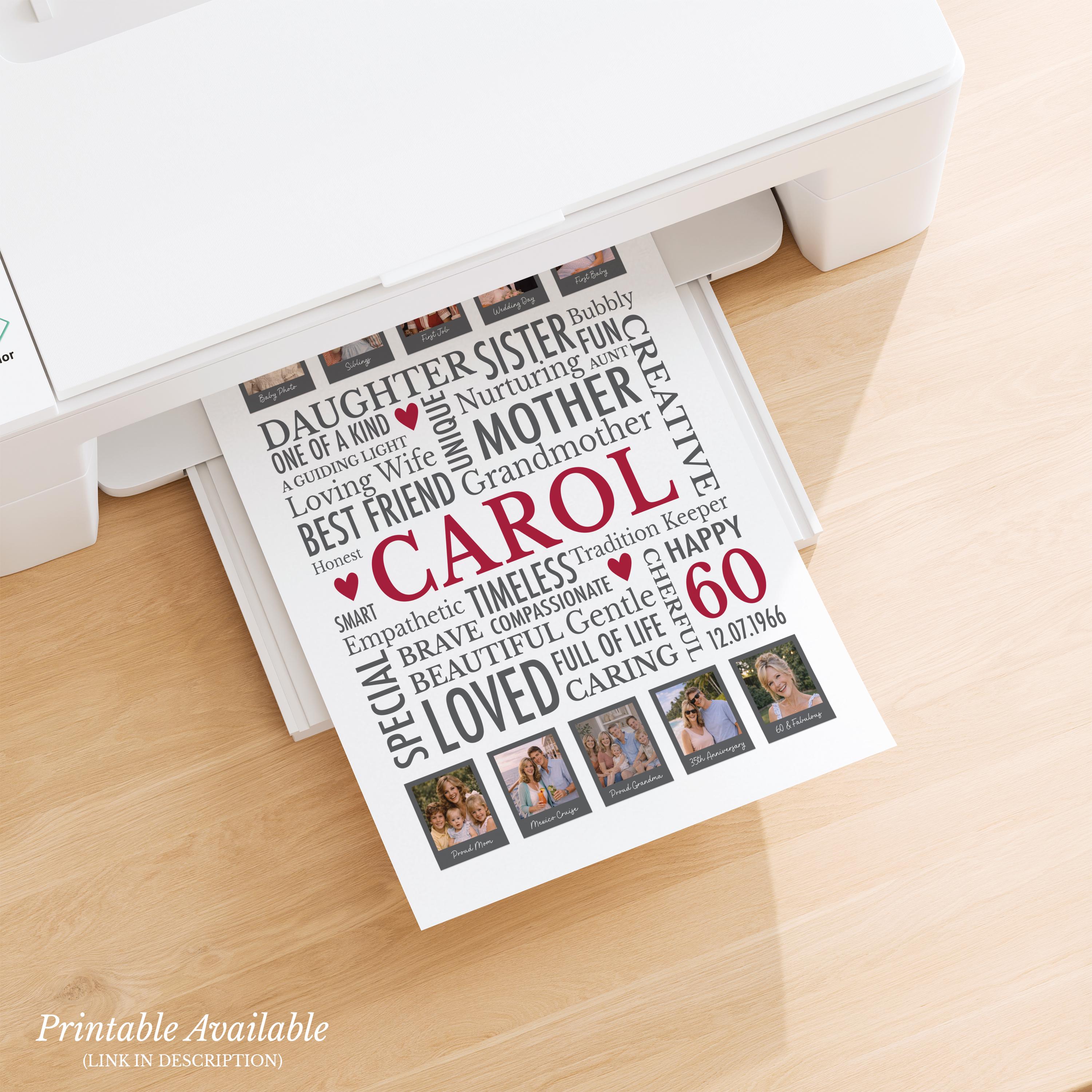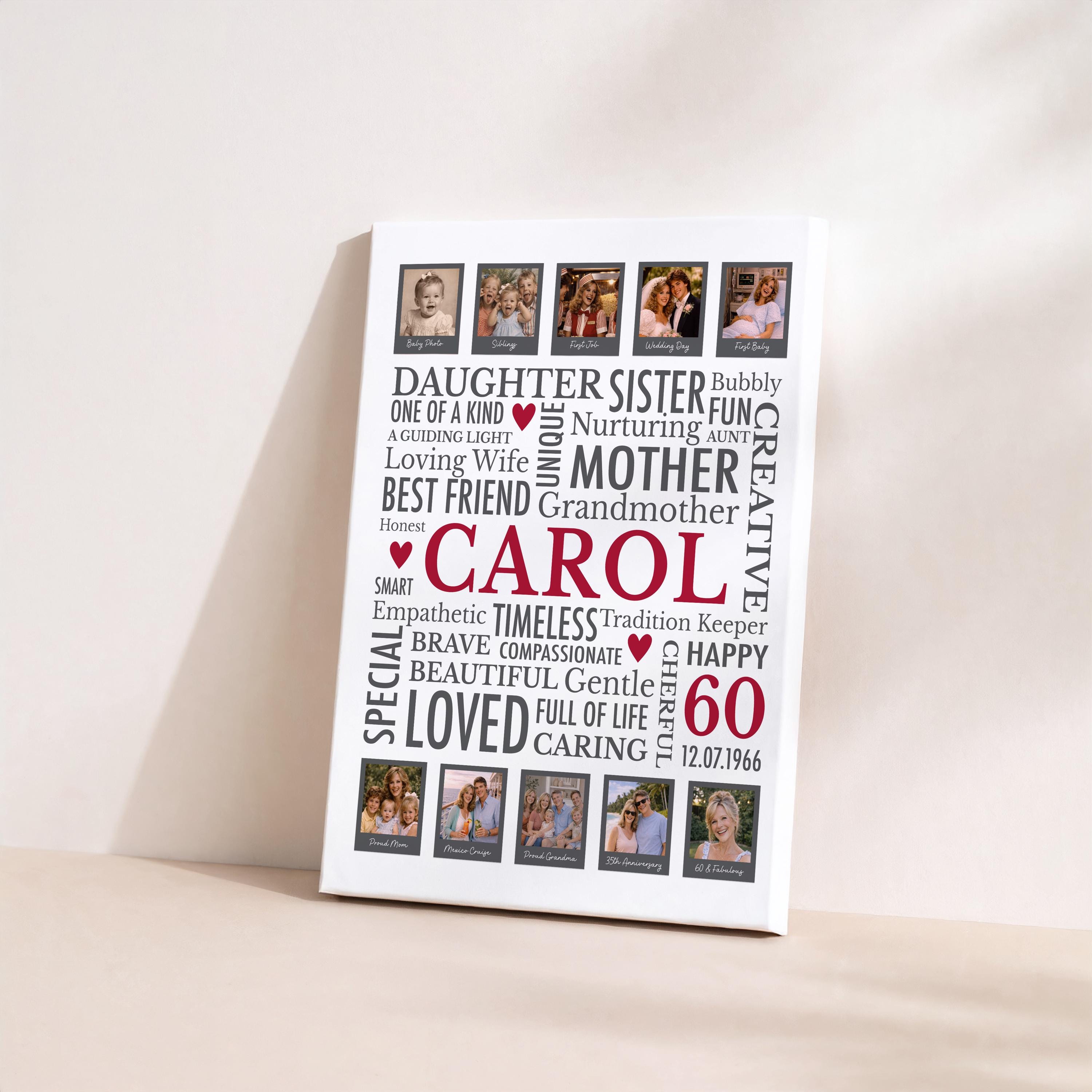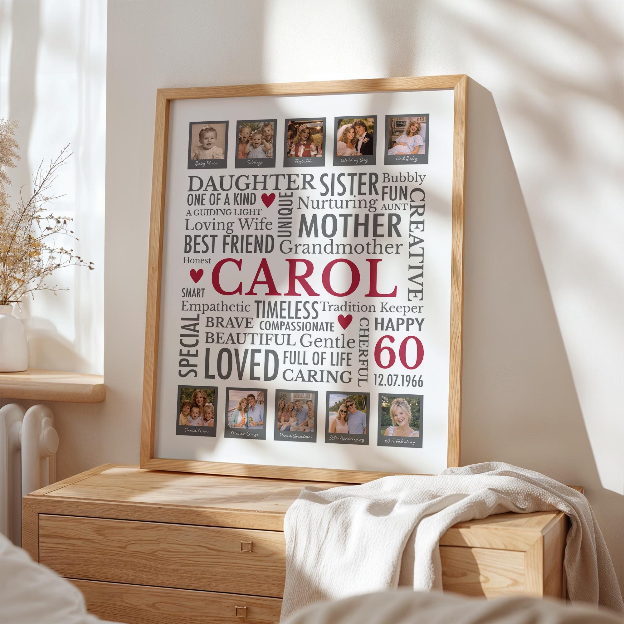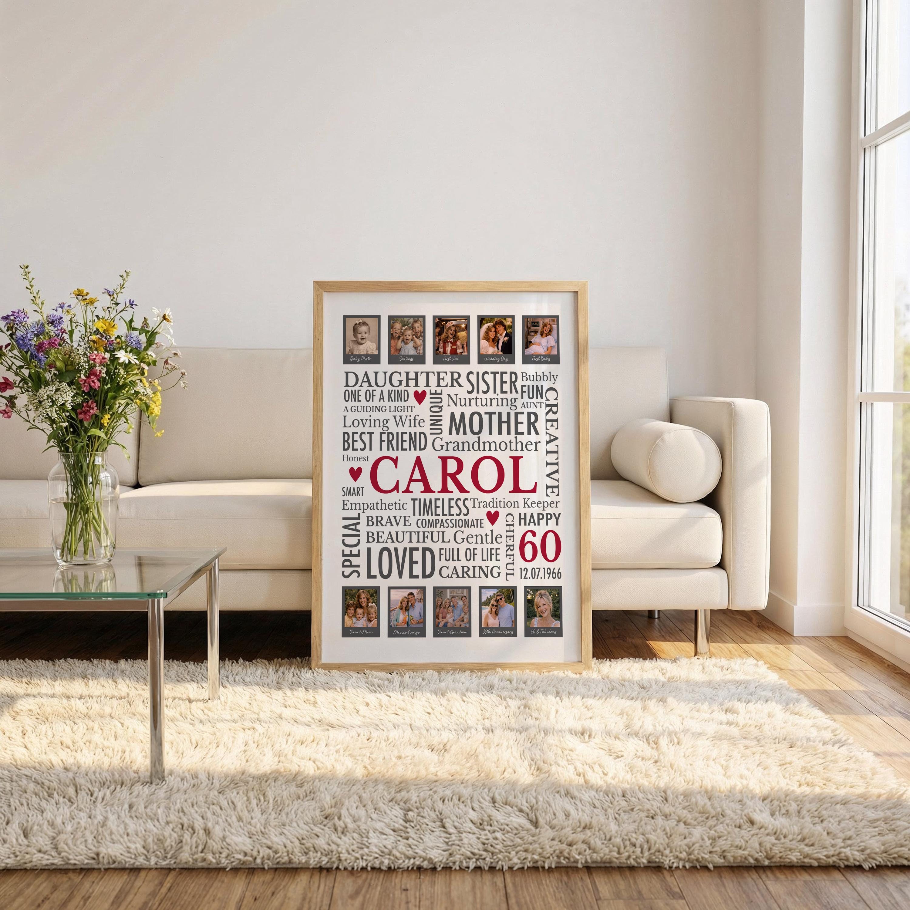 Birthday gift for Mom! This custom word cloud print with be personalized with a name, birthdate and heartfelt words of your choice. Also included are 10 special photos with captions.