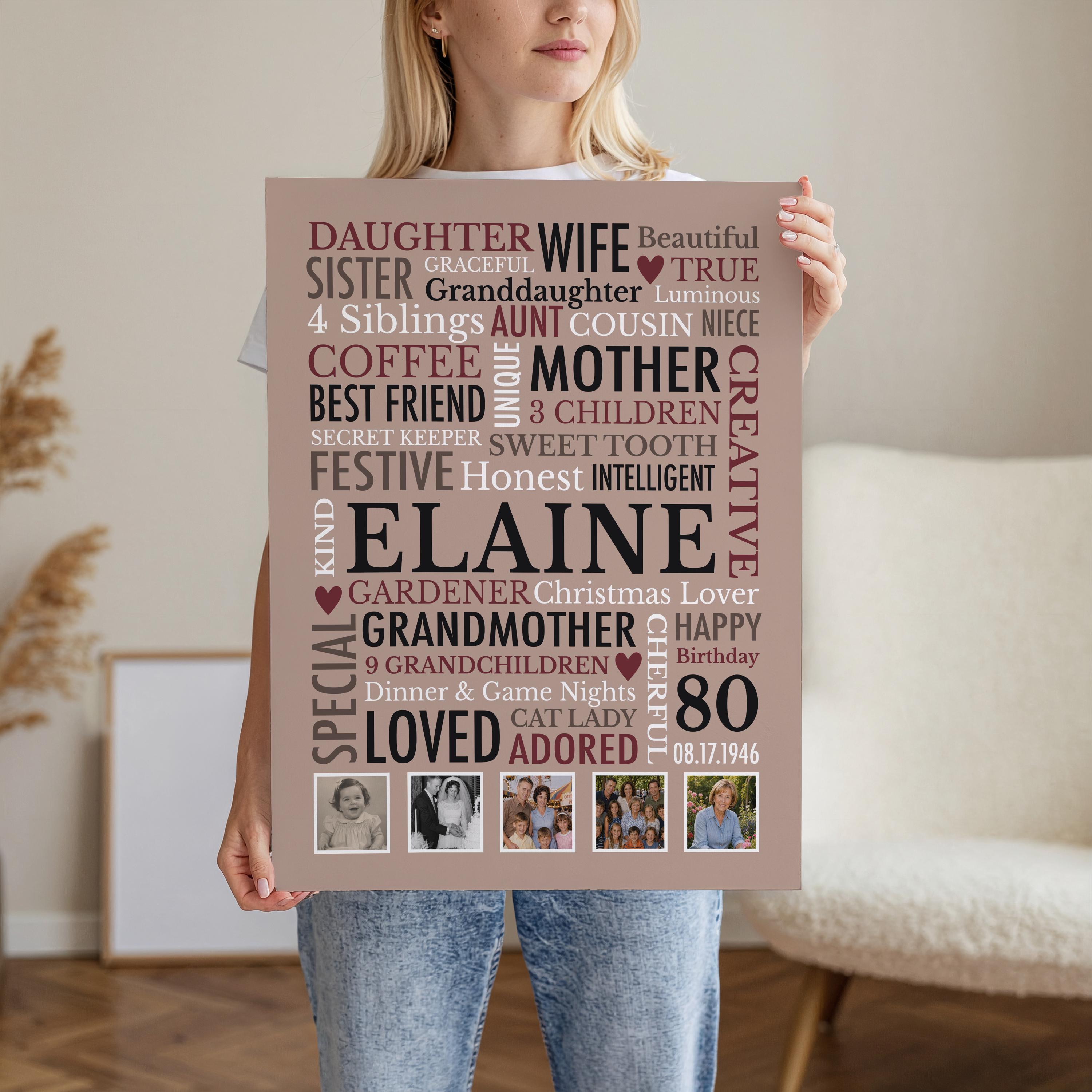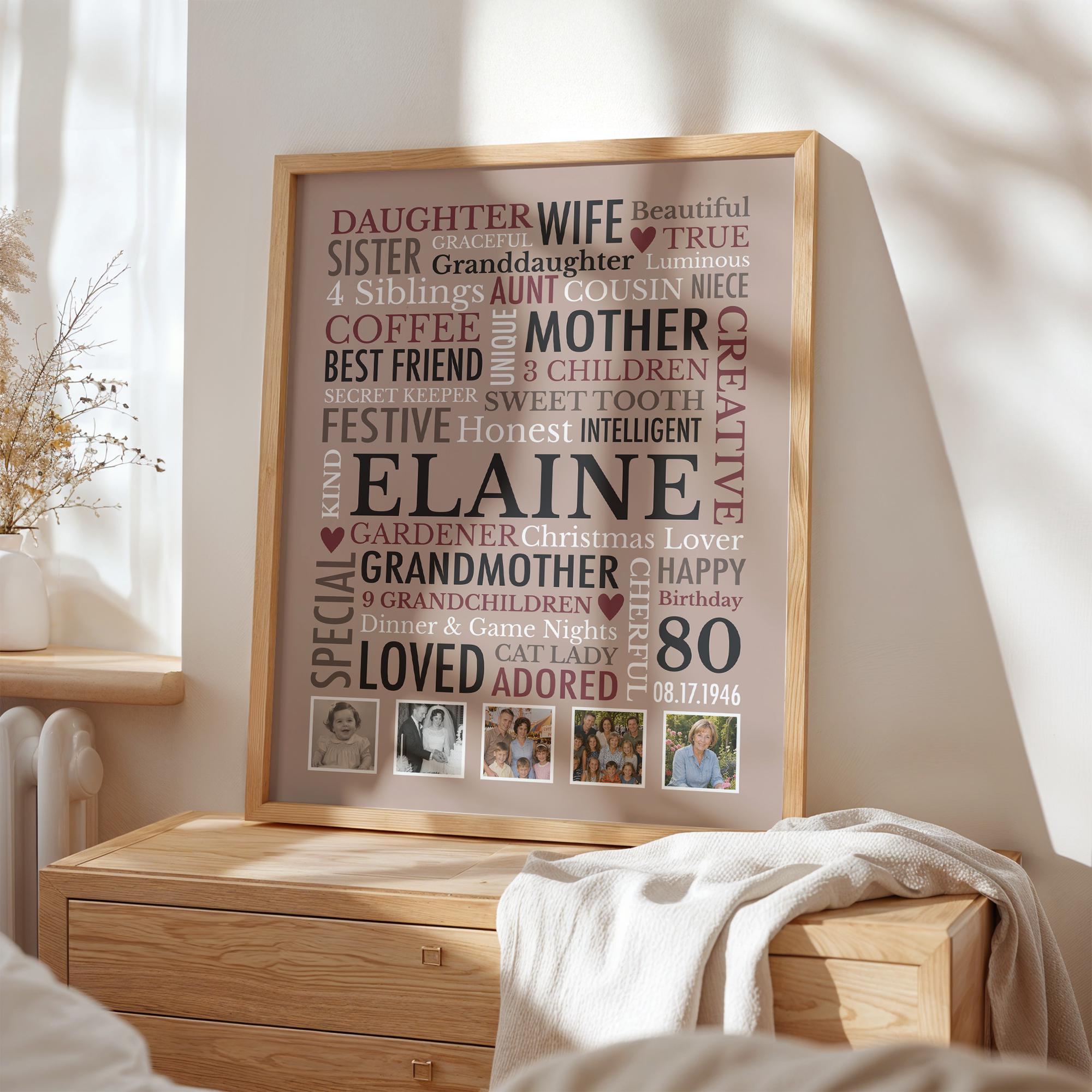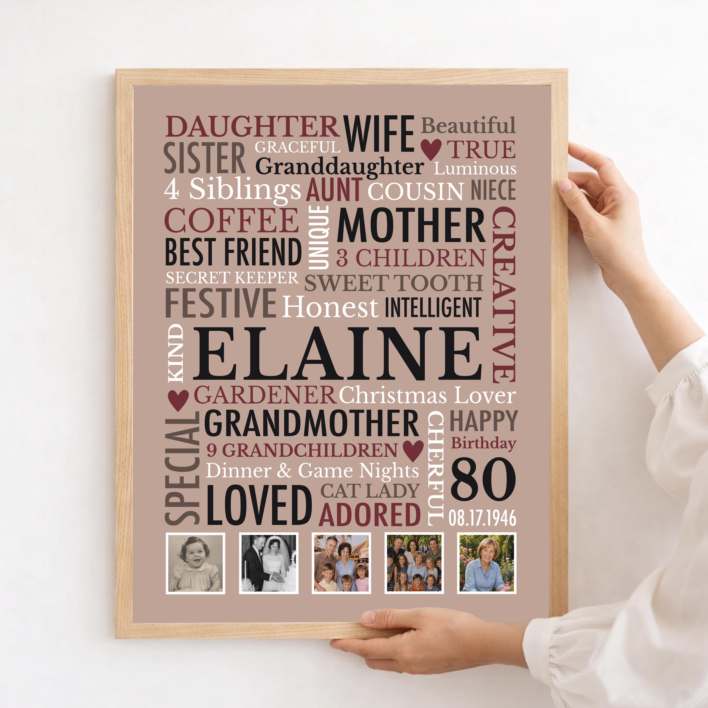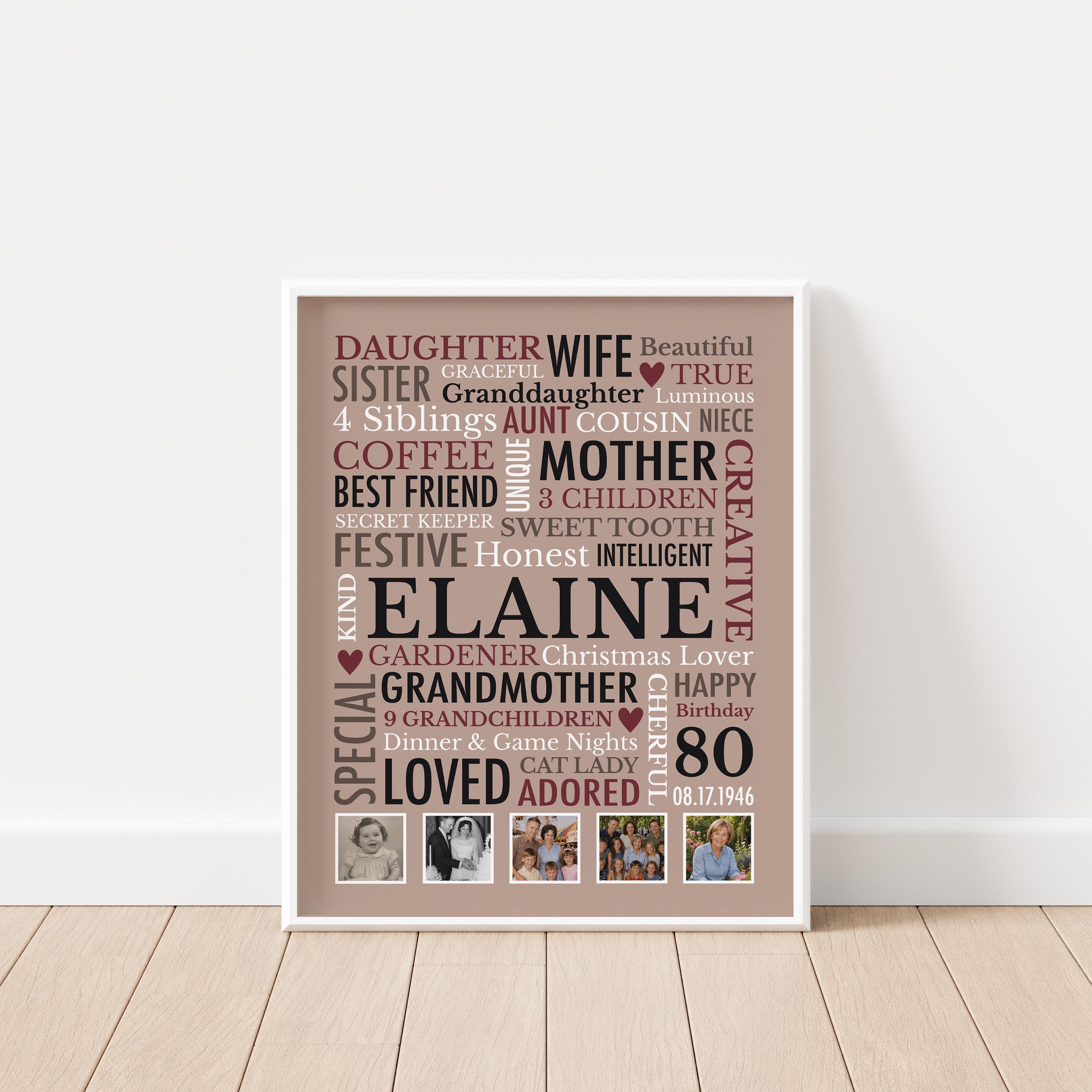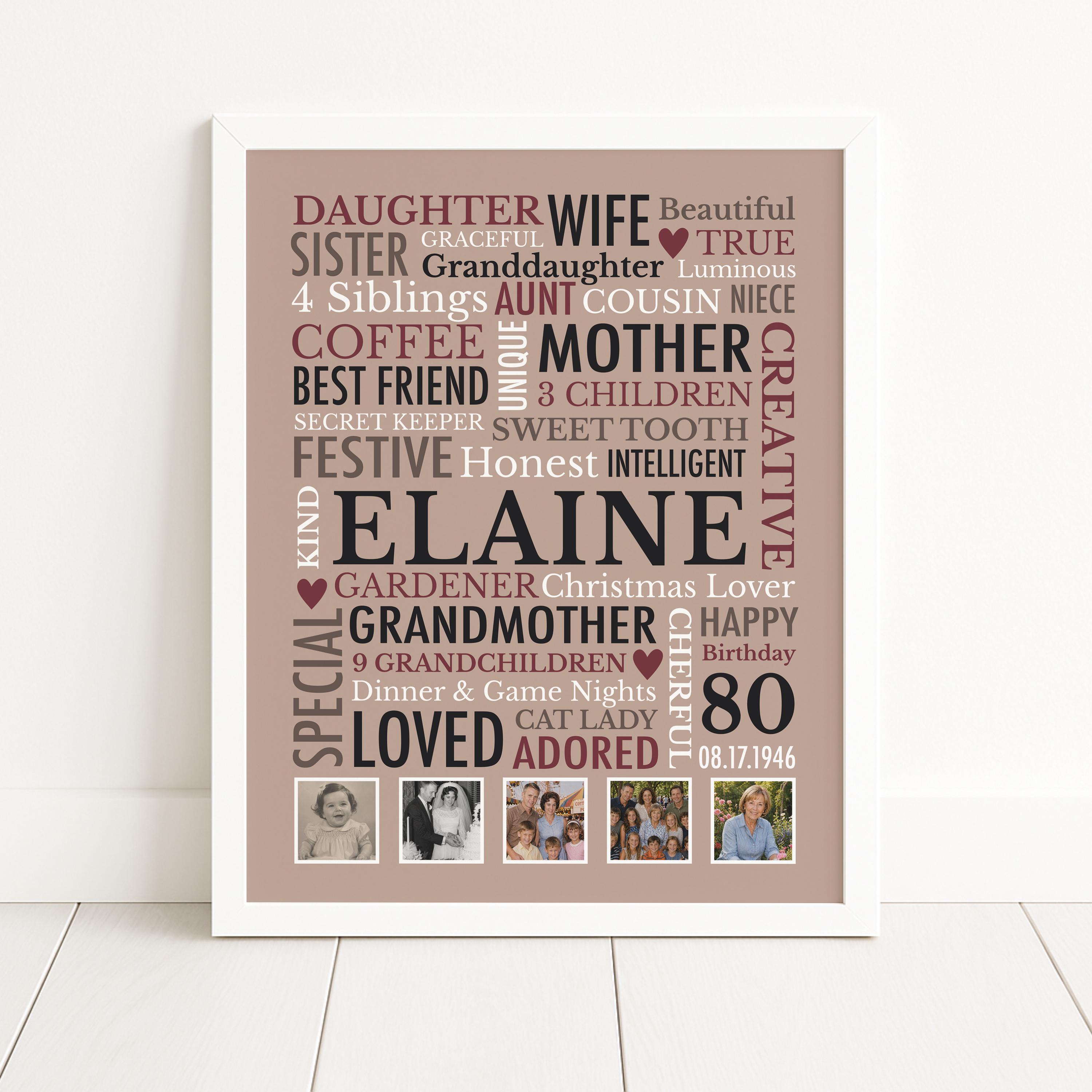 80th Birthday Gift for Woman! This custom word cloud print with be personalized with a name, birthdate and heartfelt words of your choice. Also included are 5 special photos.