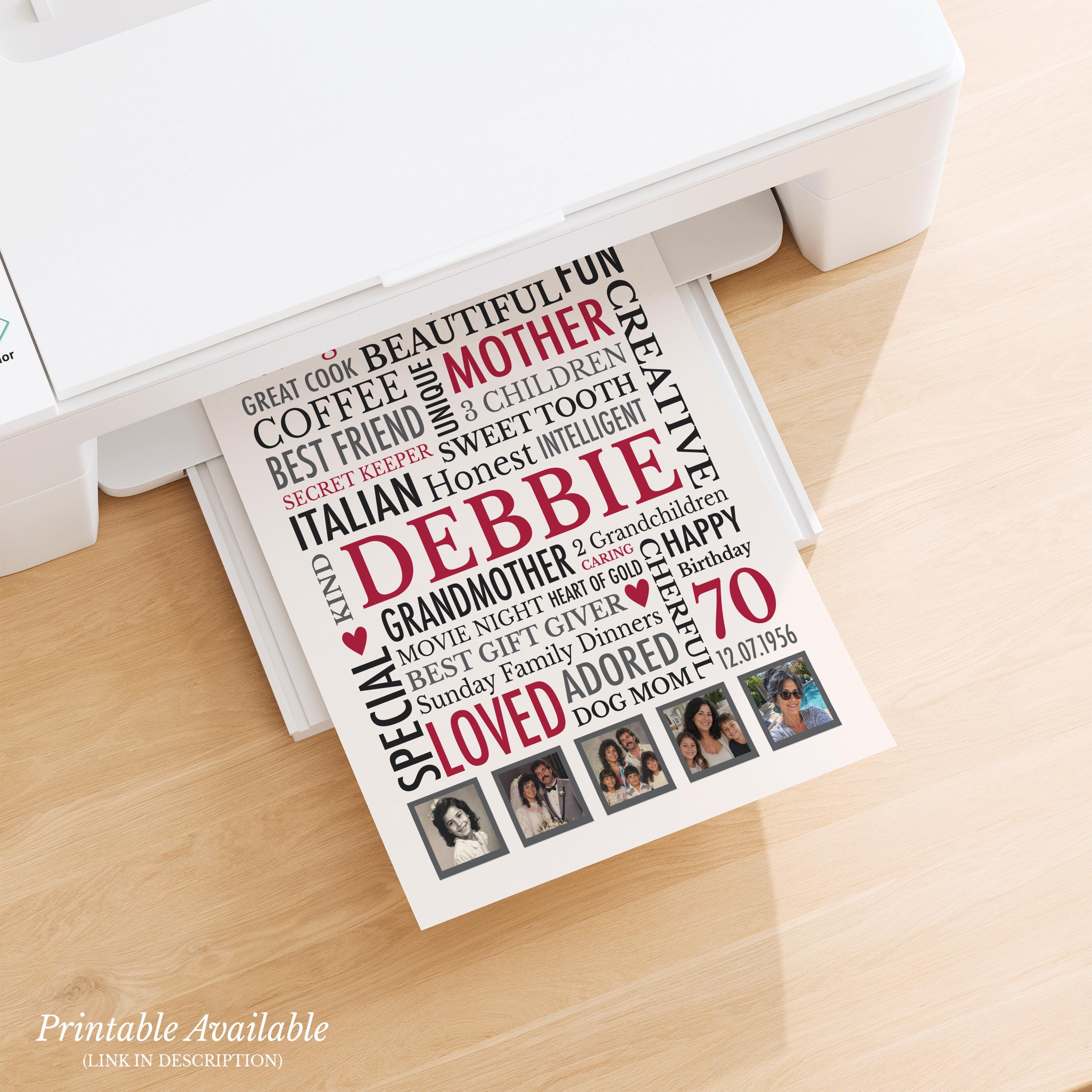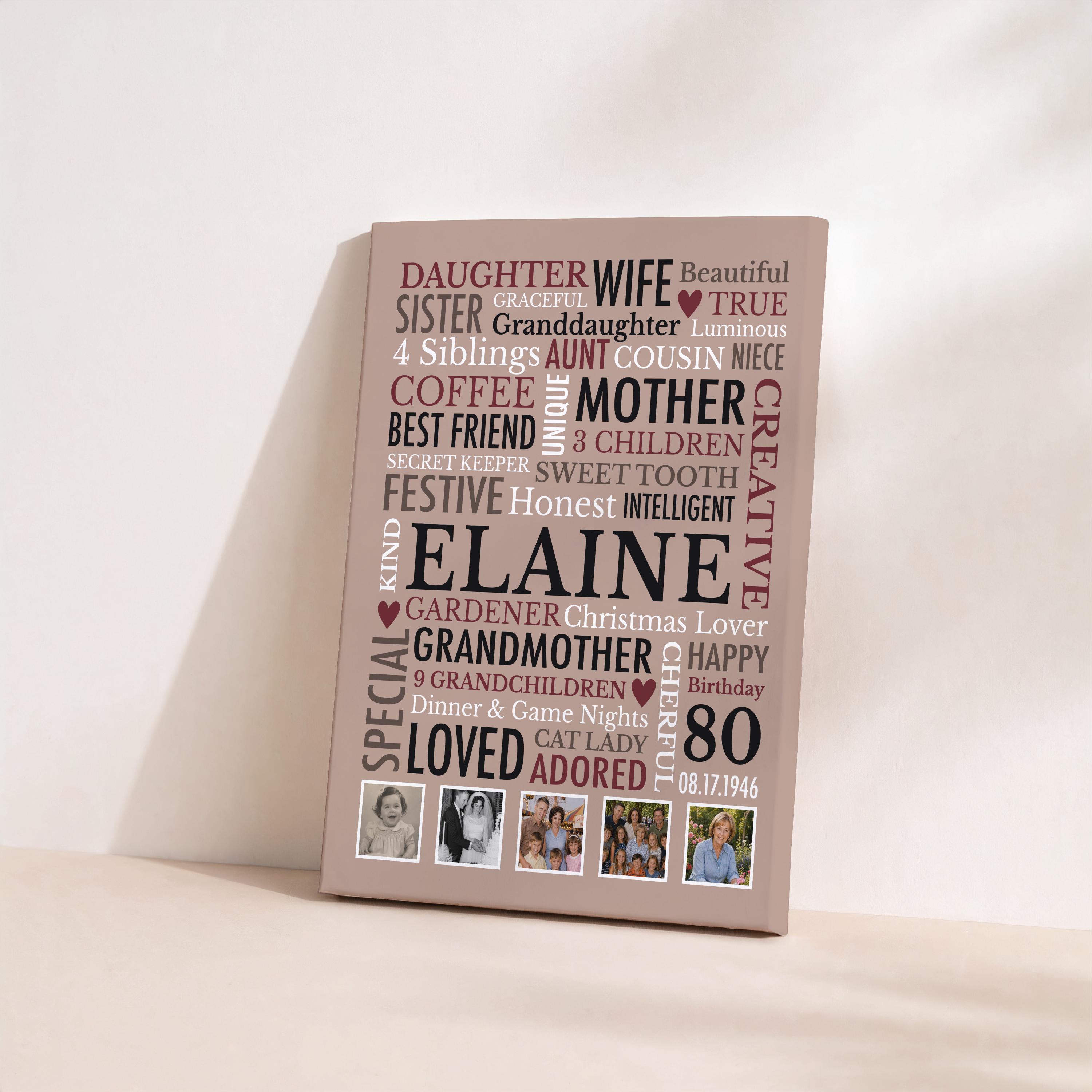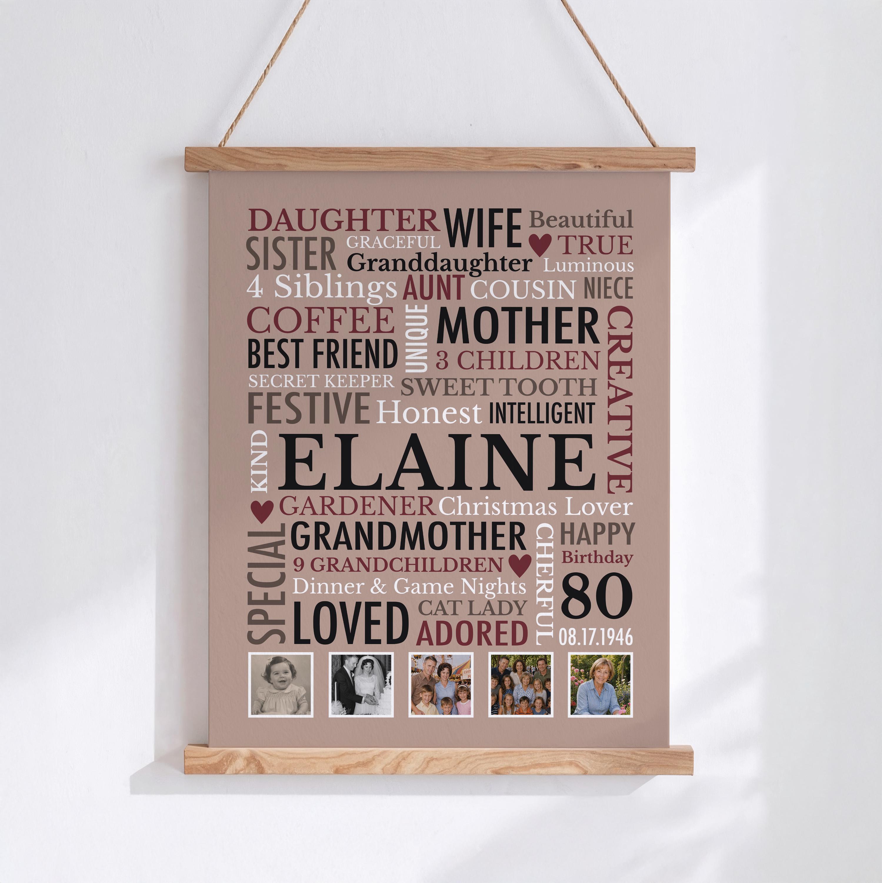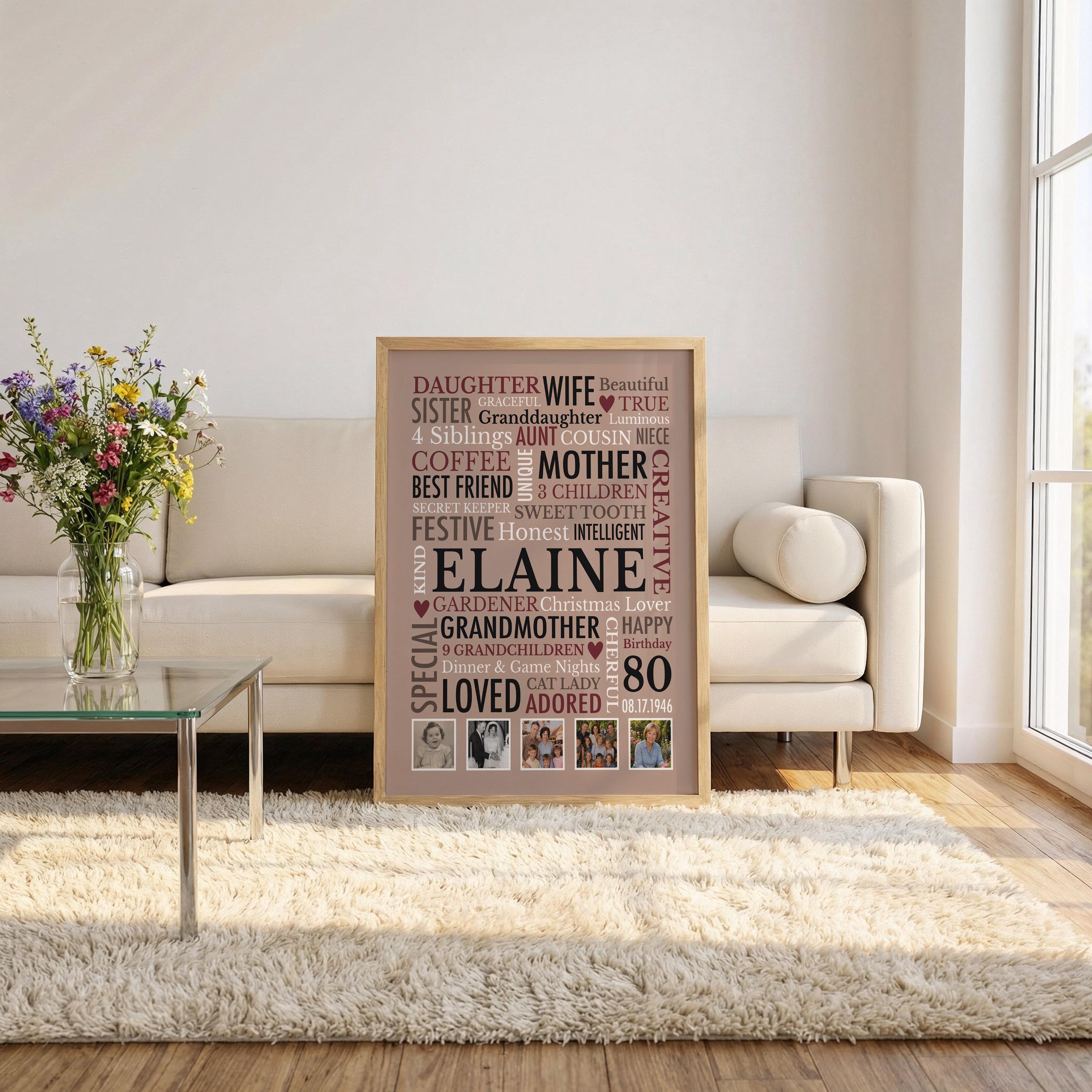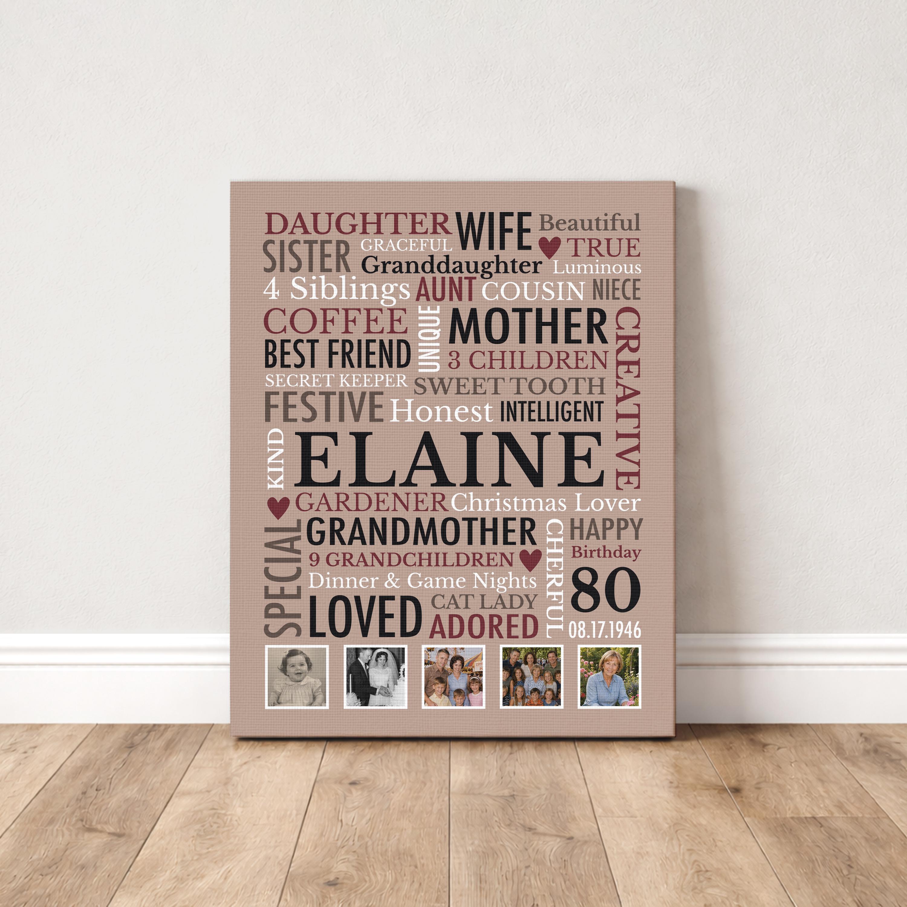 80th Birthday Gift for Woman! This custom word cloud print with be personalized with a name, birthdate and heartfelt words of your choice. Also included are 5 special photos.
